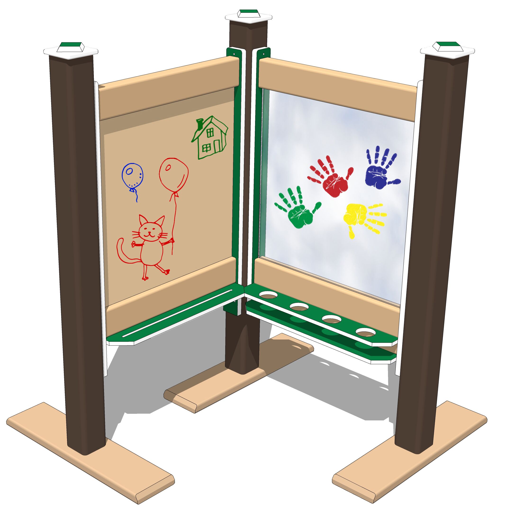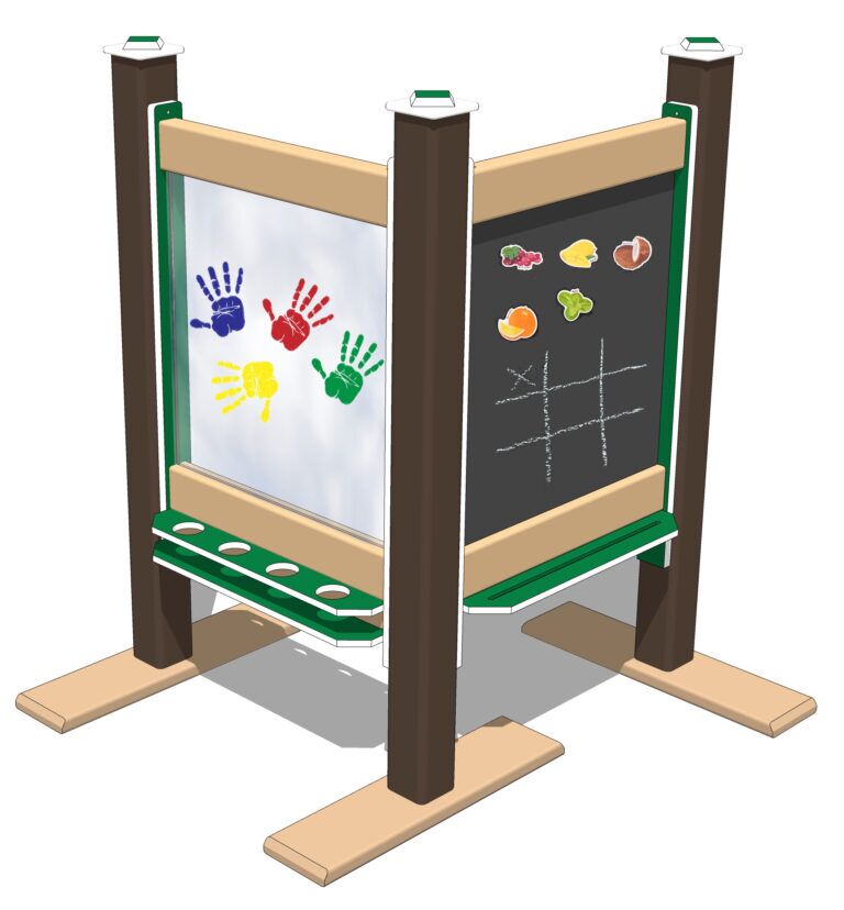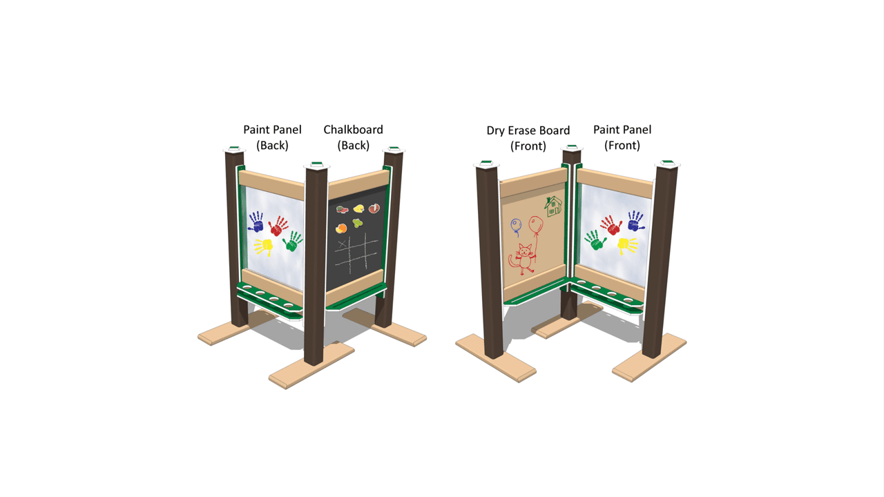 The chalkboard side is SureGrip™ coated steel, so it is magnetic, in addition to being an easy-to-chalk-on surface. The dry erase board on the reverse side is gloss coated steel. Besides being very vandal resistant, they can be cleaned easily with just water. The paint panel side is tough polycarbonate, also easily washable. Trays on each side of the panels hold art supplies, brushes, chalk, etc.
