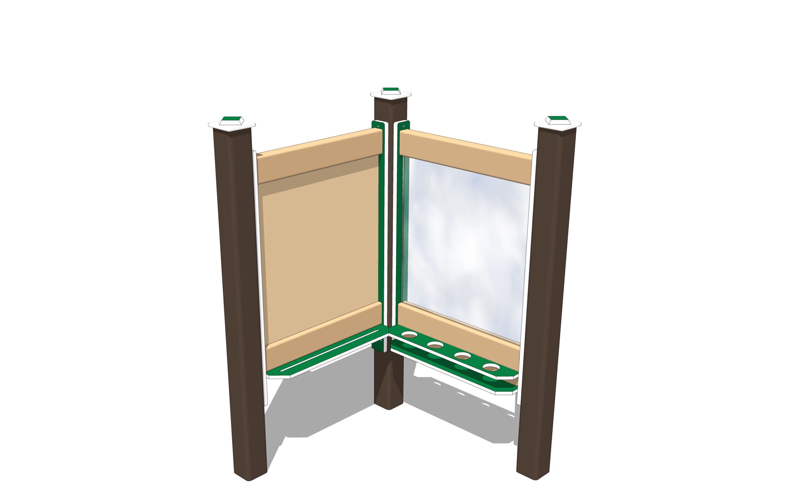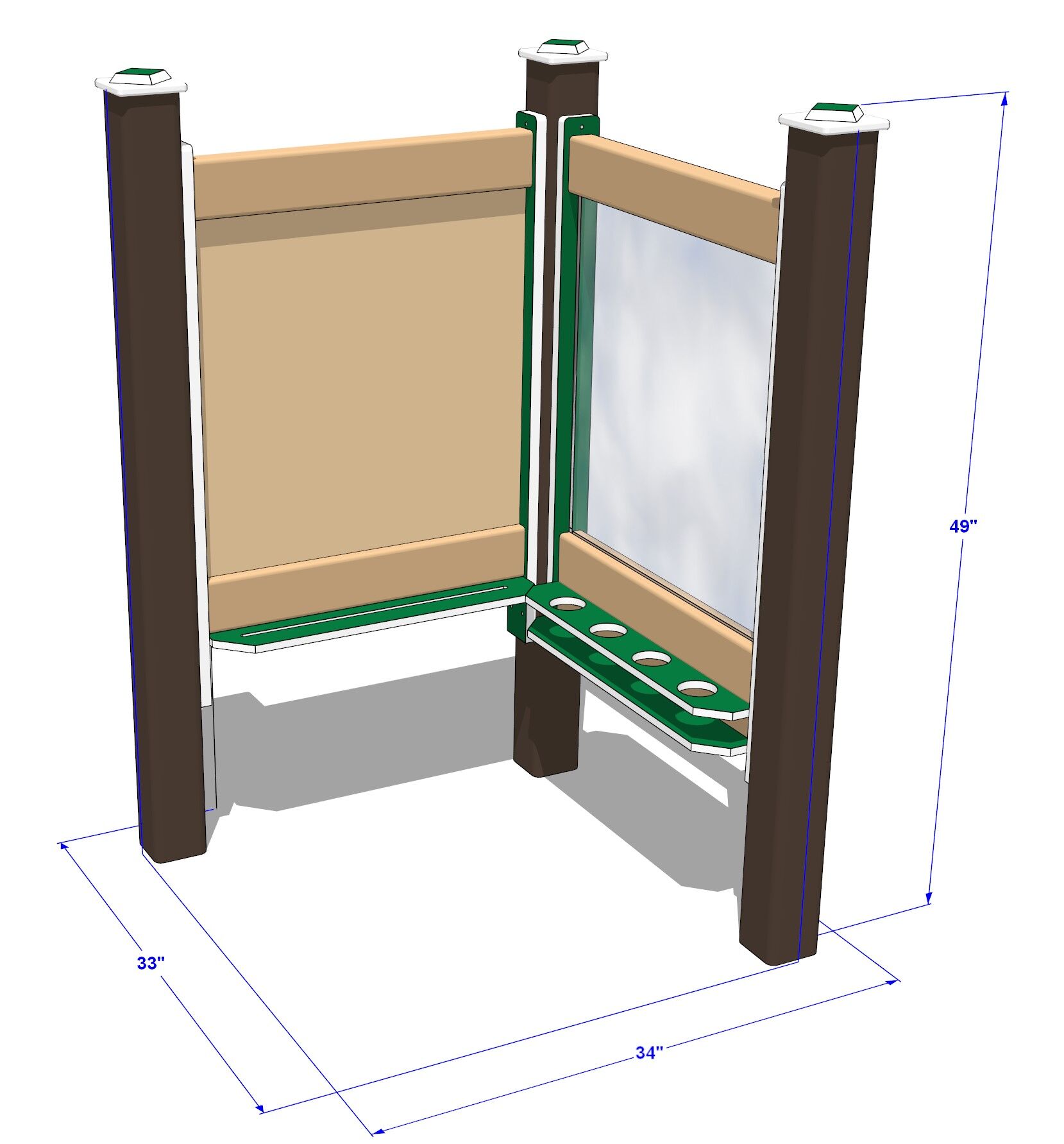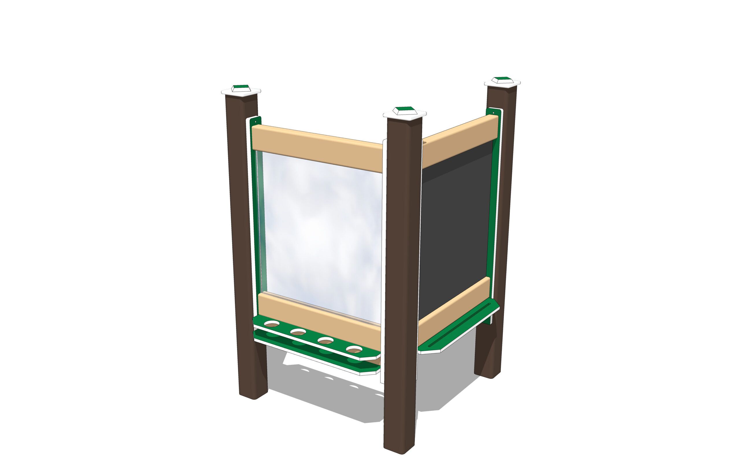 The chalkboard side is SureGrip™ coated steel, so it is magnetic, in addition to being an easy-to-chalk-on surface. The dry erase board on the reverse side is gloss coated steel. Besides being very vandal resistant, they can be cleaned easily with just water. The paint panel side is tough polycarbonate, also easily washable. Trays on each side of the panels hold art supplies, brushes, chalk, etc.