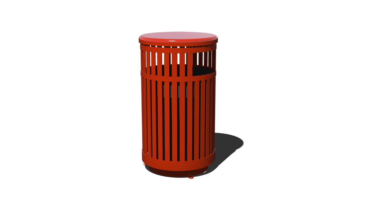 This modernly designed outdoor trash receptacle features vertically ribbed steel that is coated in your choice of textured polyethylene color. The Vertical Strap Trash Receptacle is available in a 32-gallon option and includes the lid. In-ground and surface mounting kits are also available but sold separately.