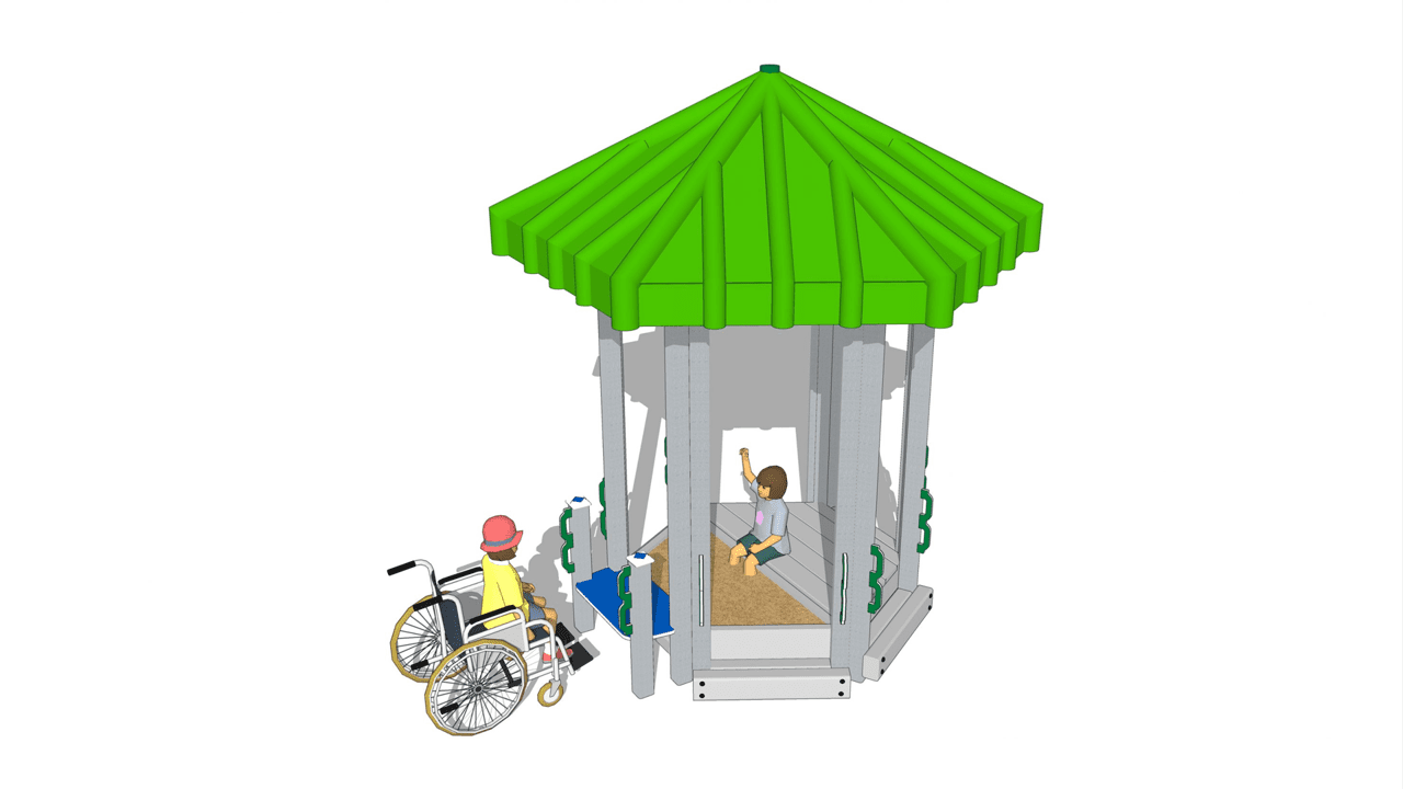 Our ADA Sand Deck is a great spot for quiet outdoor play. Half sandbox half deck, children can create a sandy construction site or share a picnic lunch on the deck. Our Hex roof provides 63 square feet of shaded comfort for both. This Sand Desk is a nice playground complement to our Sand Deck Kitchen. Ask us for ideas on how to customize your Hex set with modular pieces!