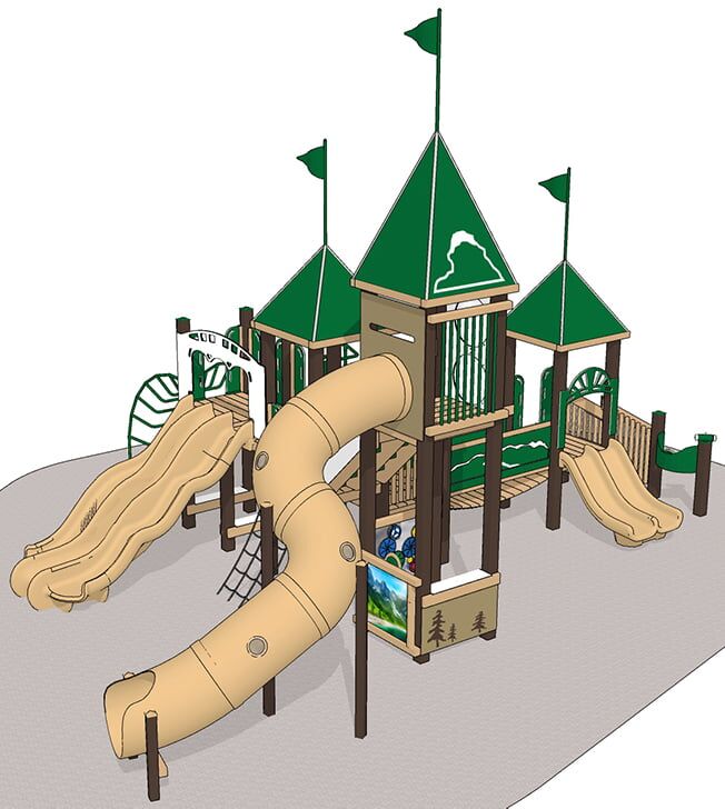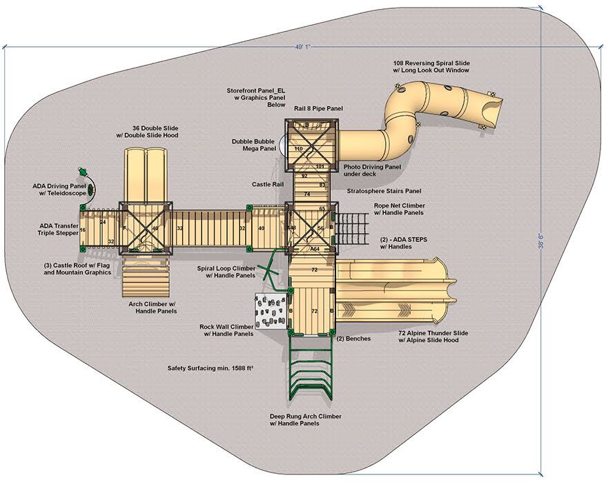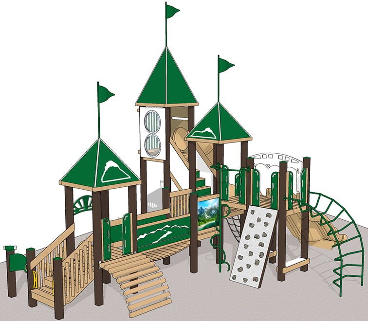 Let your kids take a trip to the Alps with this playground playset! Features include outdoor laminated photos of the majestic Alps mountain range, 9′ high Reversing Spiral Slide; Rock Climbers, Rope Net Climbers; 6′ Alpine Thunder slide; Spiral Loop Climber, 3 Castle Roofs with flags; Deep Rung Arch Climber; Clatter bridge.