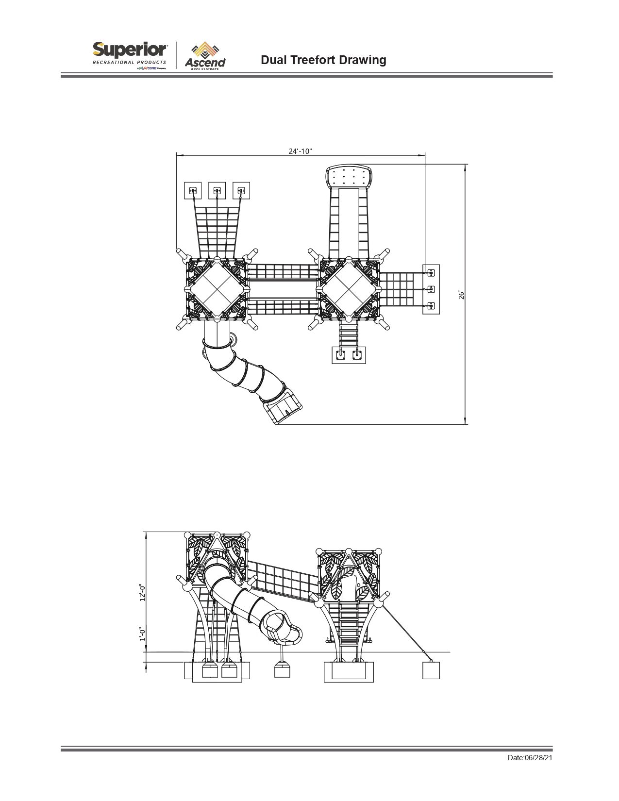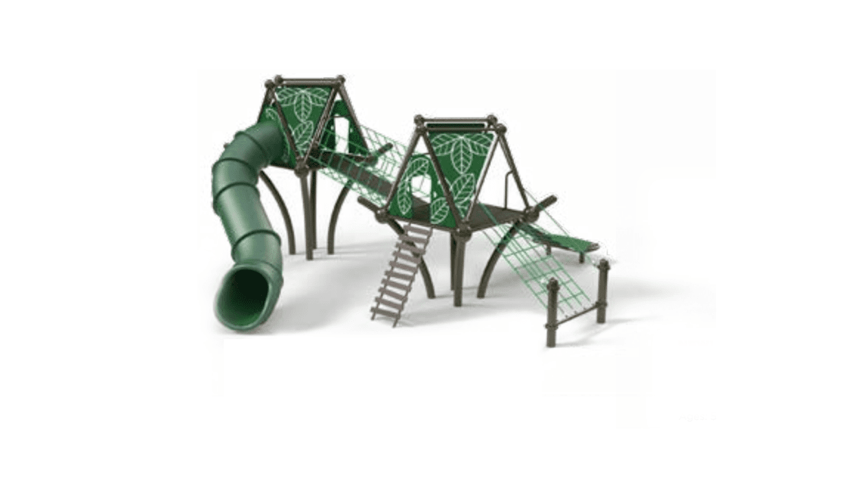 Our Ascend Dual Treefort makes a great addition to any park or playground area. With two decks, three climbers, and a slide, children will love exploring all the fun challenges this unit has to offer. It’s designed with leaf panels for a fun design element. Made from durable 20 mm rope and steel posts, this structure encourages social, physical, and cognitive skill development in children ages 5-12.