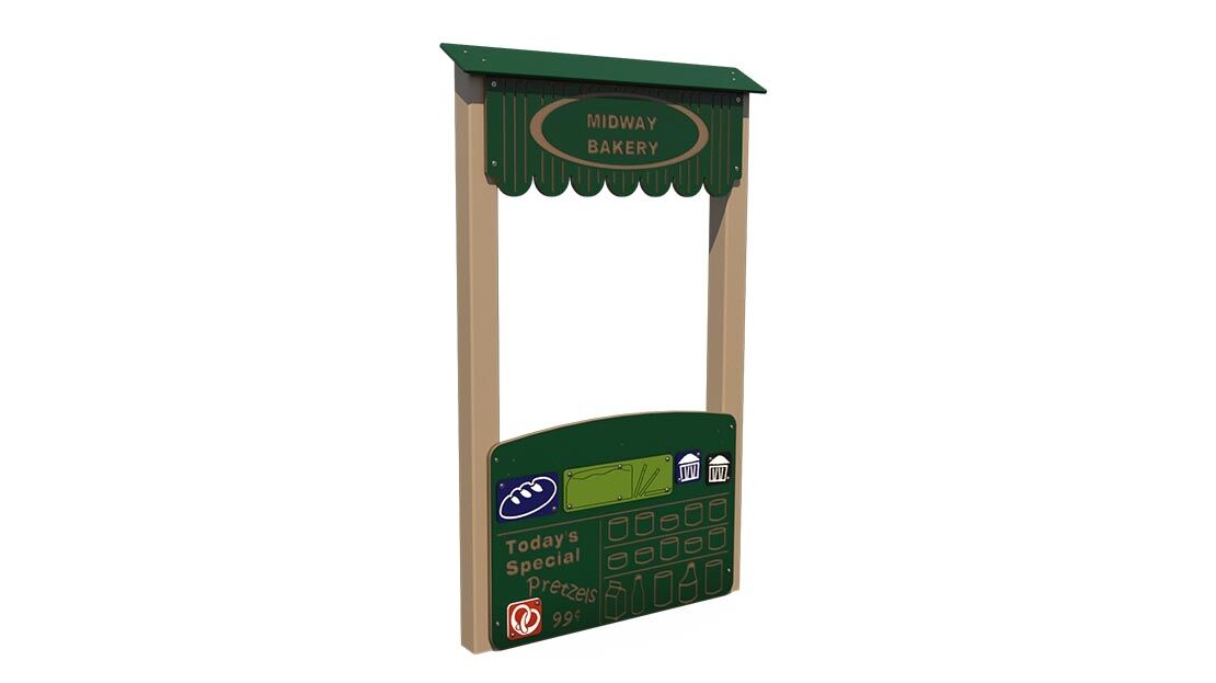 The bakery market stand is a free standing play component that allows children to interact together and participate in dramatic play. The structures dimensions are 3 ½ ‘ x 4” x 6 ½‘ making it perfect for small play areas.