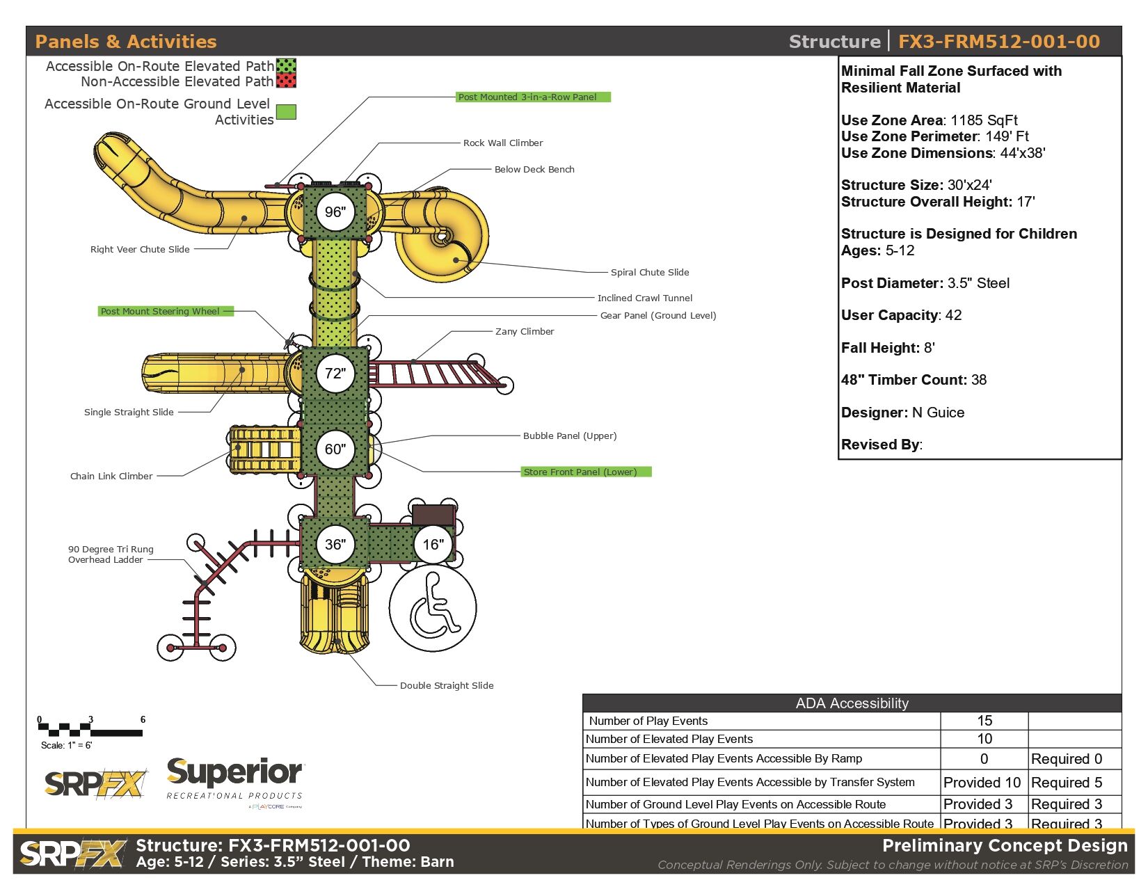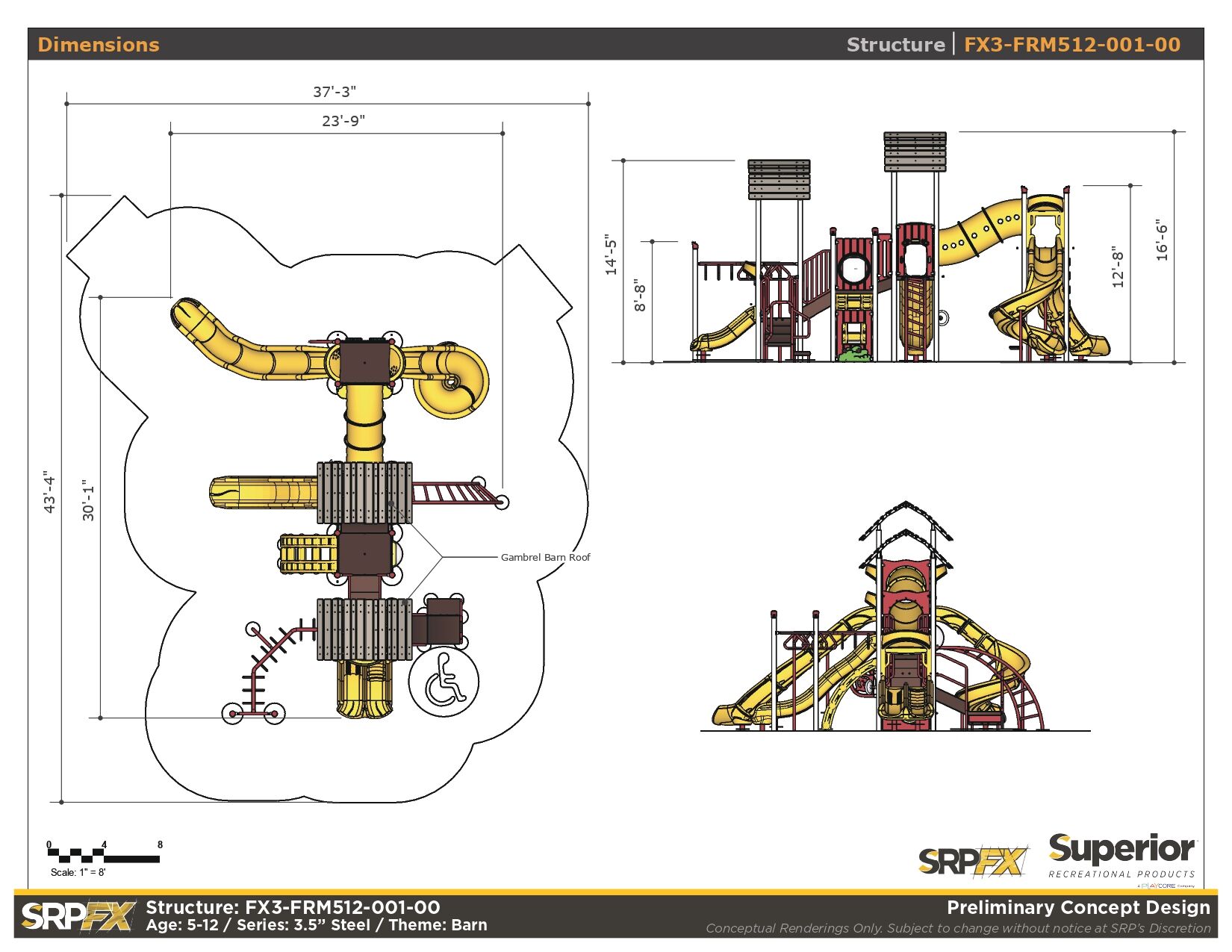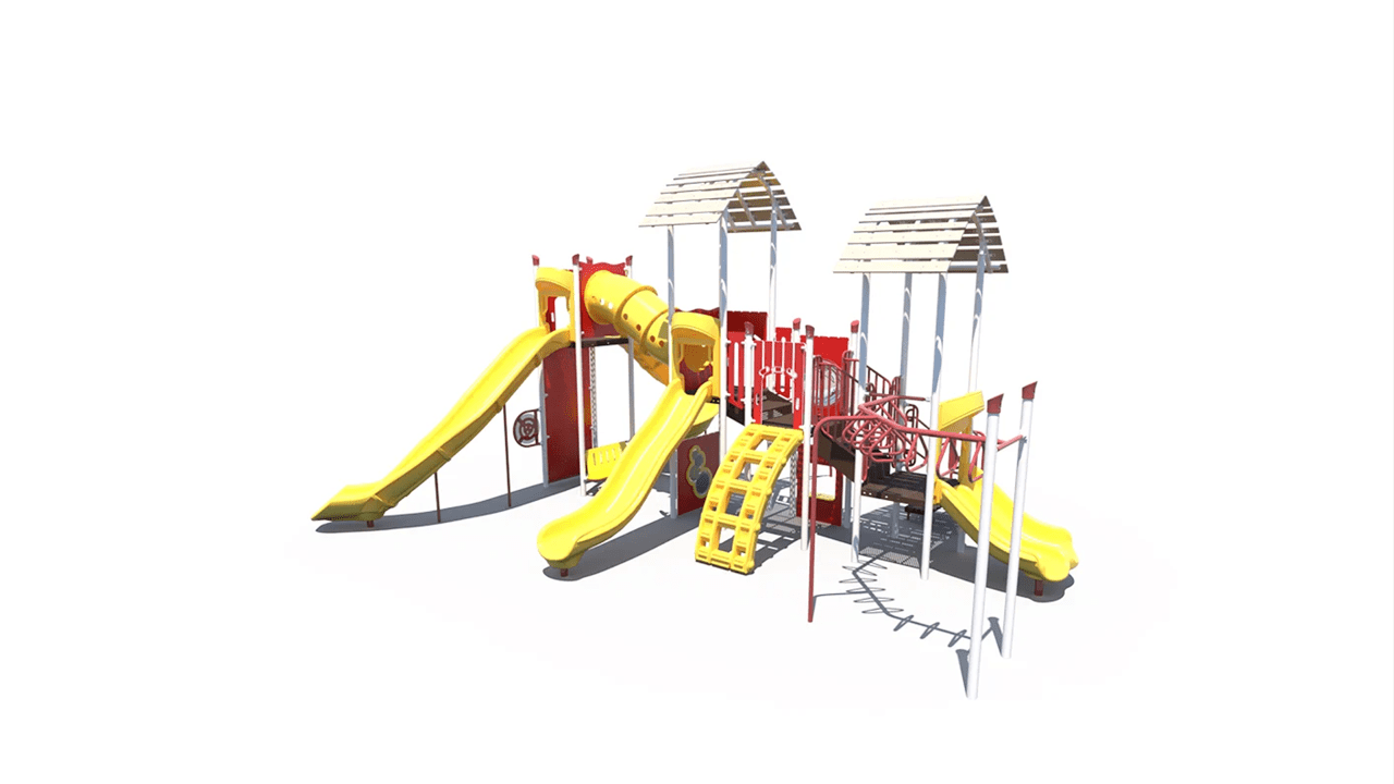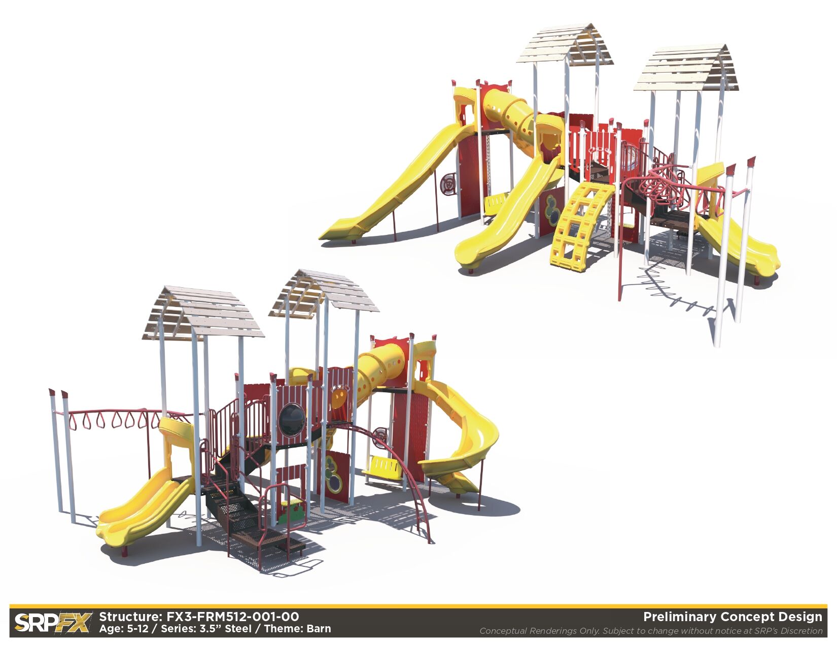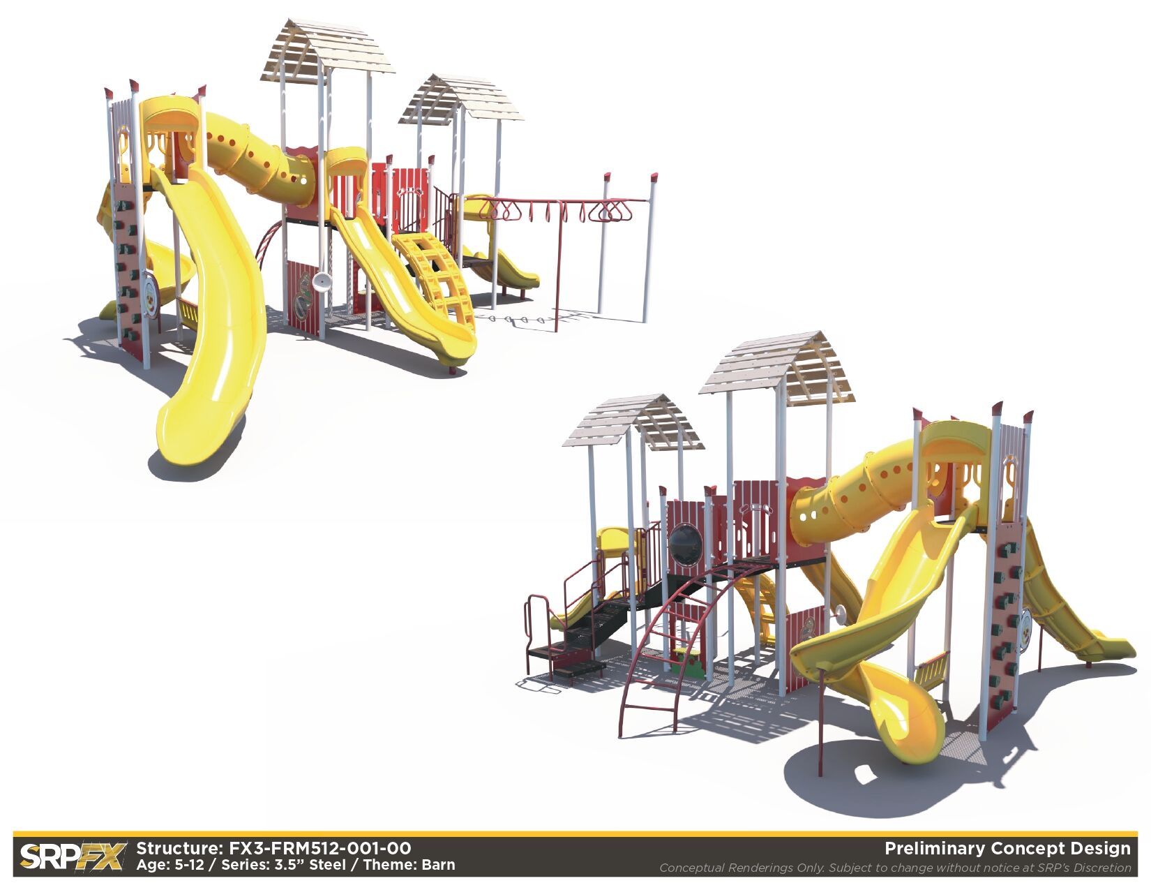 The FX3-FRM512-001 farm themed playground will add an iconic feature to your play space. This 3.5-inch post themed play structure adds great play value with its many slides, climbers, and panels. It’s designed for children ages 5-12.