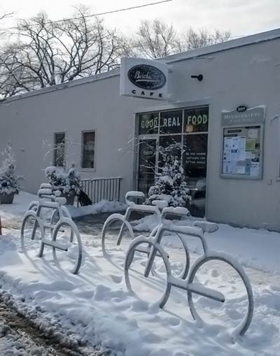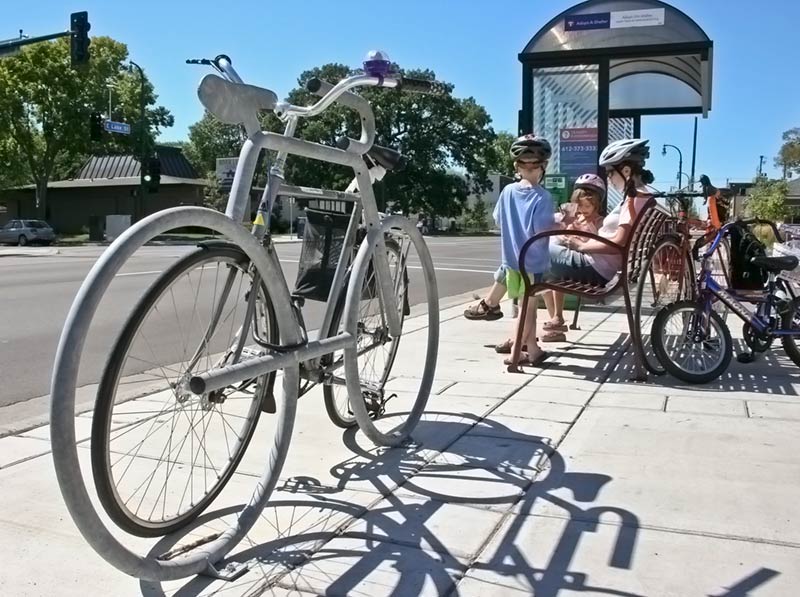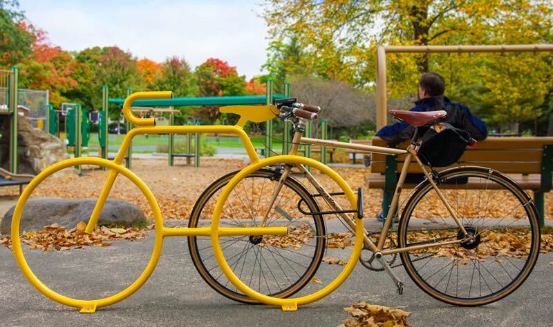 The Bike Bike Rack is an eye-catching, functional piece of street art. It welcomes people on bikes and provides them a secure, convenient place to park.