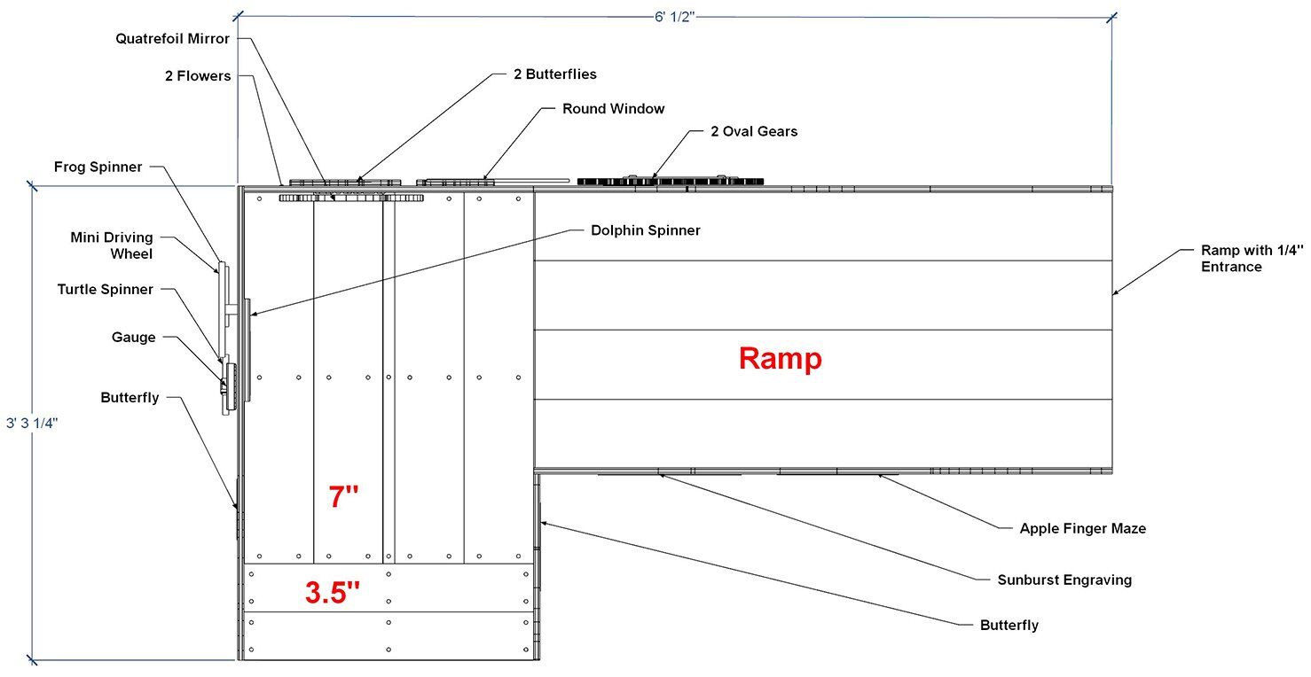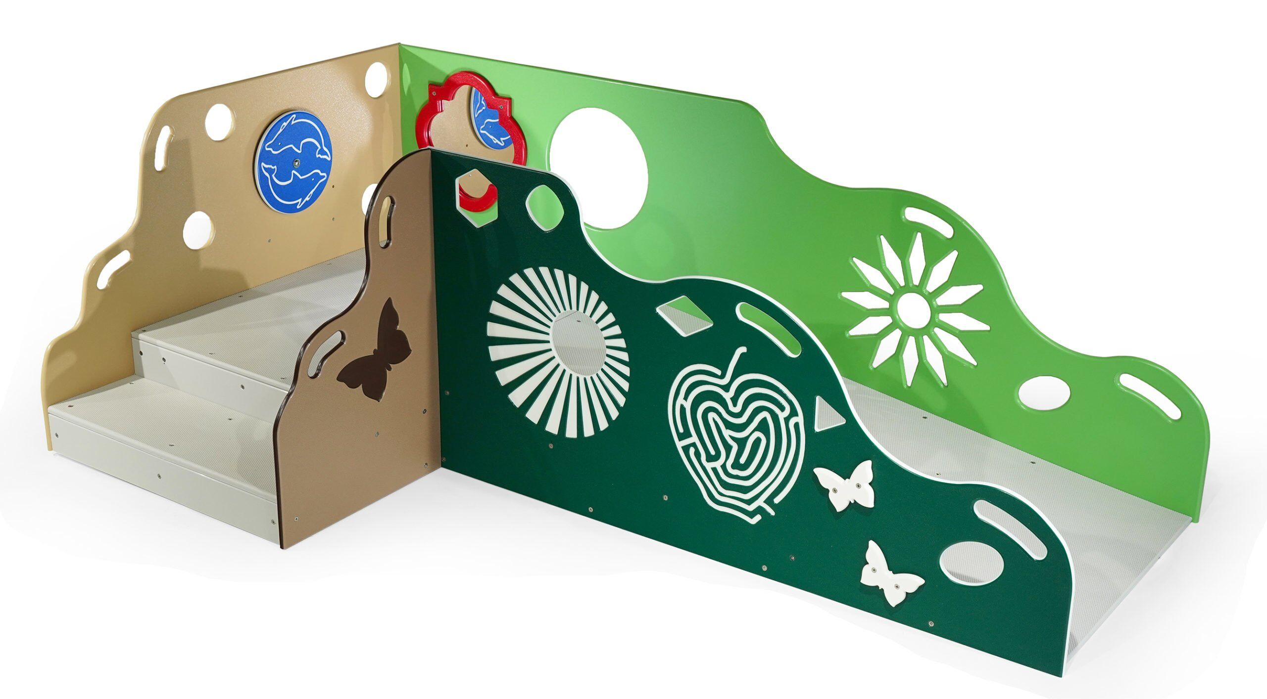 Cutouts and a window permit easy viewing, inside and out. The mirror panel reflects happy faces as little ones scramble around.