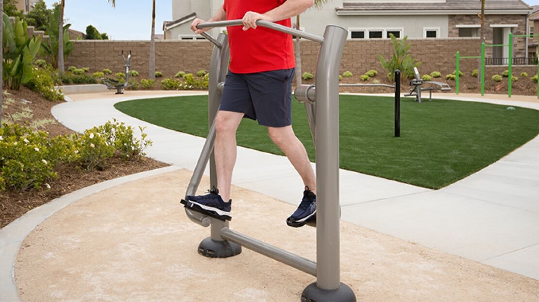 The Cardio Walker offers aerobic fitness and cardio benefits through a smooth striding gazelle or elliptical like motion similar to walking or jogging. Simply place hands on rails and place feet securely on foot pedals. Standing upright, alternate legs in a striding, smooth motion. Outdoor fitness park users can modify the intensity of their cardio aerobic exercise by extending or shortening the stride. Ergonomically designed handles and textured foot pedals ensure user comfort.
