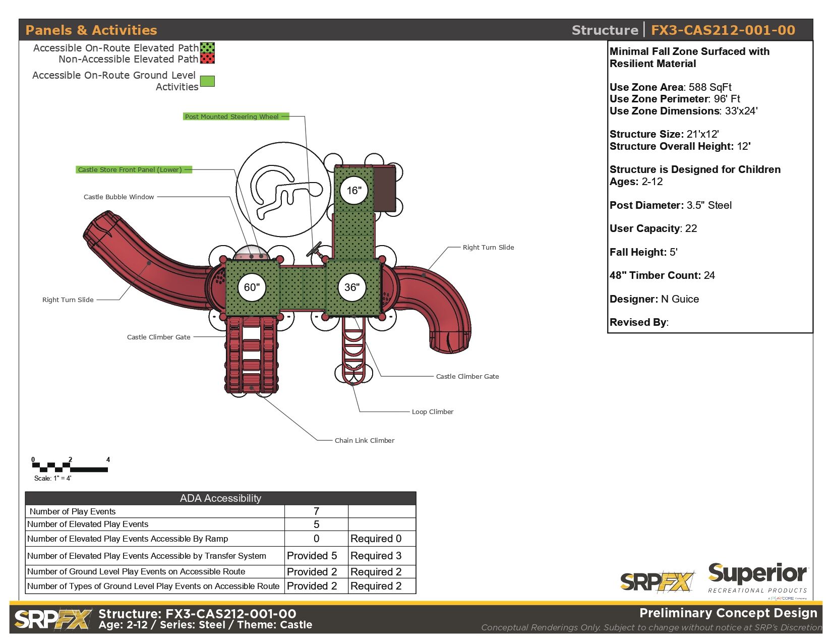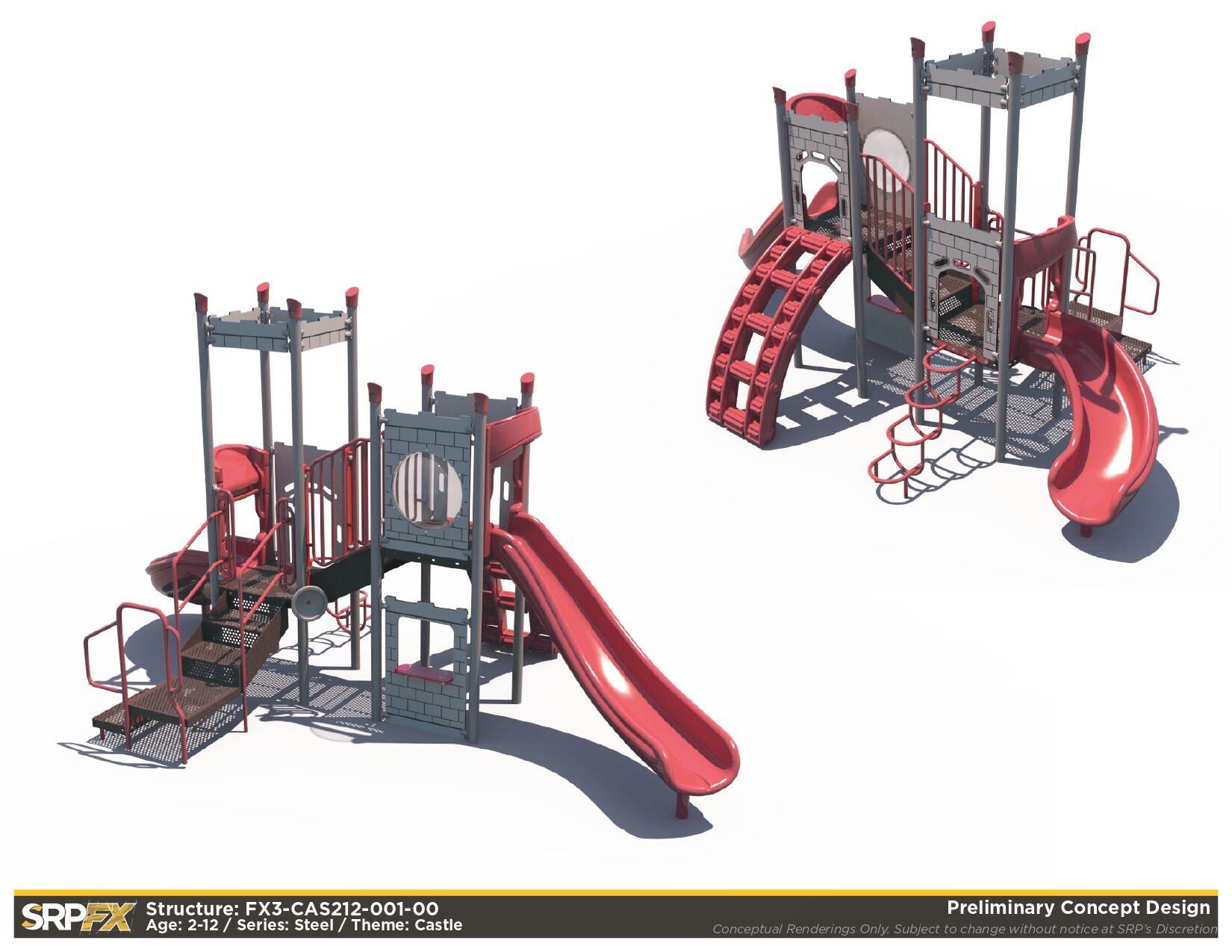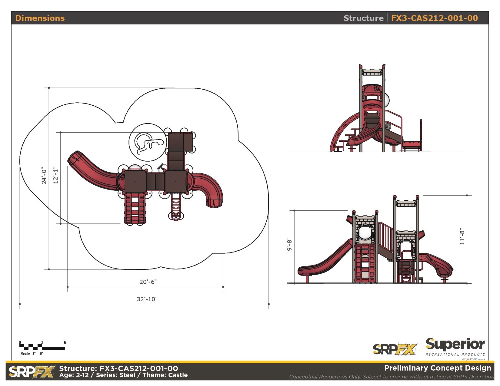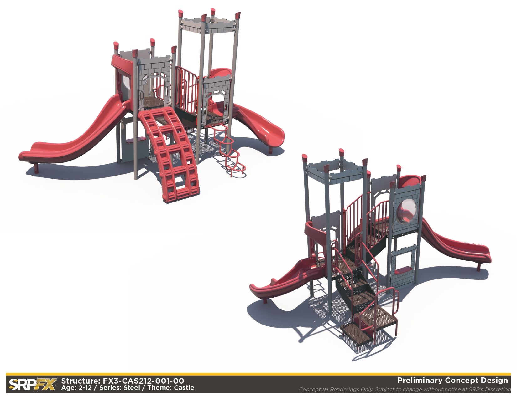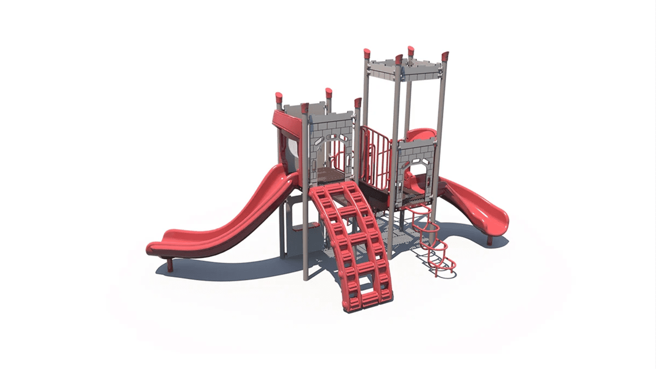 The FX3-CAS212-001 castle themed playground will add an iconic feature to your play space. This 3.5-inch post themed play structure adds great play value with its many slides, climbers, and panels. It’s designed for children ages 2-12.