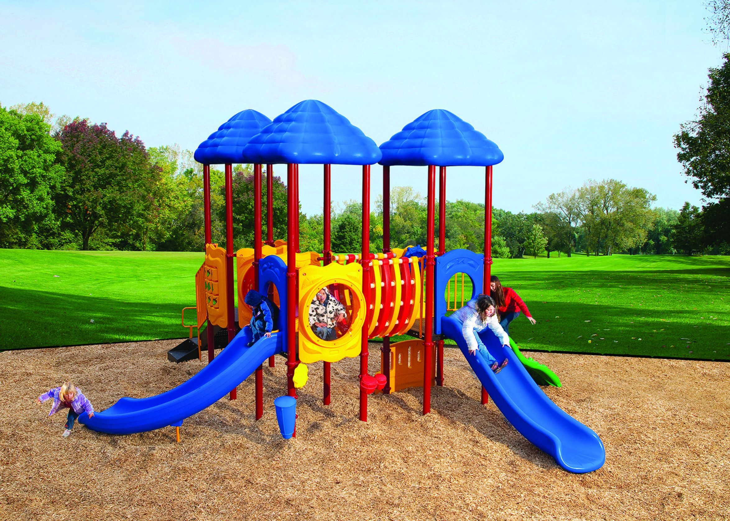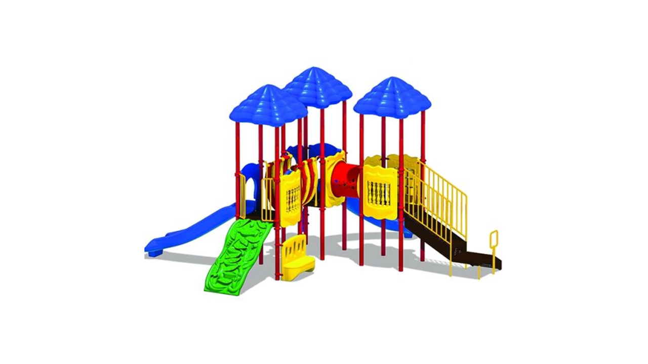 The Cumberland Gap is the gateway to fun! Boasting three decks, this exciting structure can accommodate a high traffic park or multiple classrooms. Each deck is covered with a nature-themed roof, adding shade to the entire structure. Children will traverse from deck to deck using the Bone Bridge and Crawl Tunnel before making their voyage down the straight or curved slide. A Game, Window and Ships Wheel Panel add fun play stations on the structure, while the Bass and Bongo Drums and Rain Wheel offer exciting ground level play. This structure meets ADA guidelines and is commercially compliant with ASTM & CSPC. A ground spike surface mount is included with the structure, but an anchor bolt surface mount or in-ground mounting kit can be purchased separately. Plastics: Heavy-duty rotomolded & blow molded components. Critical Fall Height: 4’0″ Perfect for easy-install, commercially compliant and budget-conscious solutions for daycares, churches and apartment complexes! Assembly required. Truck delivery.