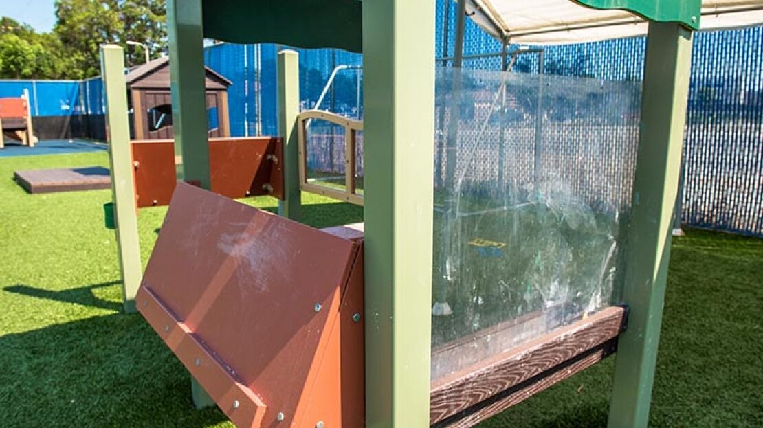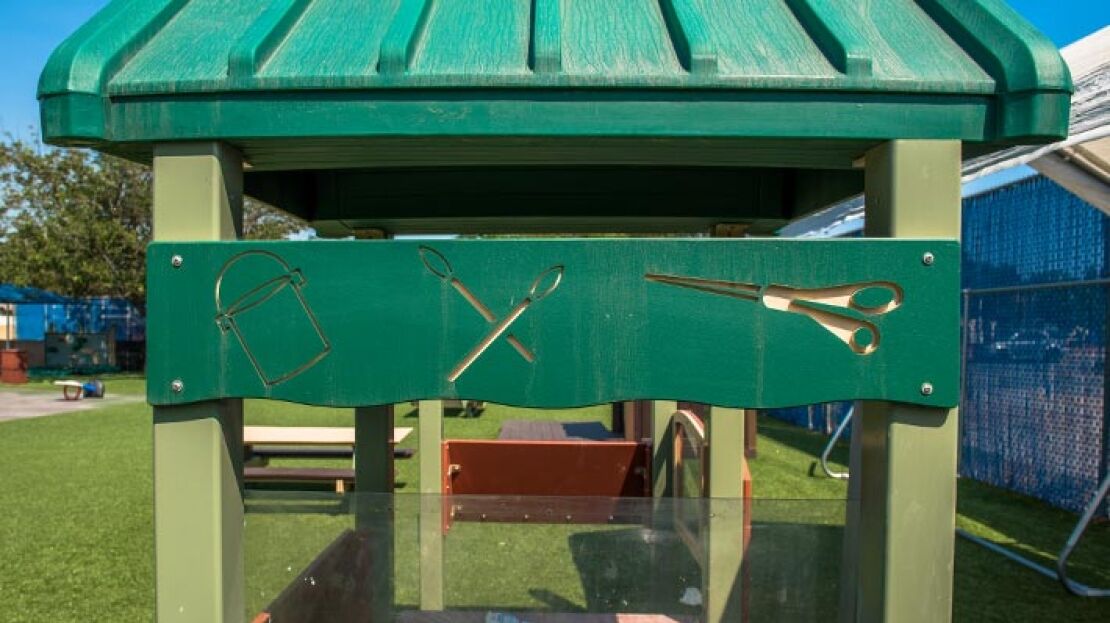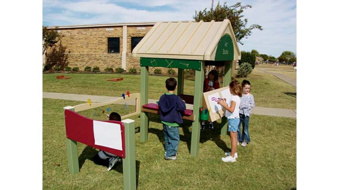 This fun outdoor playground element encourages creative and artistic play. It includes a chalkboard, a polytone countertop, two clear polycarbonate art easels with storage bin and a 45-inch wide drawing board. The rotationally molded roof provides much-needed shade for pre-schoolers as they create.