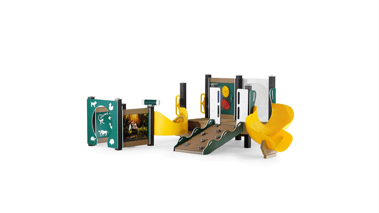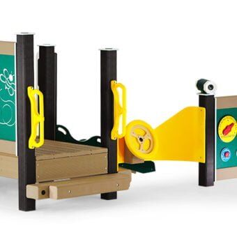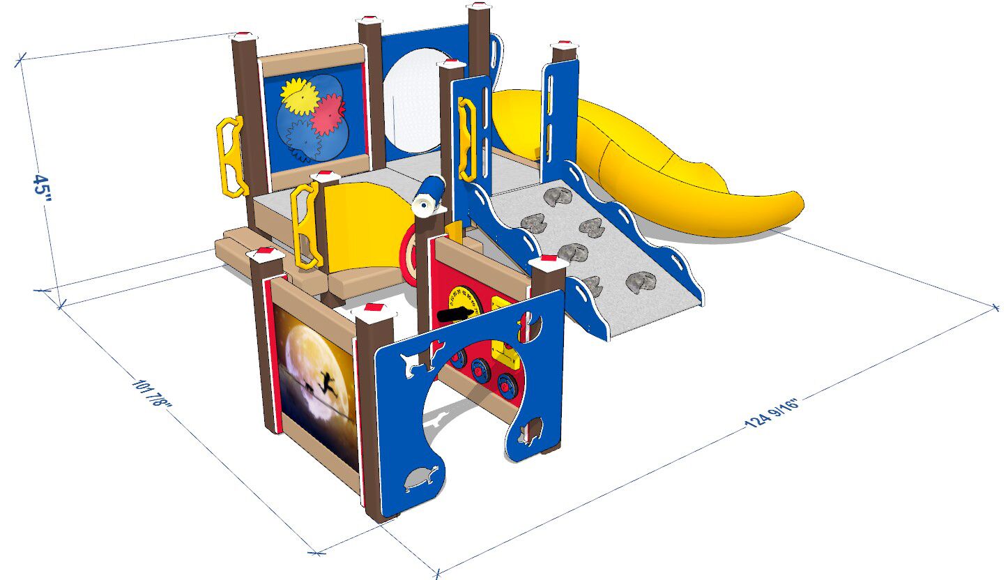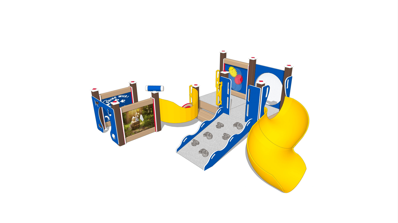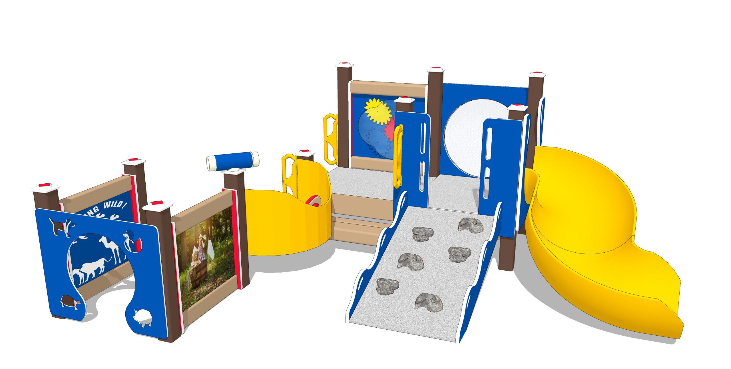 Even the footprint isn’t the typical square on this playset. There are loads of twists and turns to explore, with surprises around every corner. A marvelous mix of engraving and photo images decorate the solid panels. Youngsters can learn about animals as their fingers trace the designs.