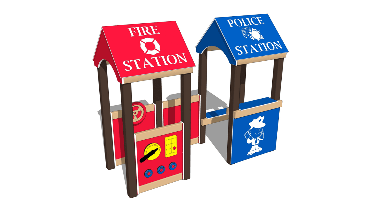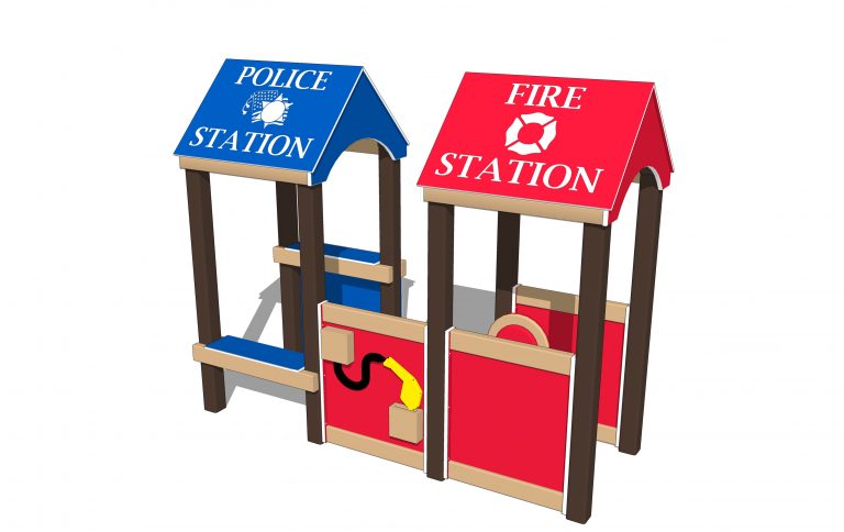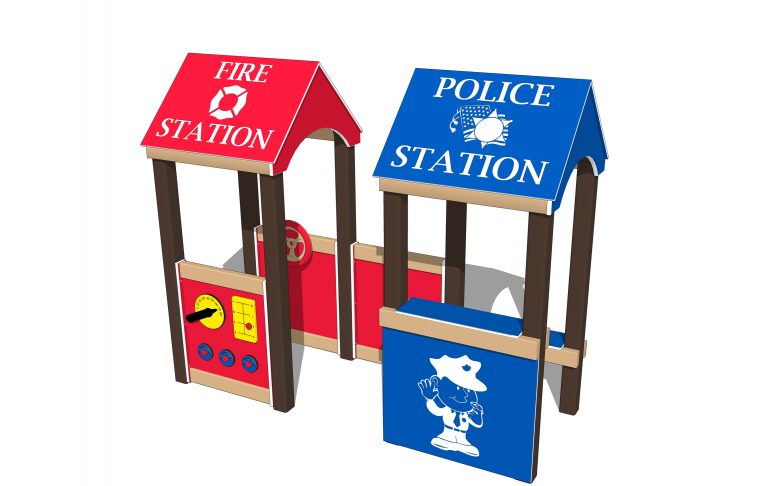 The Fire Station side includes a color panel with engraved Dalmatian pup, an interactive gauges panel, and an engraved roof. The Police Station side includes a storefront panel with an engraved police officer, a built-in bench, and an engraved roof. You can even pair this combo with our Fire Truck playset that we’ve designed specifically for preschool-age children.
