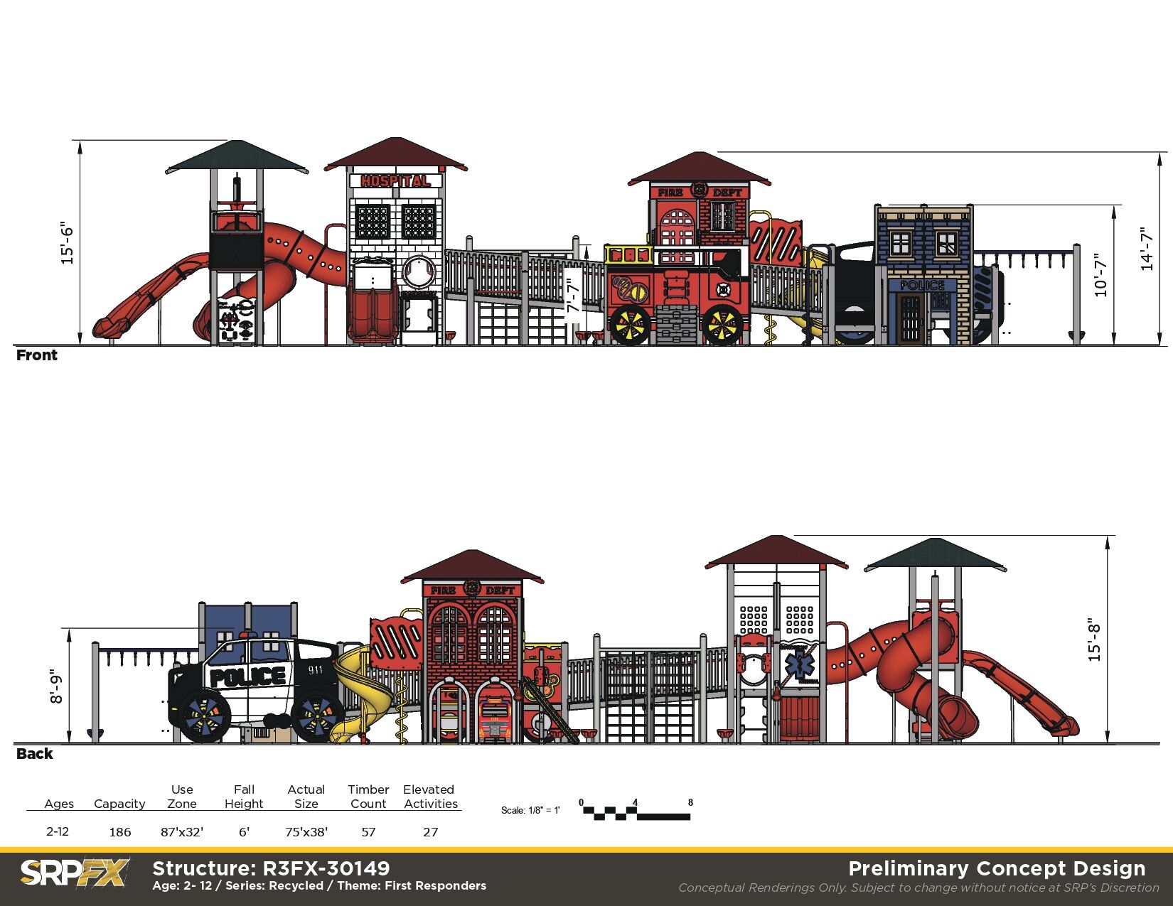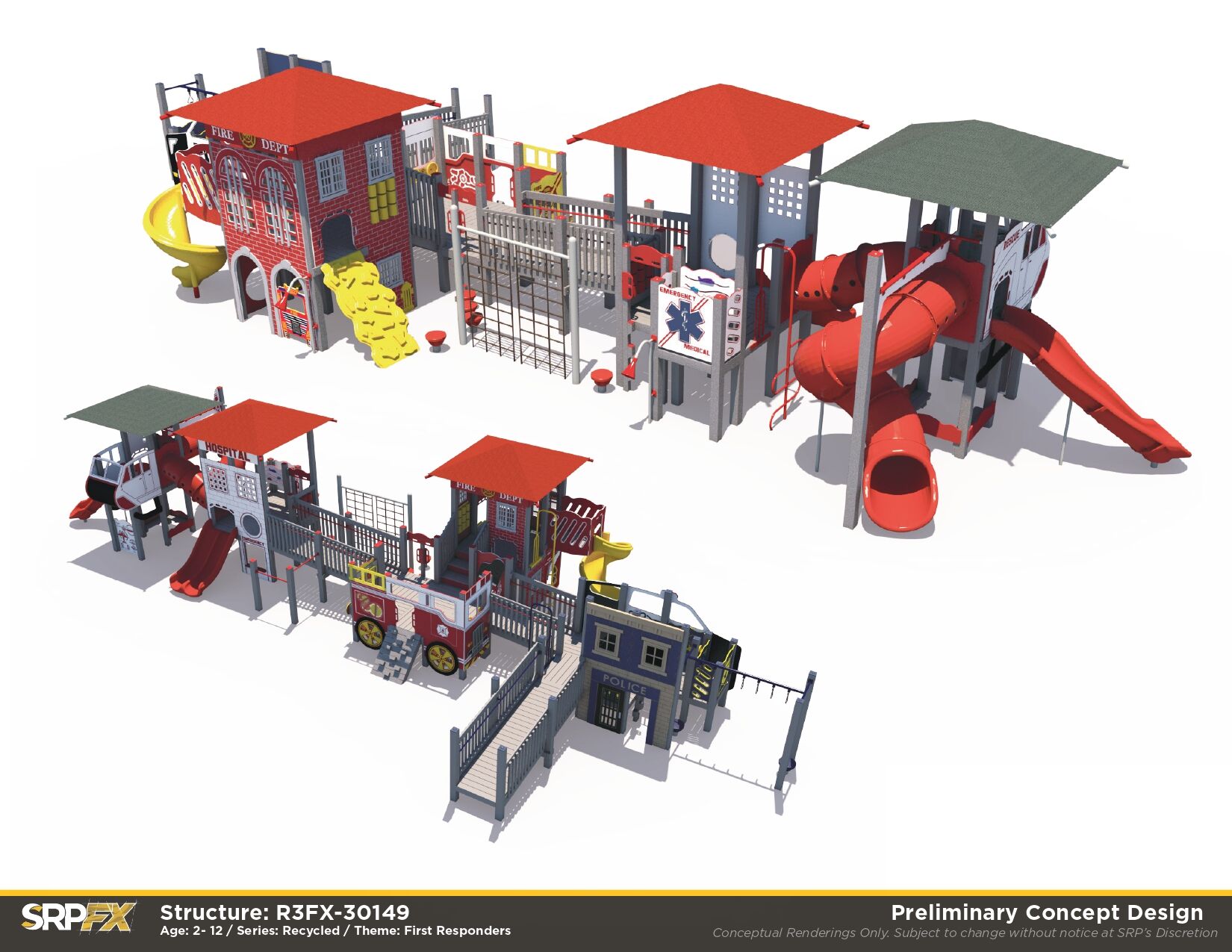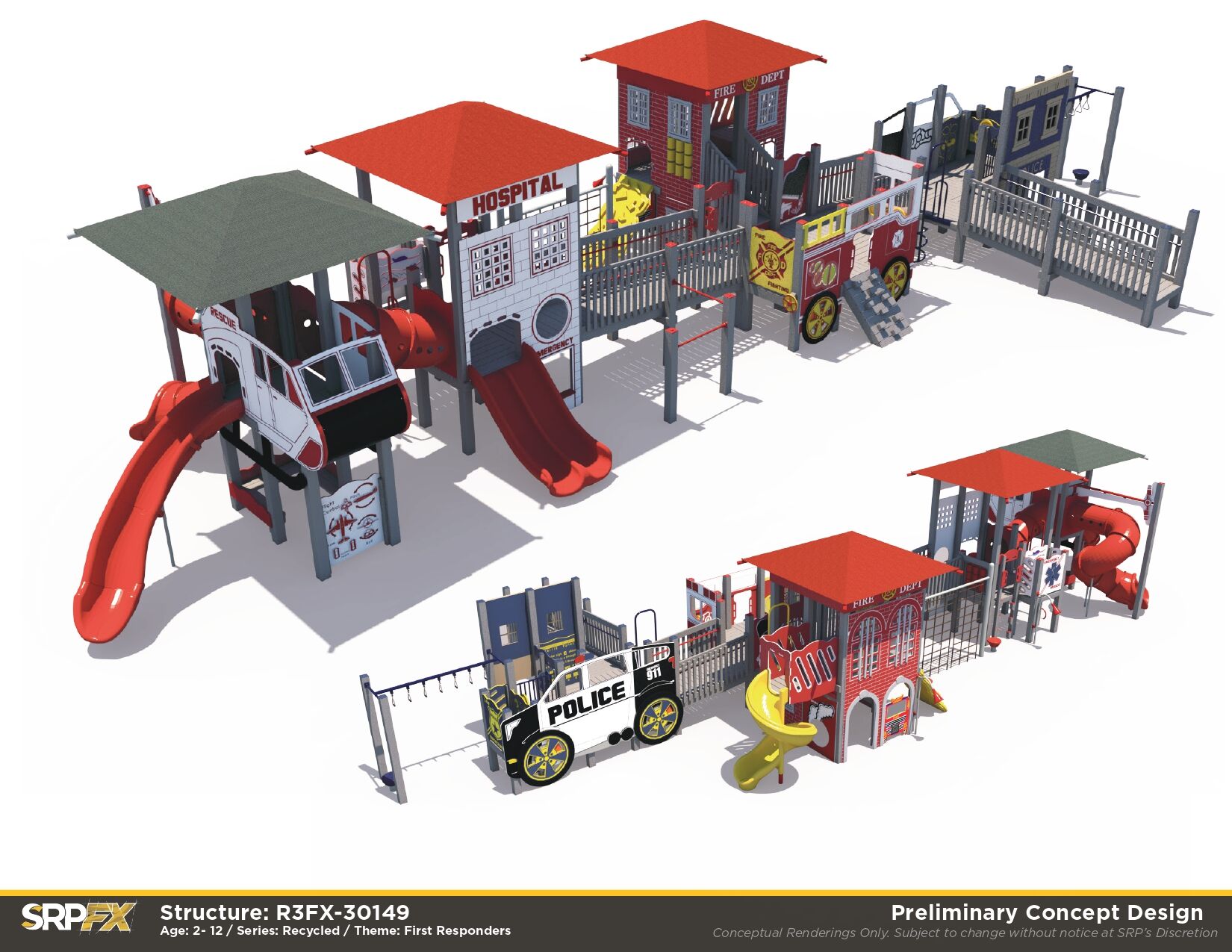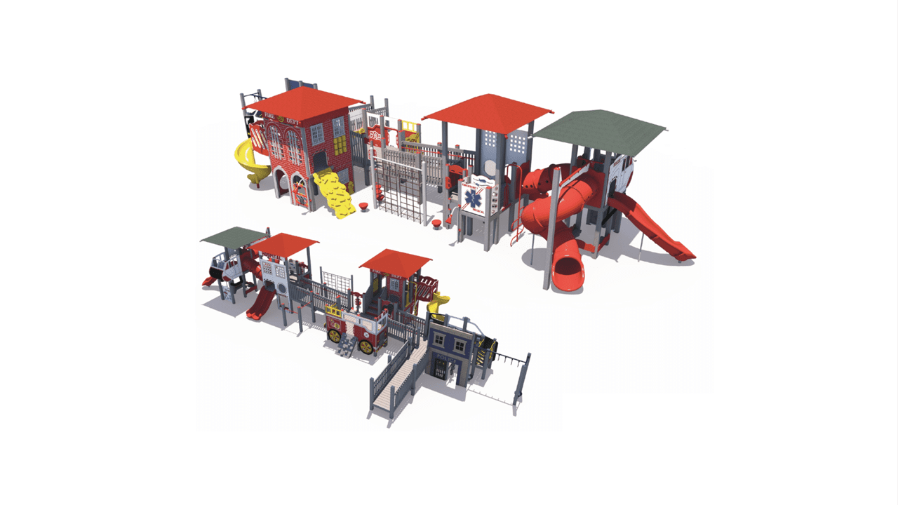 Kids of all ages and abilities will find their favorite spot on this amazing playground! In honor of our fearless First Responders, this design features a police station & police car, a fire station & firetruck, and a hospital & rescue helicopter. The capacity is 186 users! With integrated shade, ground level play, and ramps accessing all levels – there’s something for everyone!