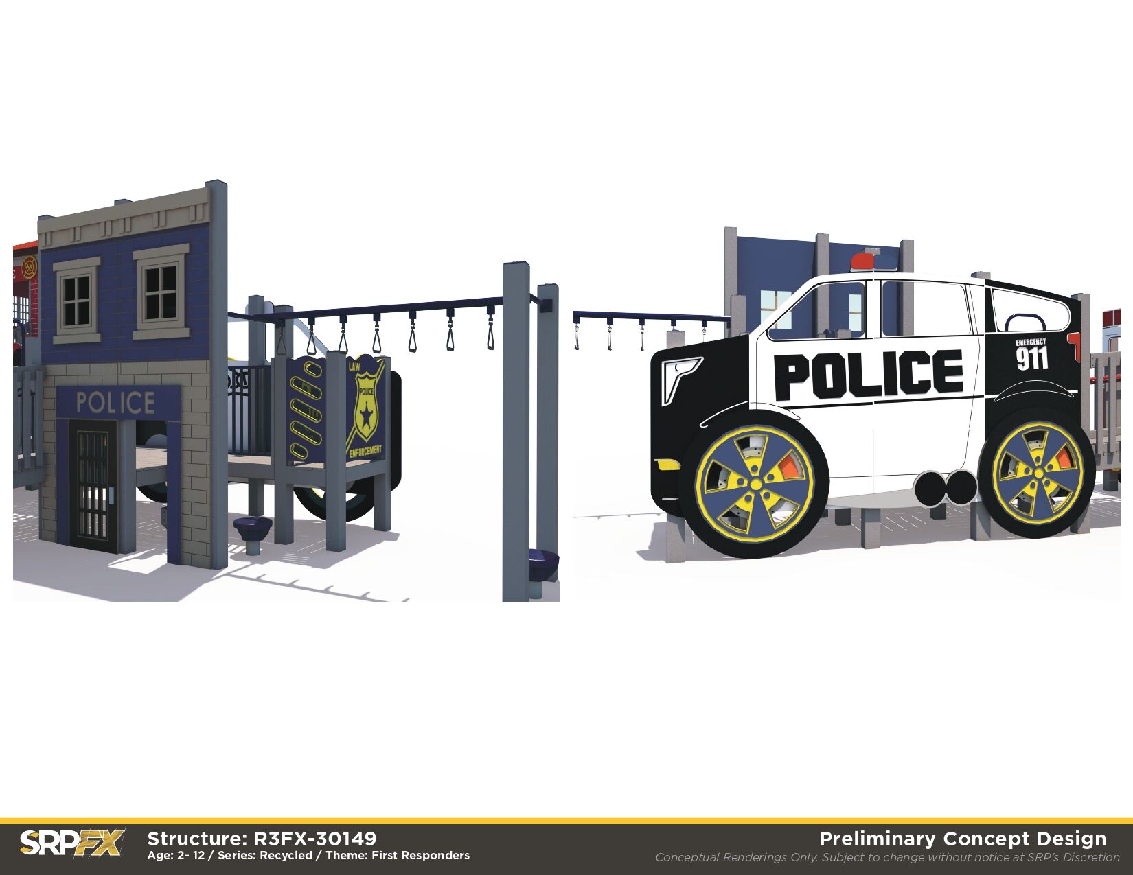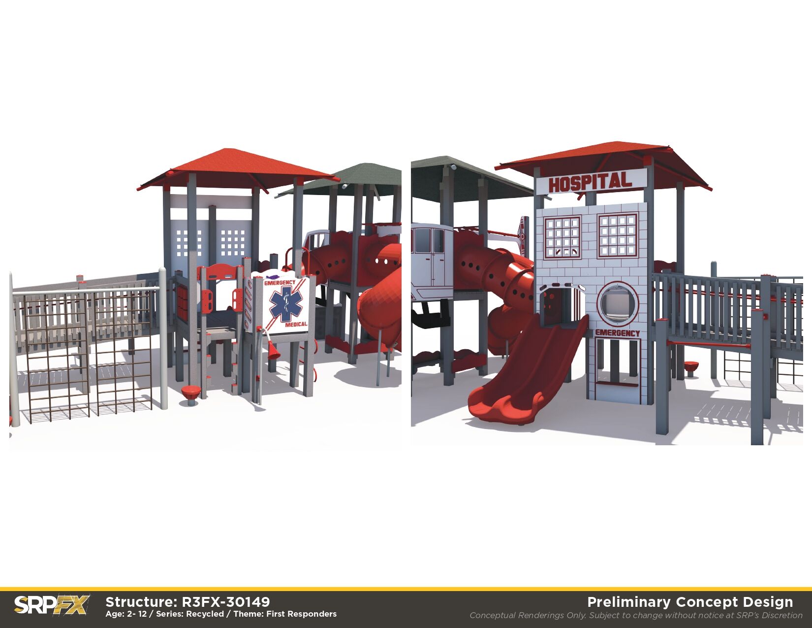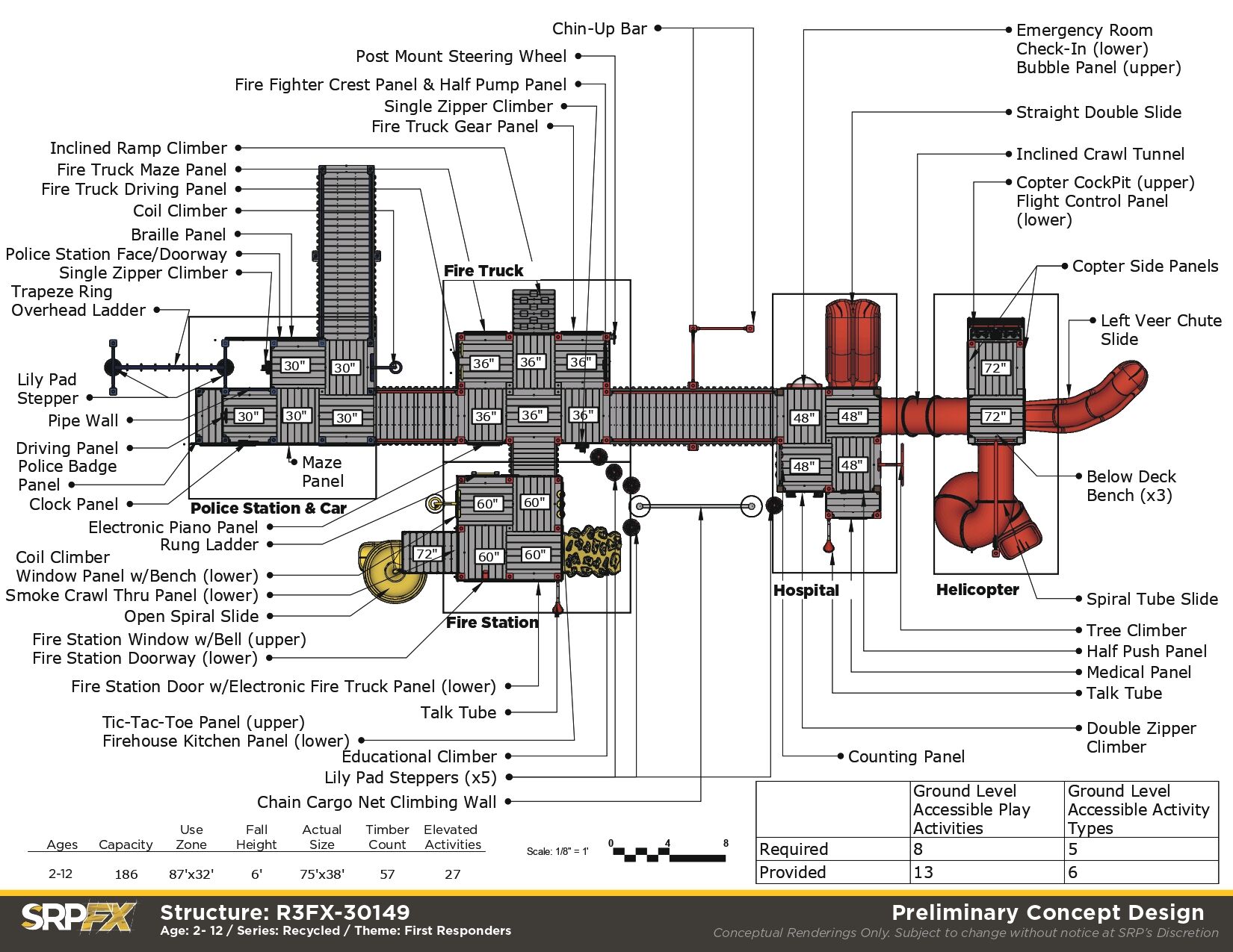 Kids of all ages and abilities will find their favorite spot on this amazing playground! In honor of our fearless First Responders, this design features a police station & police car, a fire station & firetruck, and a hospital & rescue helicopter. The capacity is 186 users! With integrated shade, ground level play, and ramps accessing all levels – there’s something for everyone!