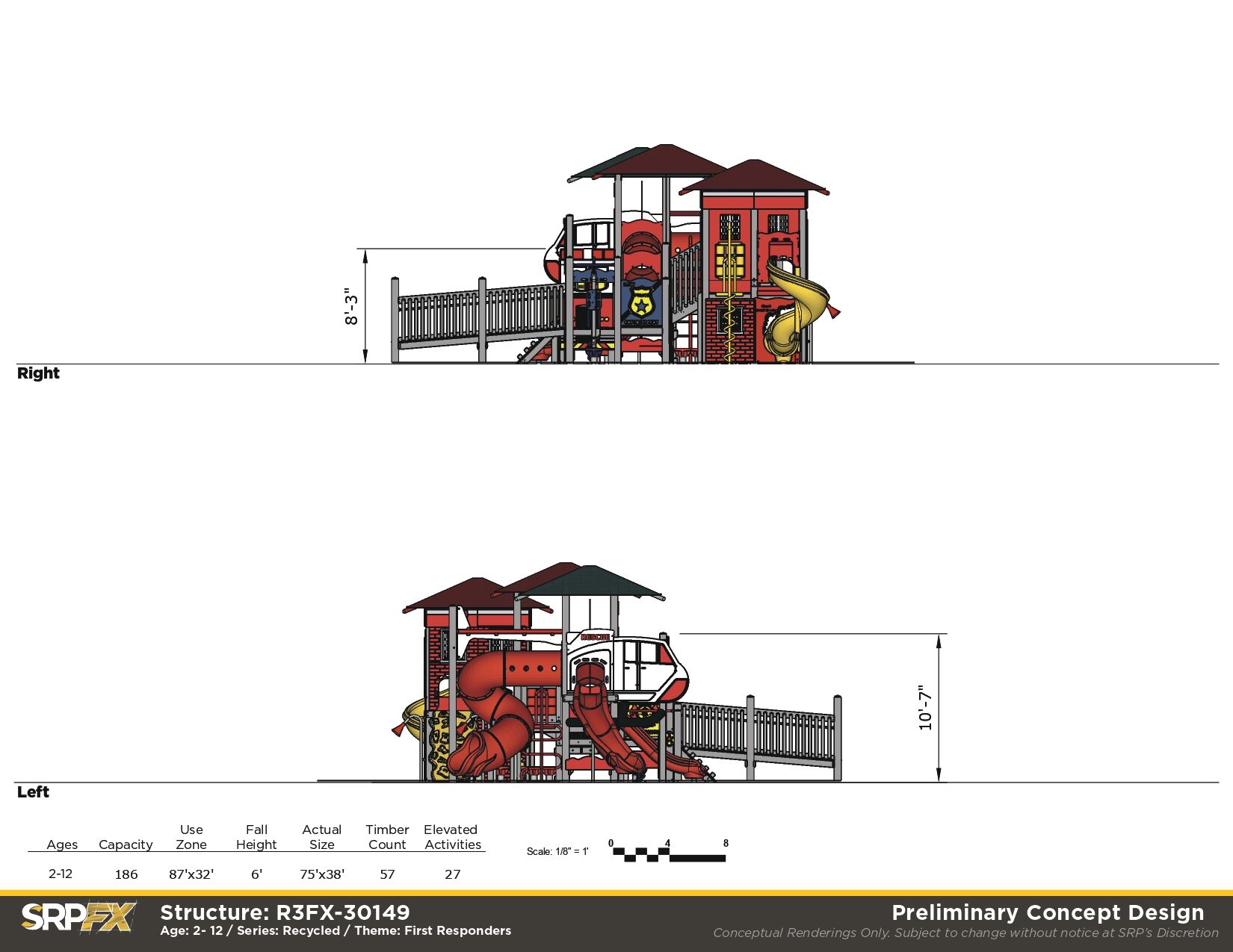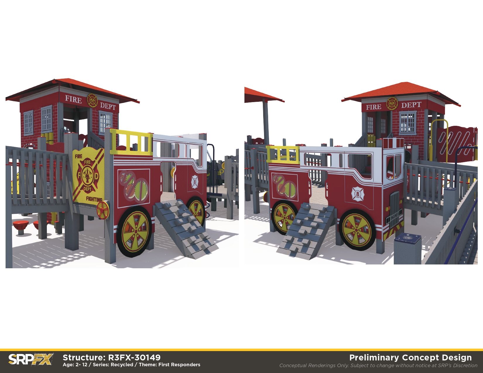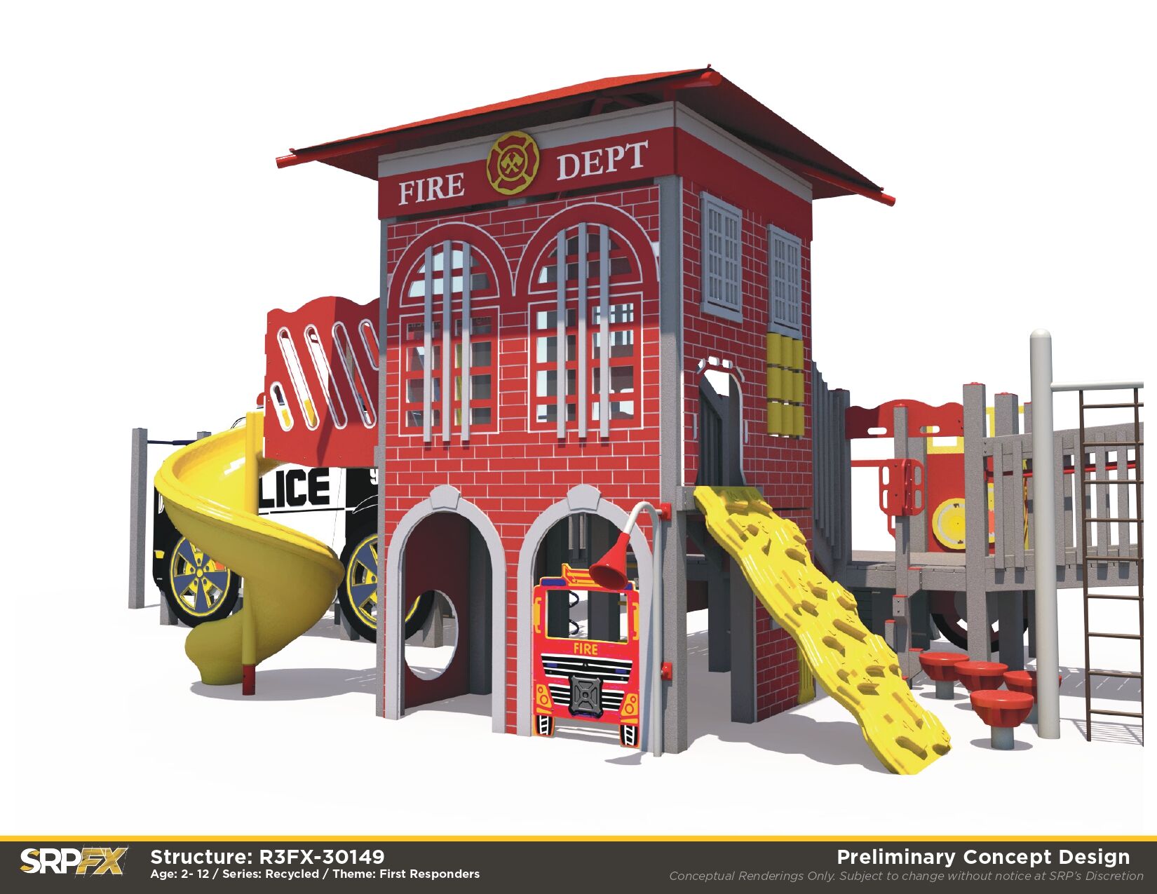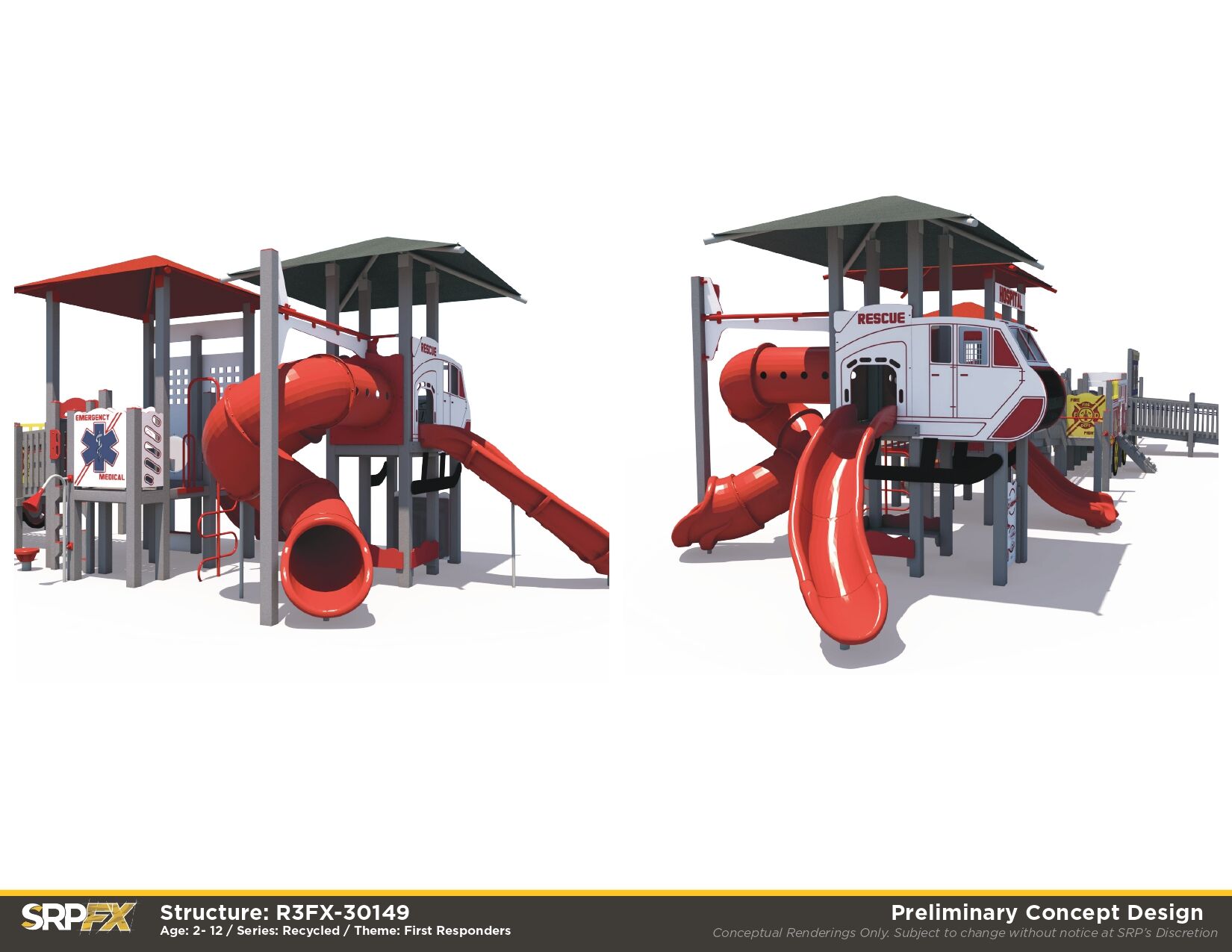 Kids of all ages and abilities will find their favorite spot on this amazing playground! In honor of our fearless First Responders, this design features a police station & police car, a fire station & firetruck, and a hospital & rescue helicopter. The capacity is 186 users! With integrated shade, ground level play, and ramps accessing all levels – there’s something for everyone!