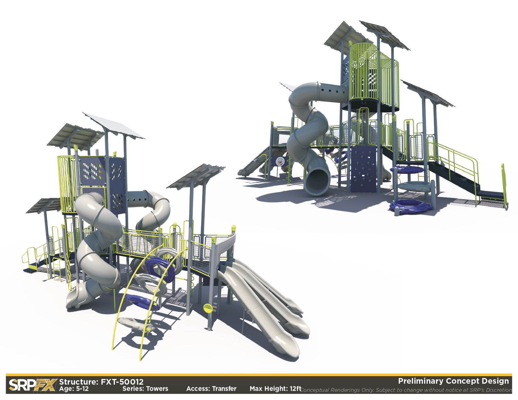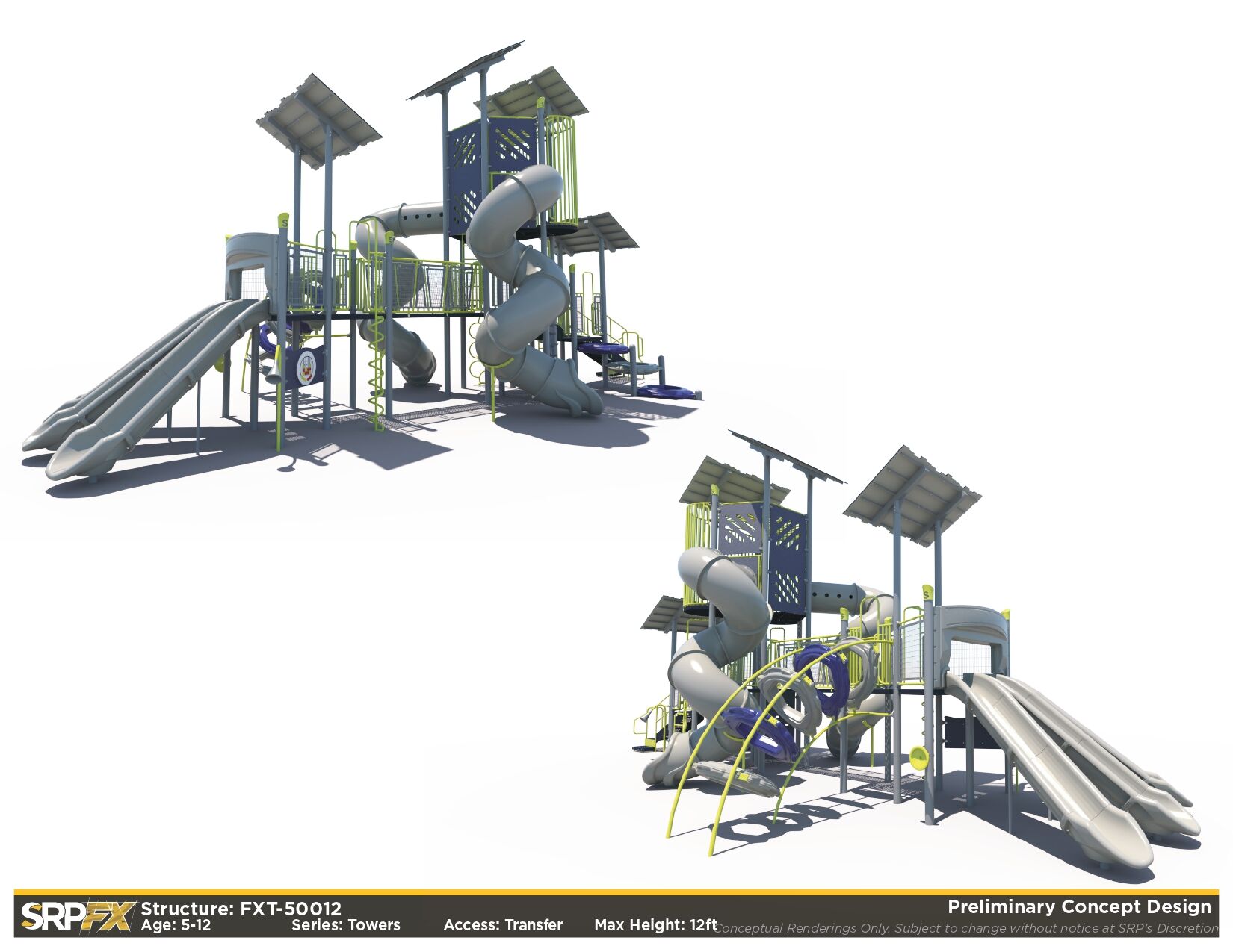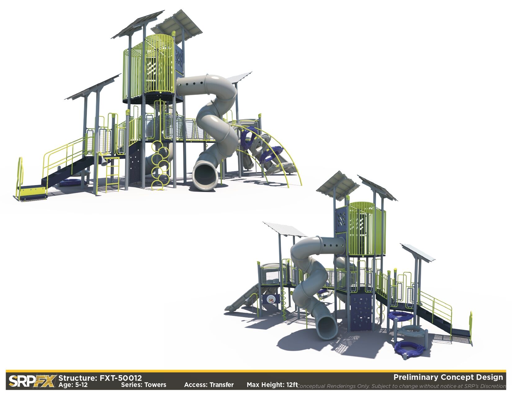 The FXT-50012 is a modern and unique tower play structure. Children ages 5-12 will love exploring the fun slides, challenging climbers, and interactive panels. The tower features slotted barrier panels for safety and visibility.