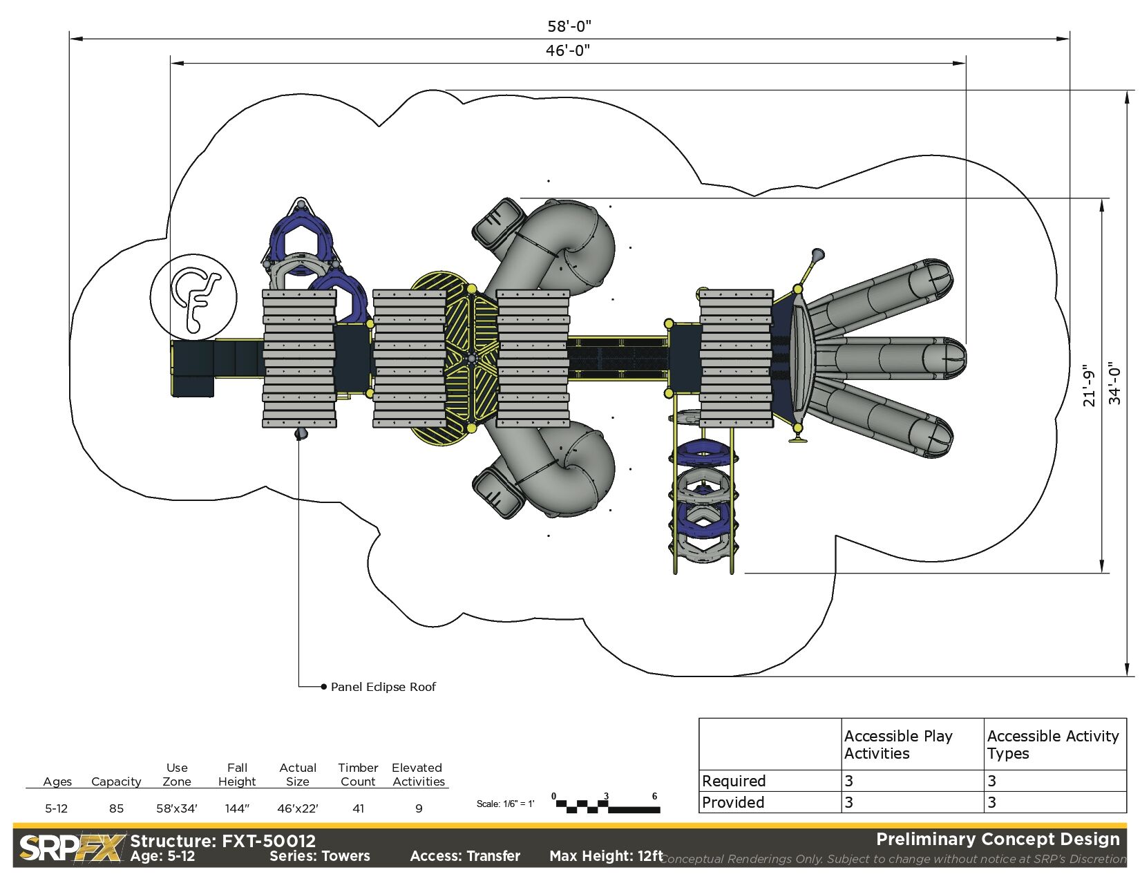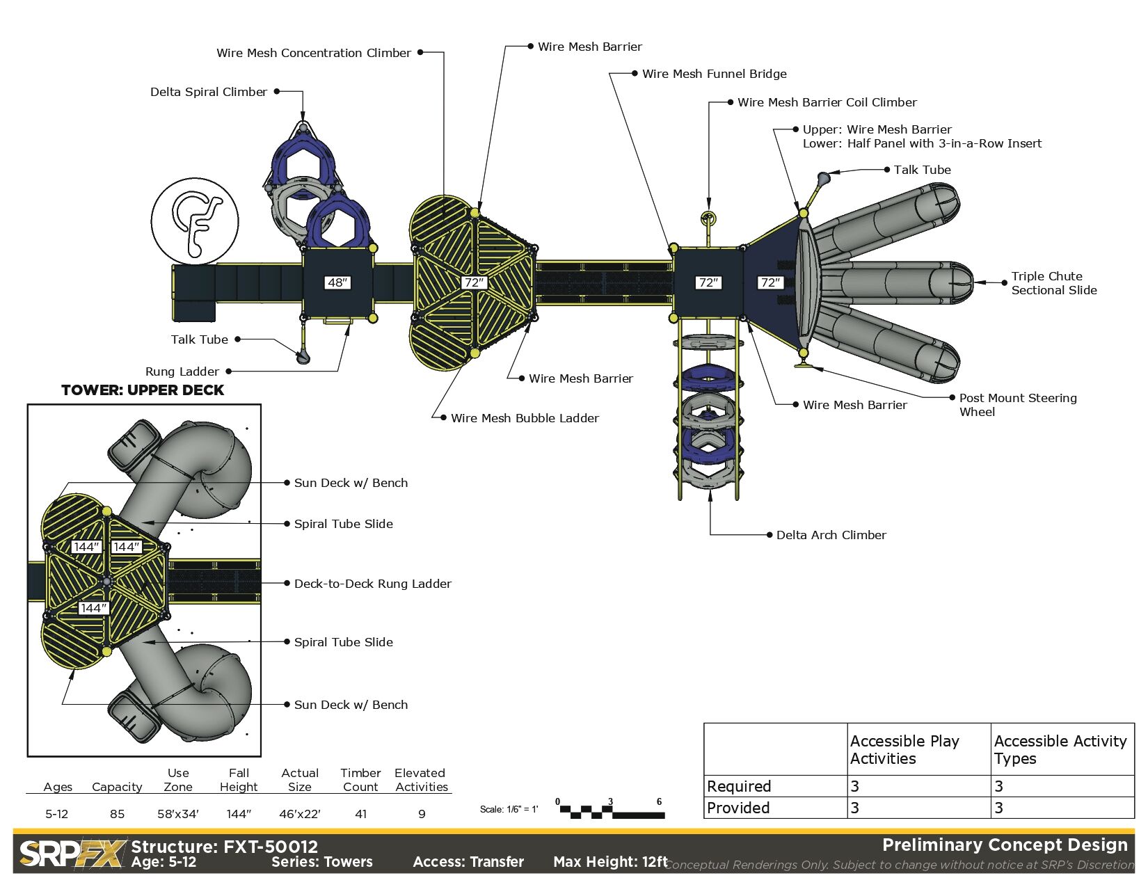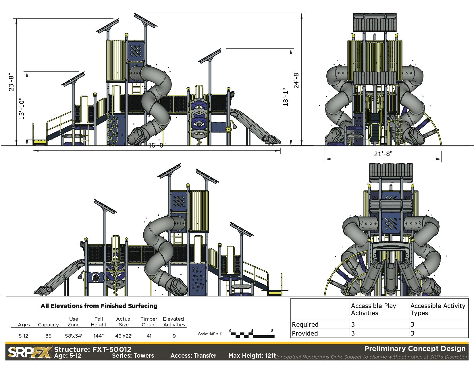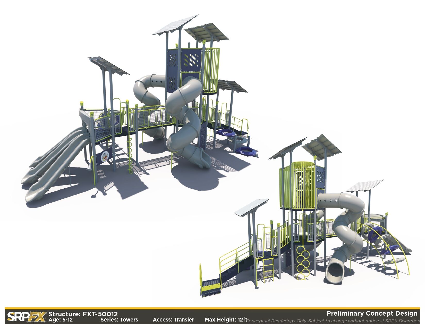 The FXT-50012 is a modern and unique tower play structure. Children ages 5-12 will love exploring the fun slides, challenging climbers, and interactive panels. The tower features slotted barrier panels for safety and visibility.
