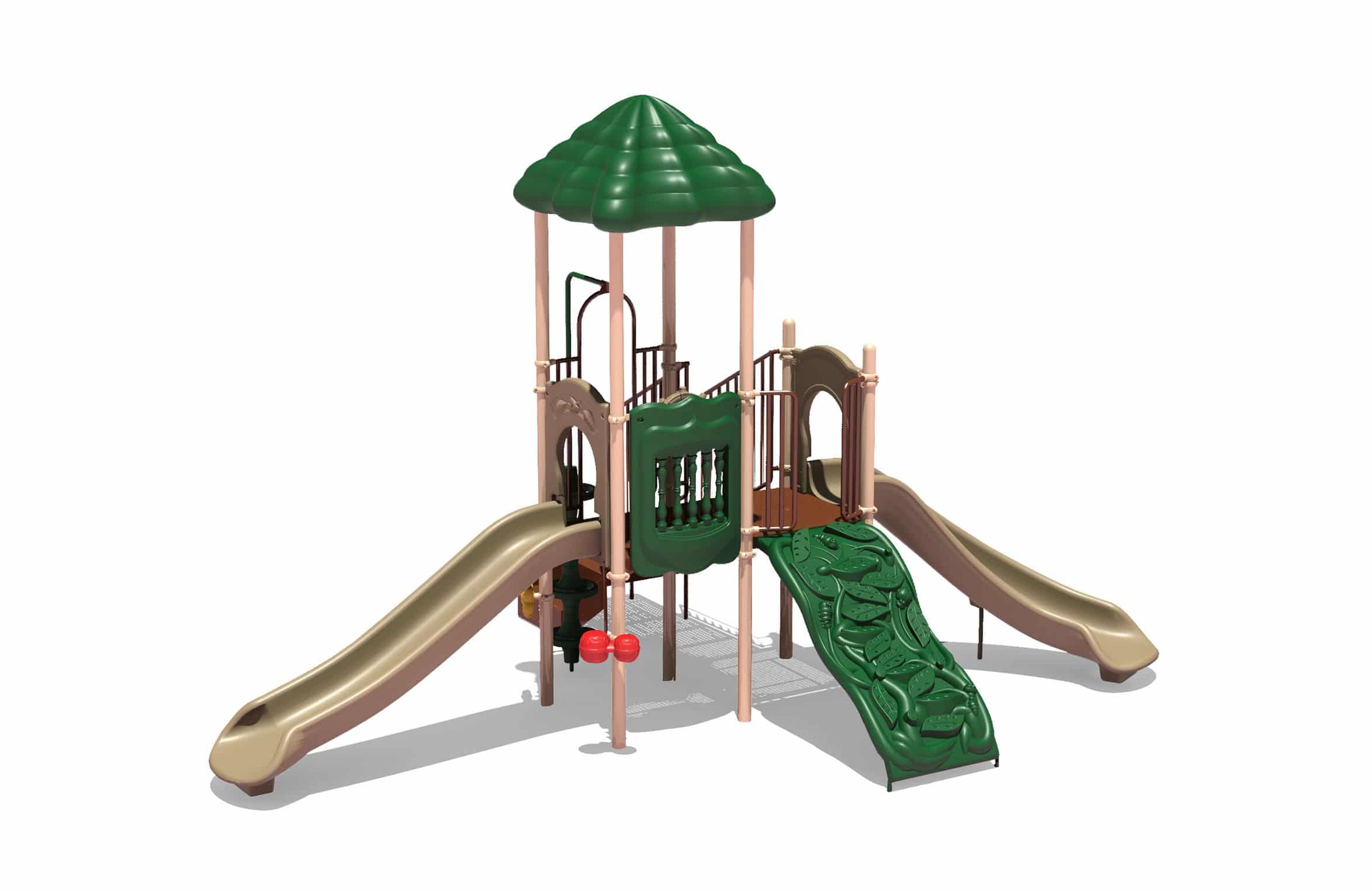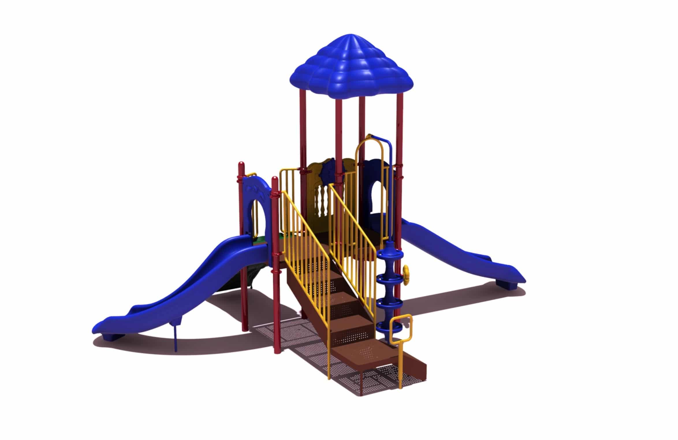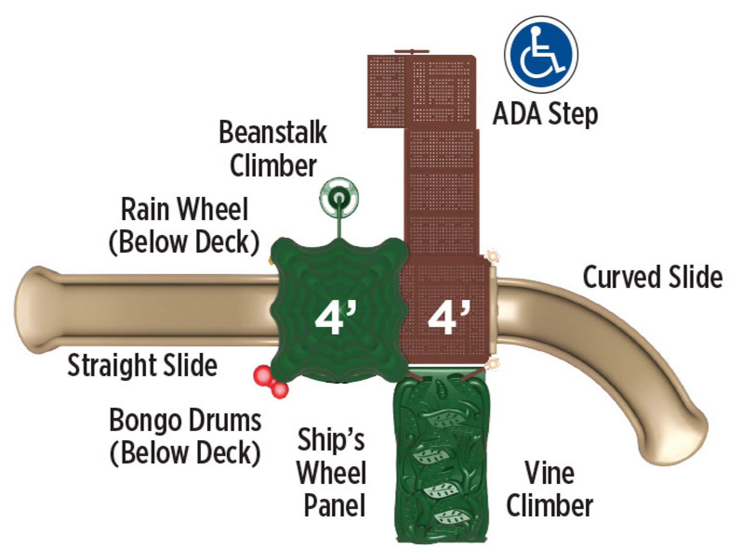 The Hawk’s Nest boasts a challenging 4′ Vine Climber and Beanstalk Climber, while also offering a Straight and Curved Slide. The Ship’s Wheel Panel adds dramatic play opportunities while giving caregivers increased visibility to the structure. Two ground level music components ensure that children of all abilities will enjoy this structure. Finally, the roof helps keeps kids cool as they explore the Hawk’s Nest. This structure meets ADA guidelines and is commercially compliant with ASTM & CSPC. The posts are 13-gauge galvanized steel tube and powdercoated. The plastics are heavy-duty rotomolded & blow molded components. Critical fall height is 40 A ground spike surface mount is included with the structure, but an anchor bolt surface mount or in-ground mounting kit can be purchased separately. Perfect for easy-install, commercially compliant and budget-conscious solutions for daycares, churches and apartment complexes! Assembly required. Truck delivery.