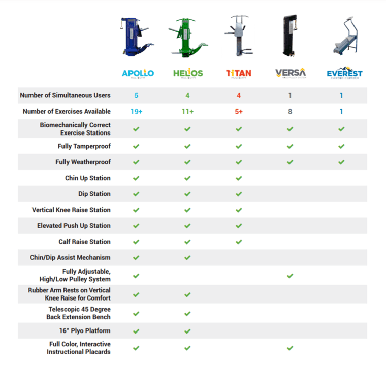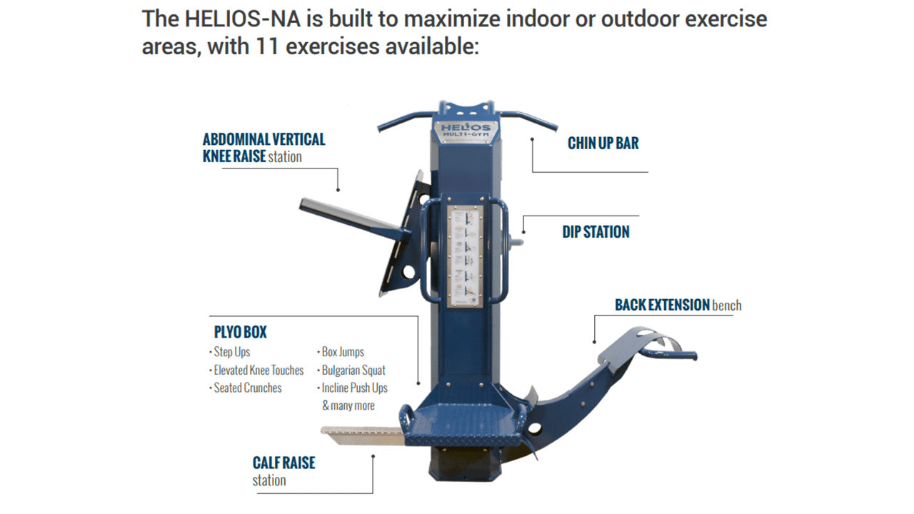 The HELIOS-NA is a durable, compact, and real exercise outdoor fitness multigym that can withstand any climate or environment. Unsupervised areas such as public parks choose the HELIOS-NA because of its easy installation, zero maintenance design and 15-year warranty.