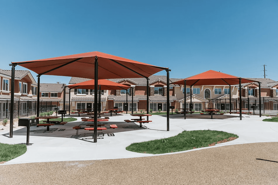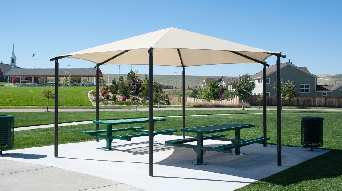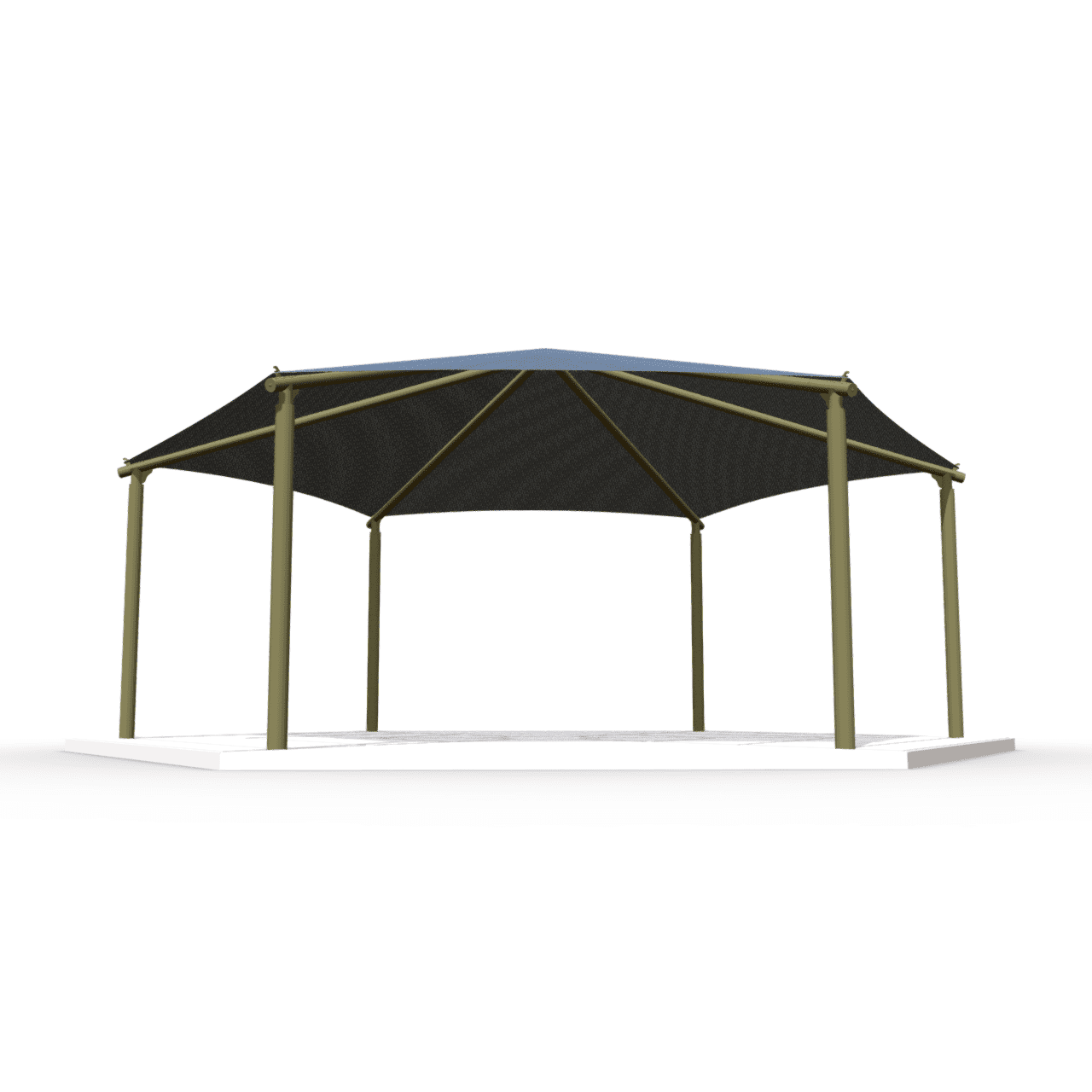 Our Hexagon Hip Shade structures feature a six-column design with a canopy tensioned over a hip and ridge frame. These shades are an affordable option for park, school, and church landscapes. For coastal areas, we recommend utilizing our optional Glide Elbow accessory which allows for easier installation, removal, and tensioning of the canopy to give you the ability to remove your canopy if needed. Additionally, it is recommended for coastal area customers to upgrade their shade structure with stainless steel cables and hardware. We offer nearly 100 standard versions of our hip shades with the option of creating custom sizes as well. Standard sizes range from 12′ to 55′ with 8′, 10′, and 12′ entry eave heights. Contact us today to get started.