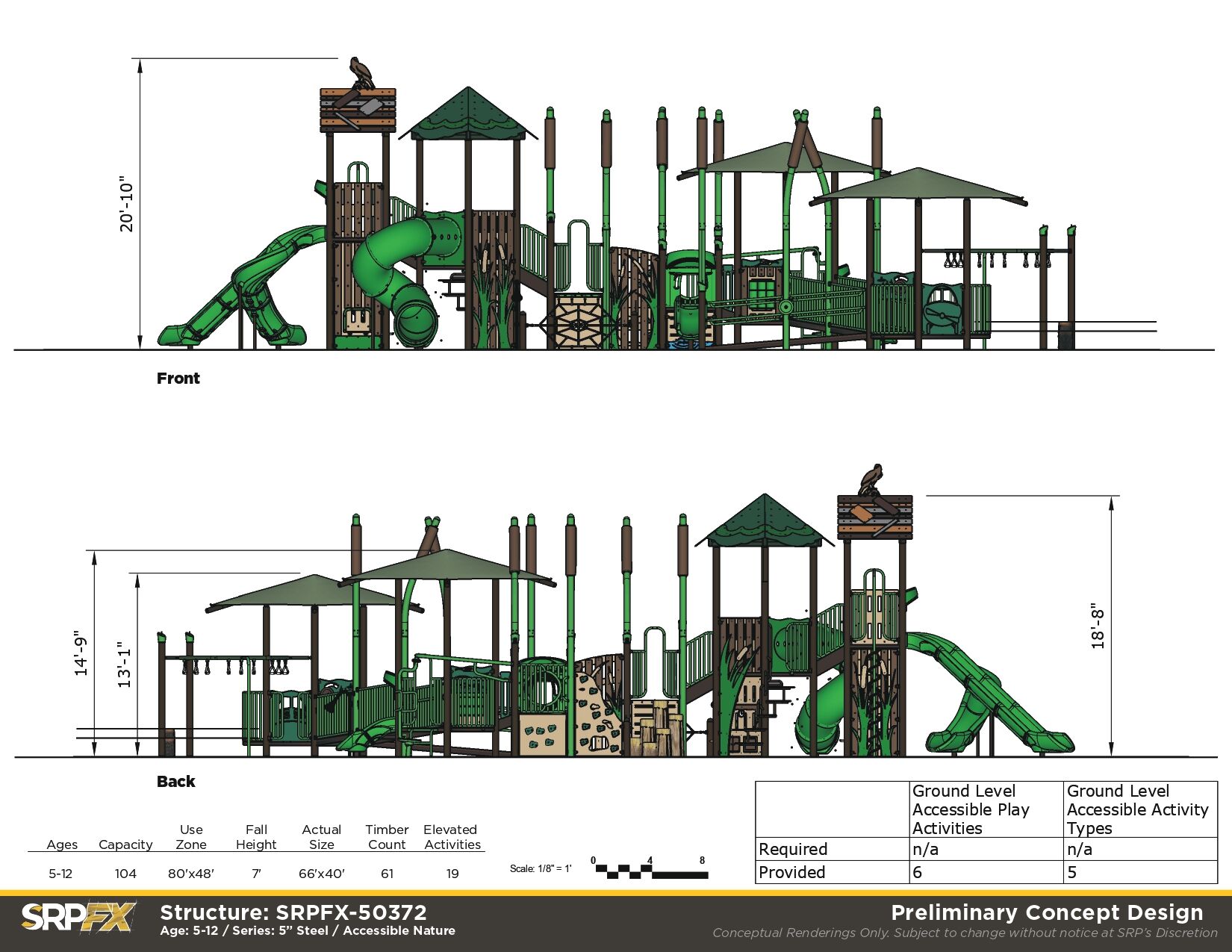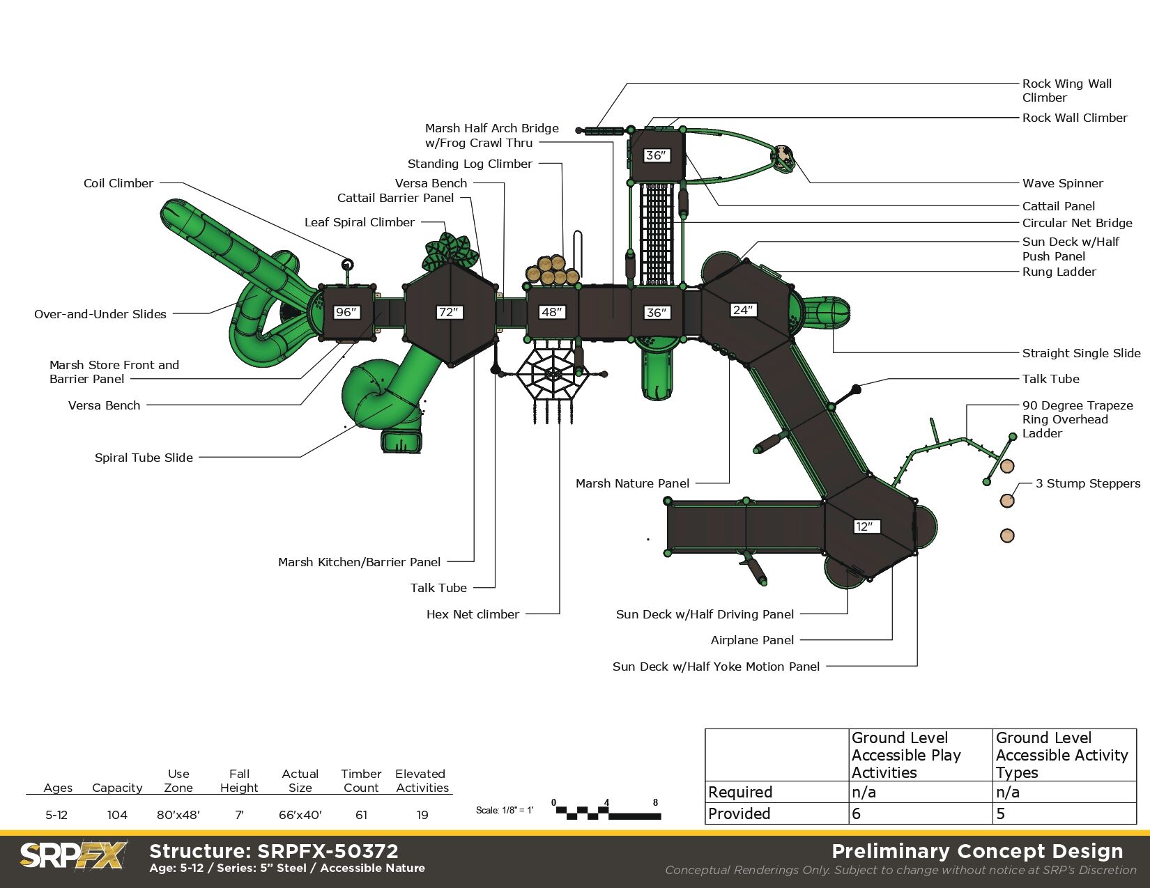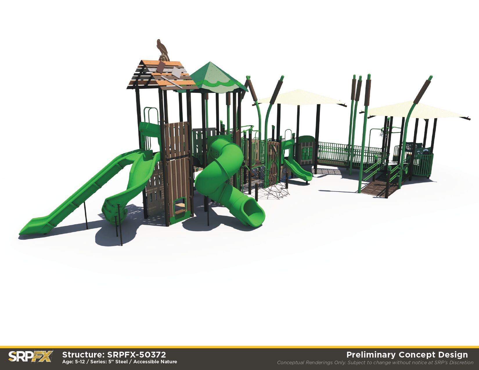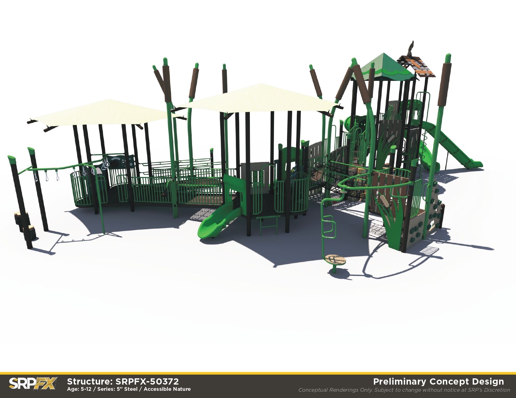 The SRPFX-50372 Marsh themed playground features an wide ramp that provides access to meaningful play events. Children ages 5-12 will enjoy exploring the fun and challenging slides, climbers, and panels on this steel outdoor playground.