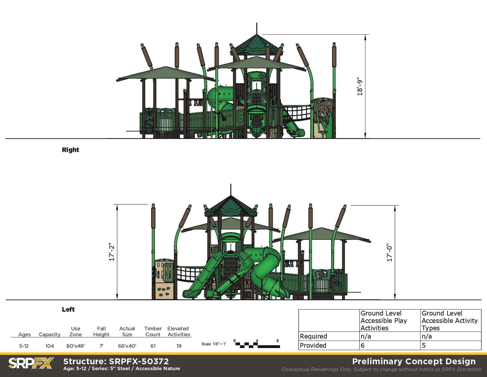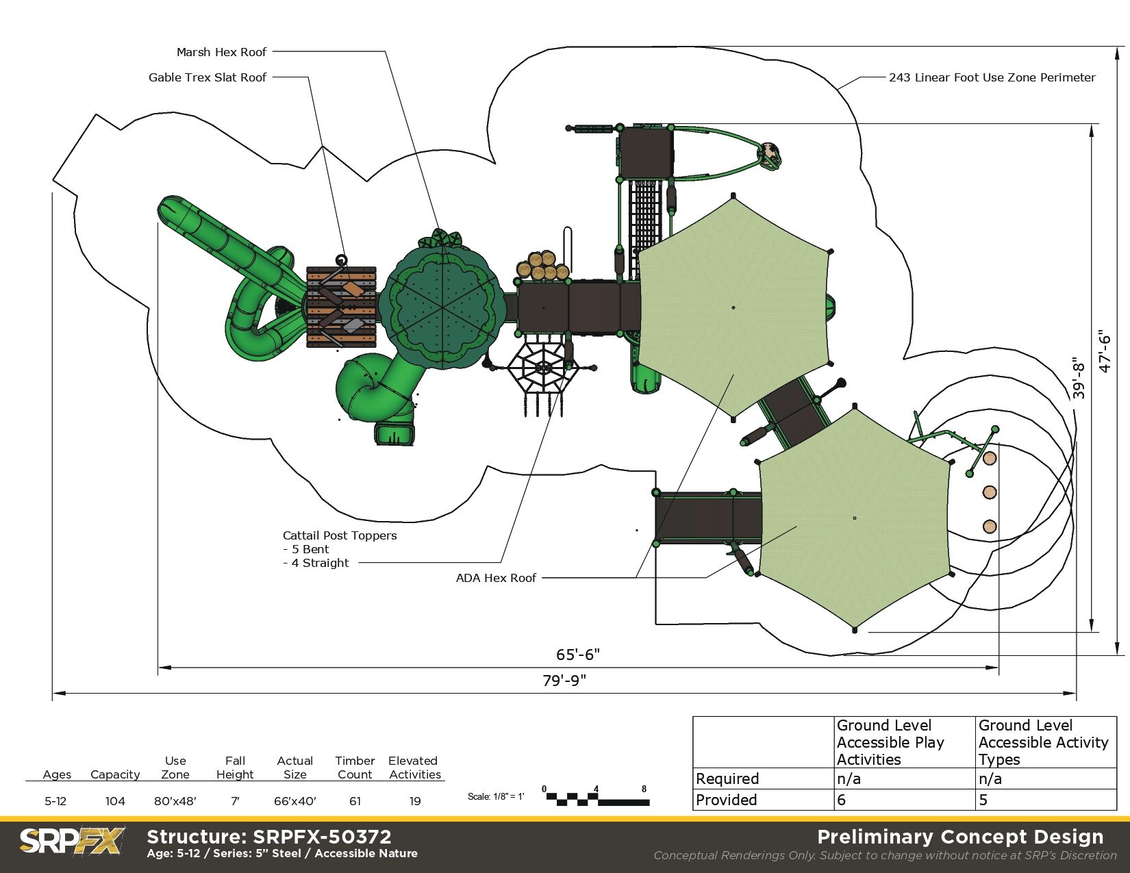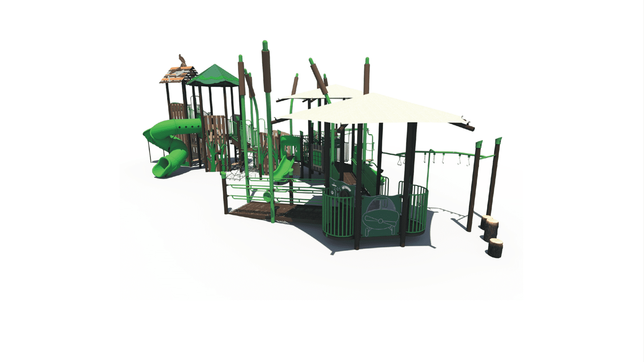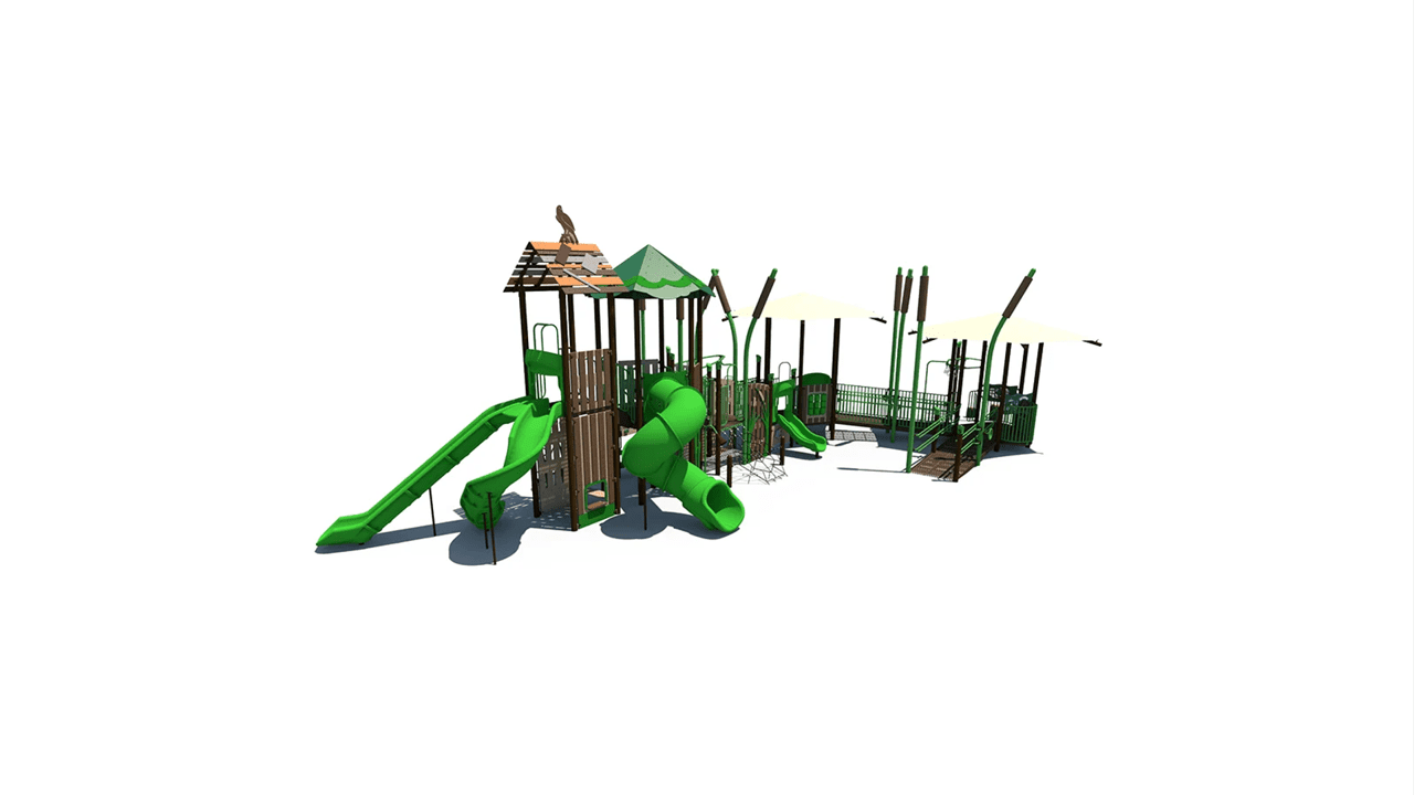 The SRPFX-50372 Marsh theme playground features a wide accessible ramp that provides access to meaningful play activities to children of all abilities.