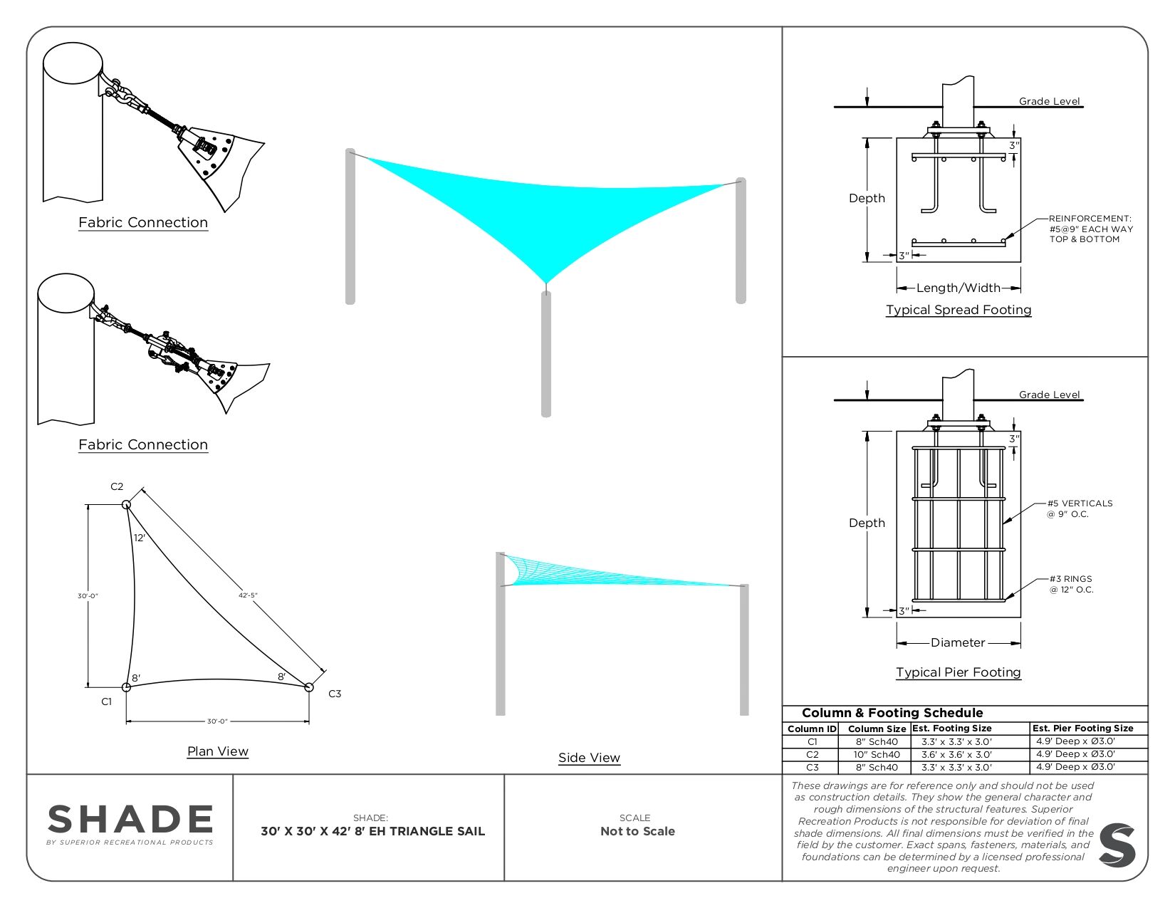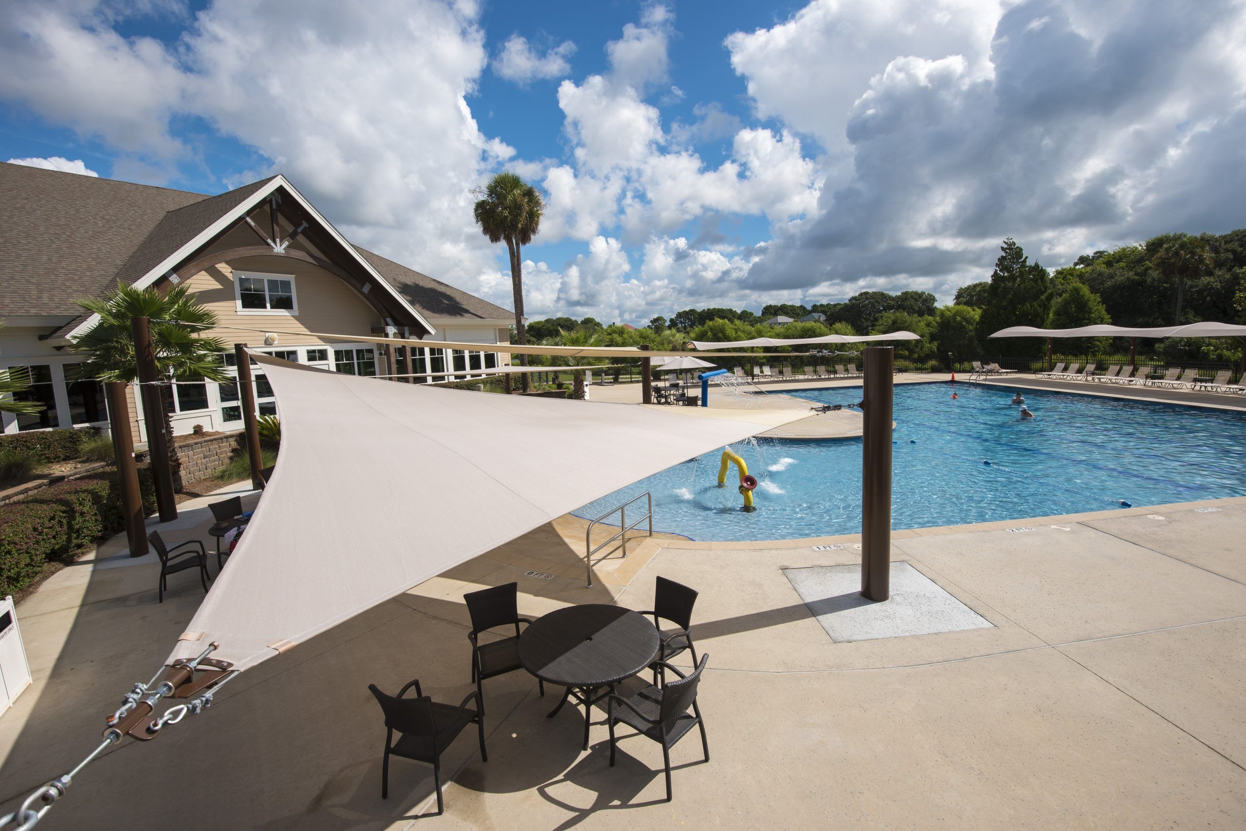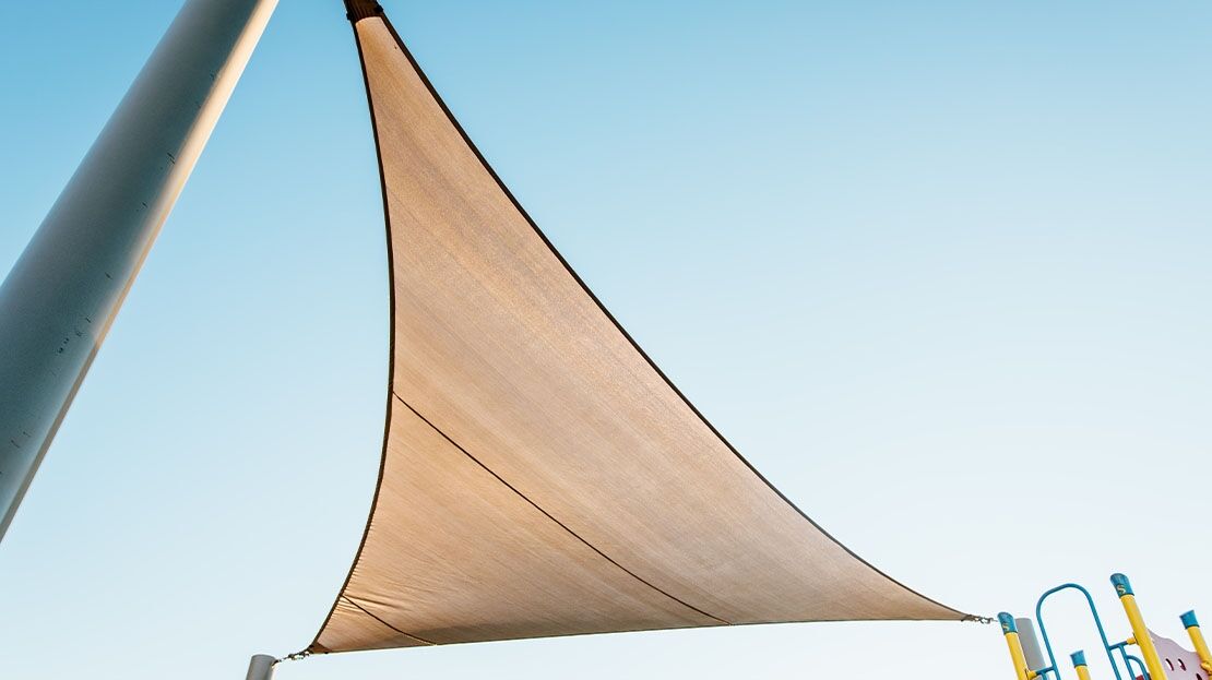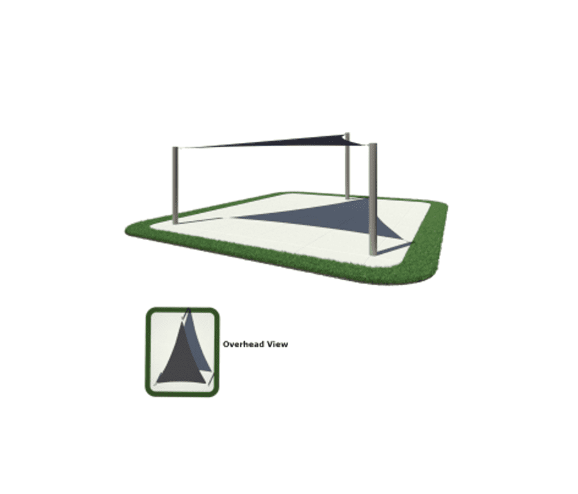 Triangular sails are 3-sided shade canopies that are attached to columns or wall brackets. They can be configured by using a single sail or designed to incorporate numerous sail shades using multiple columns and connection points. By using differing attachment elevations between numerous sails, you can create beautiful architectural design elements that will enhance the space. Shade sails should be limited to 50′ on the longest side and should not exceed a 2:1 ratio between the shortest side and the two longest sides averaged together.