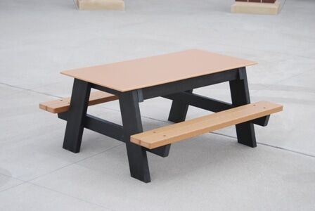 Made with a solid sheet plastic top specifically designed for use by children. The top allows children to write or play at the table. The seats are made with 2″ x 4″ resinwood slats, and the black support structure is made from a combination of 2″ x 6″ and 2″ x 4″ resinwood slats.