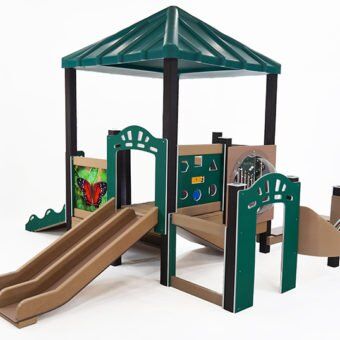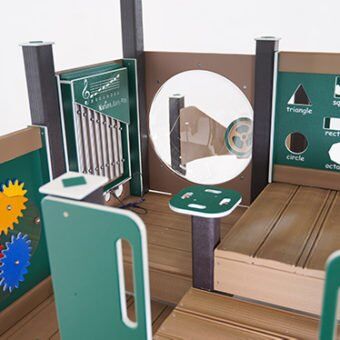 Our proprietary double slide has a surface with just enough texture to ensure confident sliding. Back at ground level, colorful gears in the interactive panel promote interest in mechanics and the sciences.