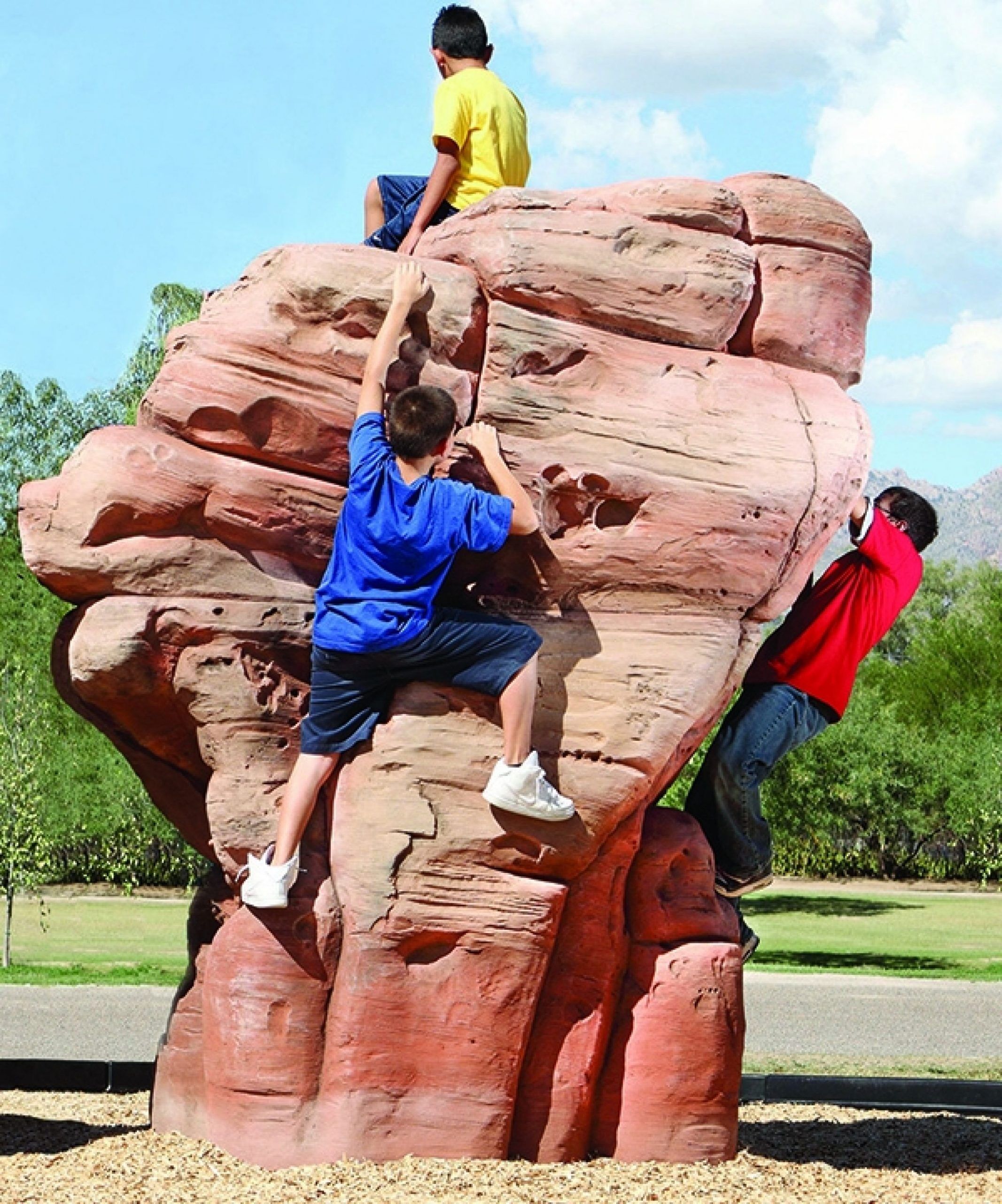 The large sandstone boulder boasts a stunning height of 8 feet giving children ages 5-12 a unique and authentic climbing challenge. The ample size of this rock climber allows up to 8 children to play together as they creatively scale the boulder. Consider combining large and medium playground boulders to create an arch to add even more rock climbing and active play opportunities. The NatureROCKS sandstone boulders are artfully designed from real rock outcroppings and hand painted to look and feel like sandstone. Each playground boulder is constructed of durable, weatherproof glass fiber reinforced concrete (GFRC). All boulders also feature built-in forklift channels to easily facilitate delivery and placement.