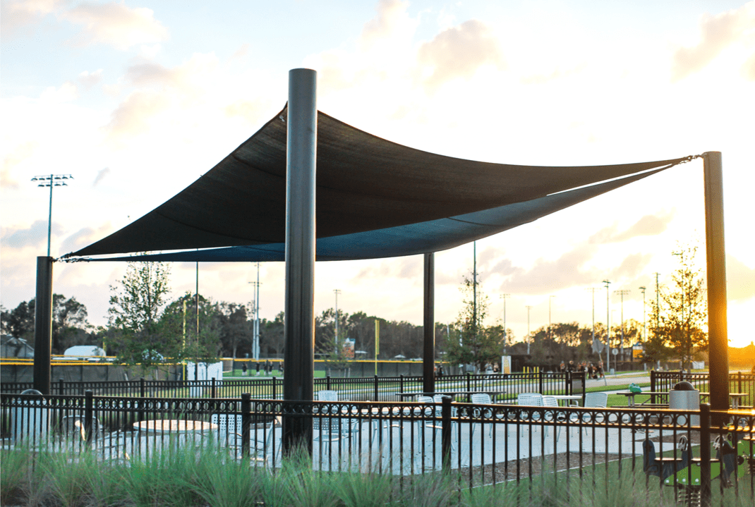 For custom shades and custom shade sails for your facility, you’ve come to the right place! First, we’ll determine the length and width of shade needed for your custom shade sail based on your site. Then, we’ll determine if you need a standard entry height of 8 ft., 10 ft., or 12 ft. or a custom entry height. Our designers and engineers will then put together a custom shade sail design.