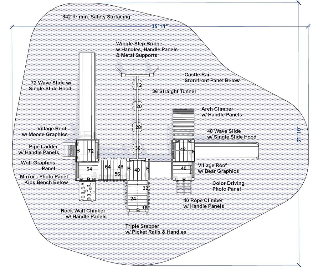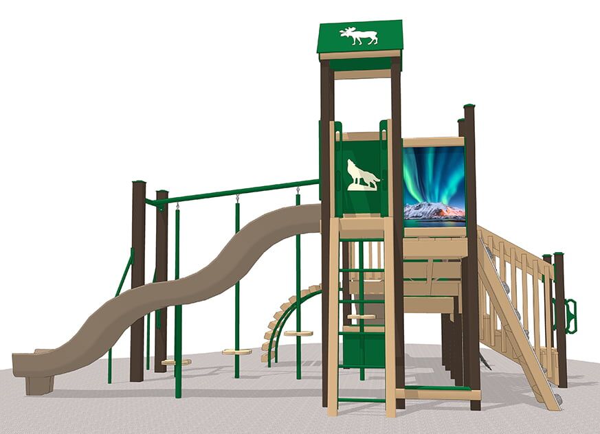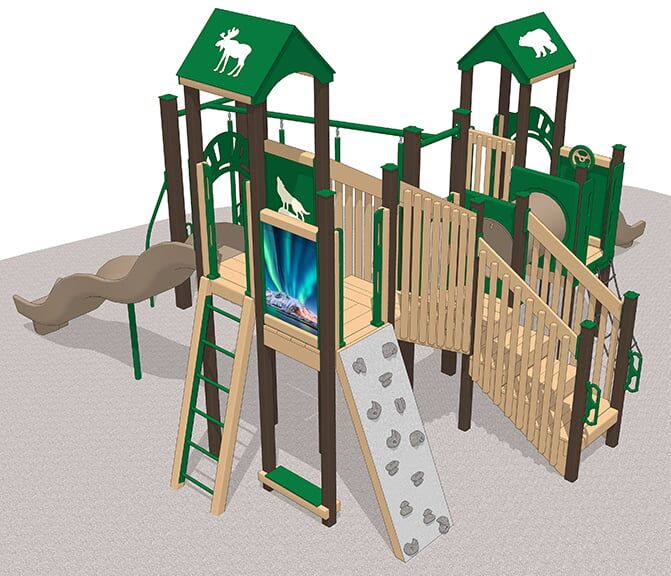 The Nordic Village playset brings just a little of the north woods theme to the playground. Brilliant photo panels on this playset depict the wild natural beauty of the Nordic countries. Engraved wild animals ramble through on panels and roofs throughout the playset, adding to the northern feel.