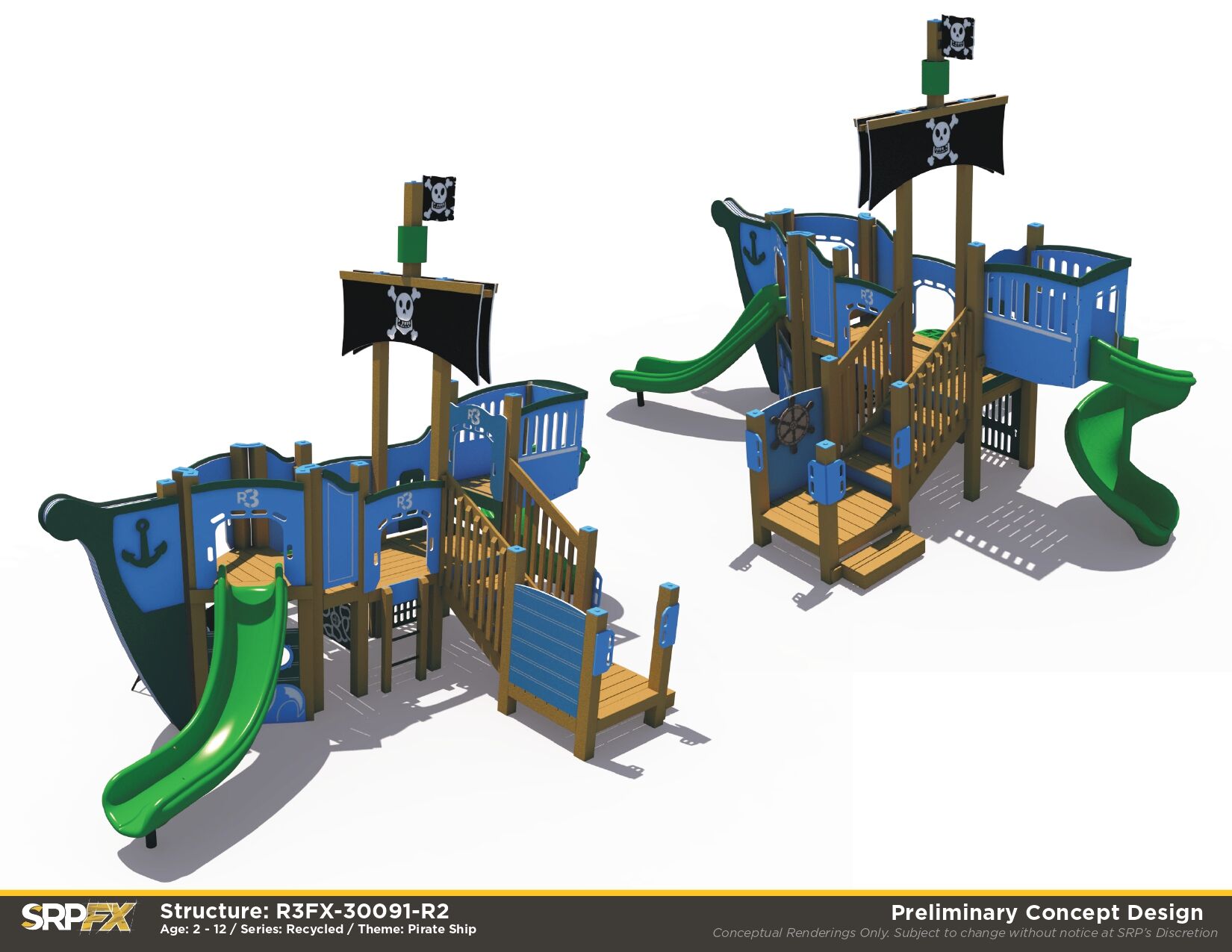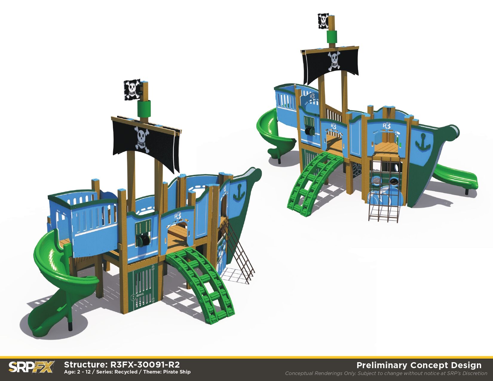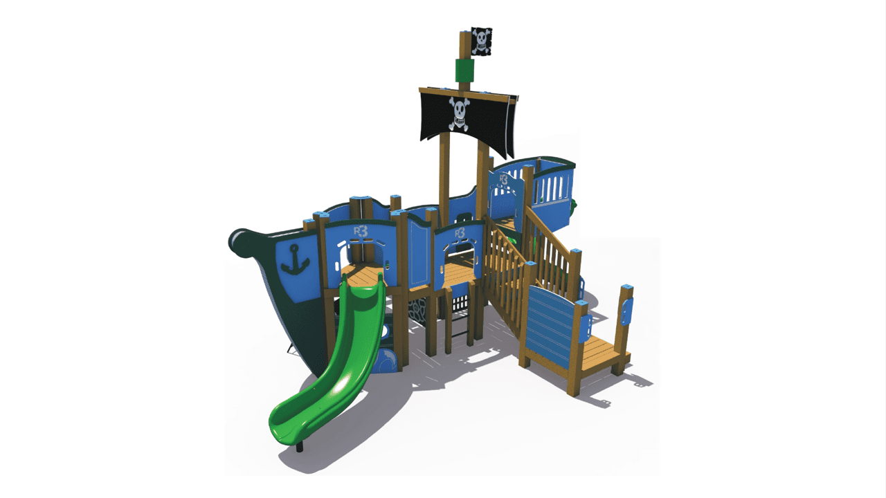The R3FX-30091 is a commercial-grade pirate themed playground. It features age-appropriate slides, climbers, and panels for children ages 2-12. The themed elements help to encourage dramatic play, so this pirate playground is great for schools, parks, and more.