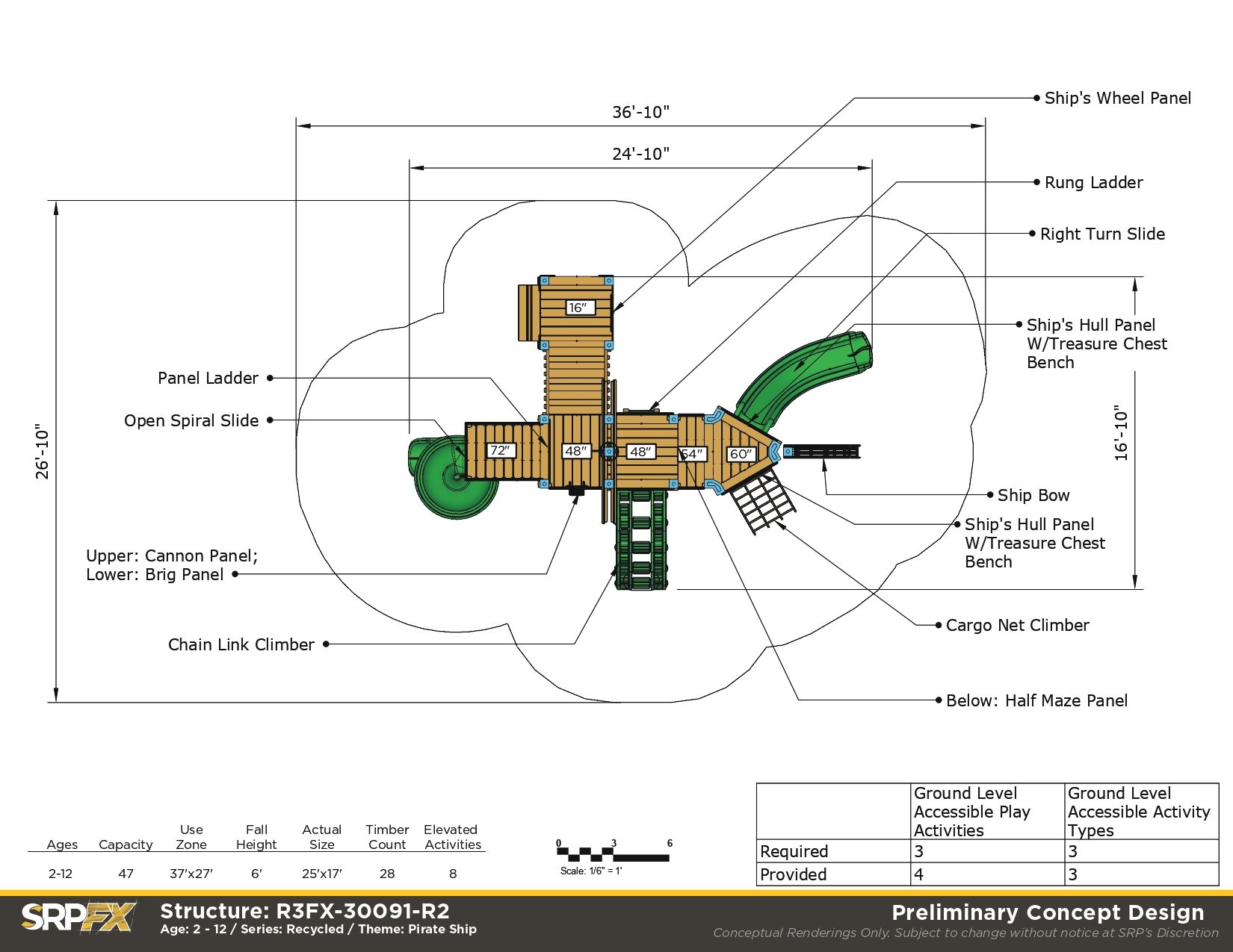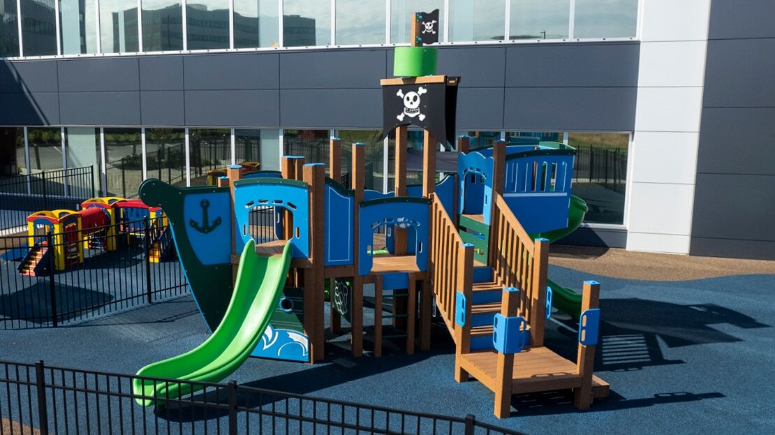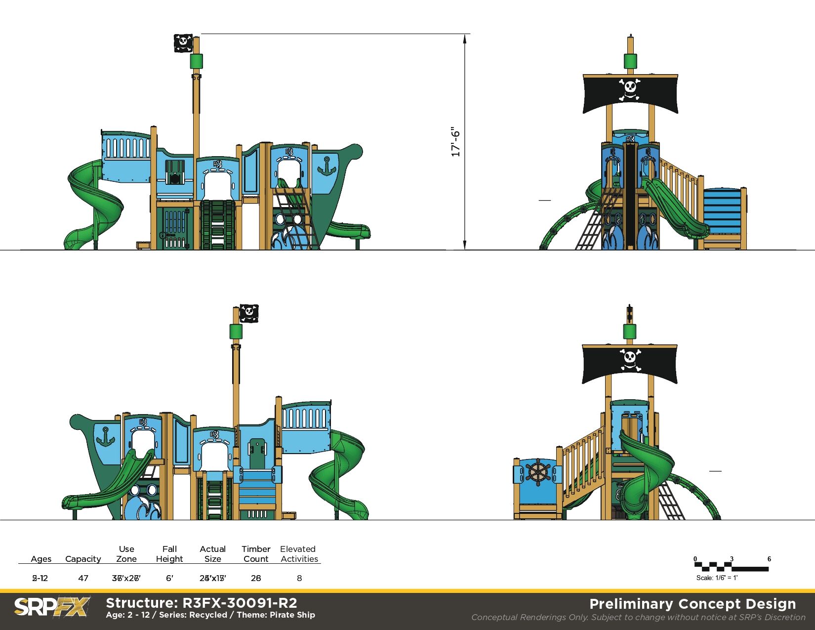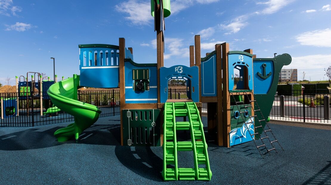 The R3FX-30091 is a commercial-grade pirate themed playground. It features age-appropriate slides, climbers, and panels for children ages 2-12. The themed elements help to encourage dramatic play, so this pirate playground is great for schools, parks, and more.