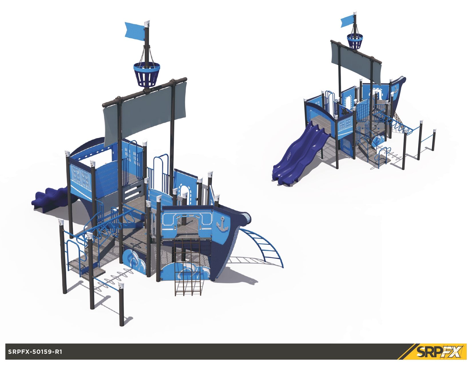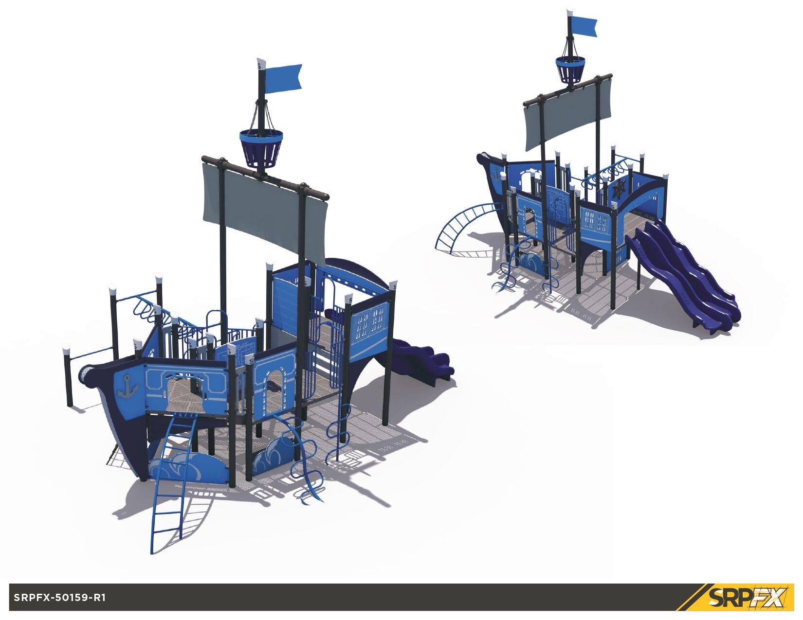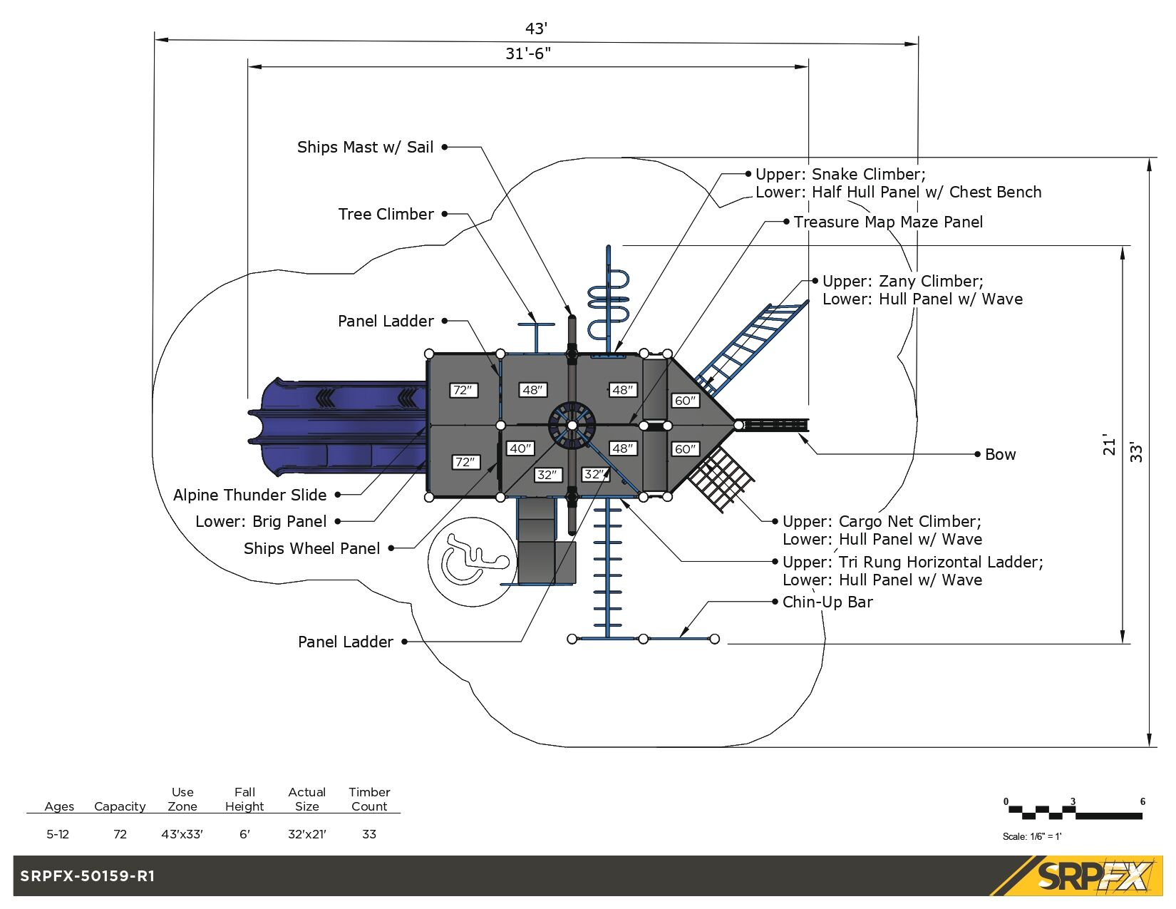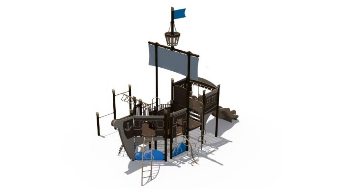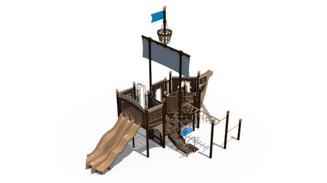 Argh! This themed playground, complete with a treasure maze, will surely bring out the pirate in your child! Great for a neighborhood park or near the ocean, this playground features tons of climbing elements, like our Cargo Net Climber, and our popular Alpine Thunder Slide.