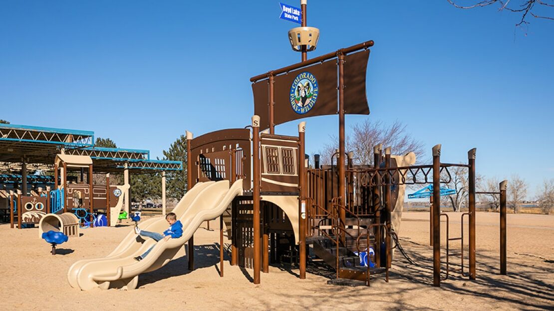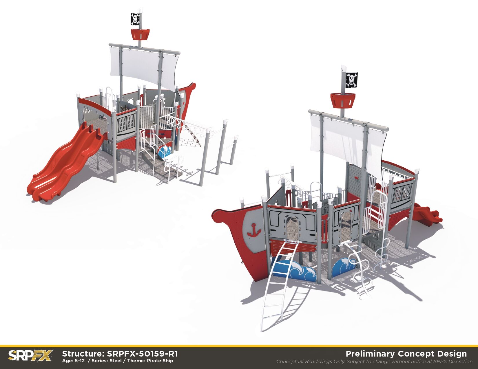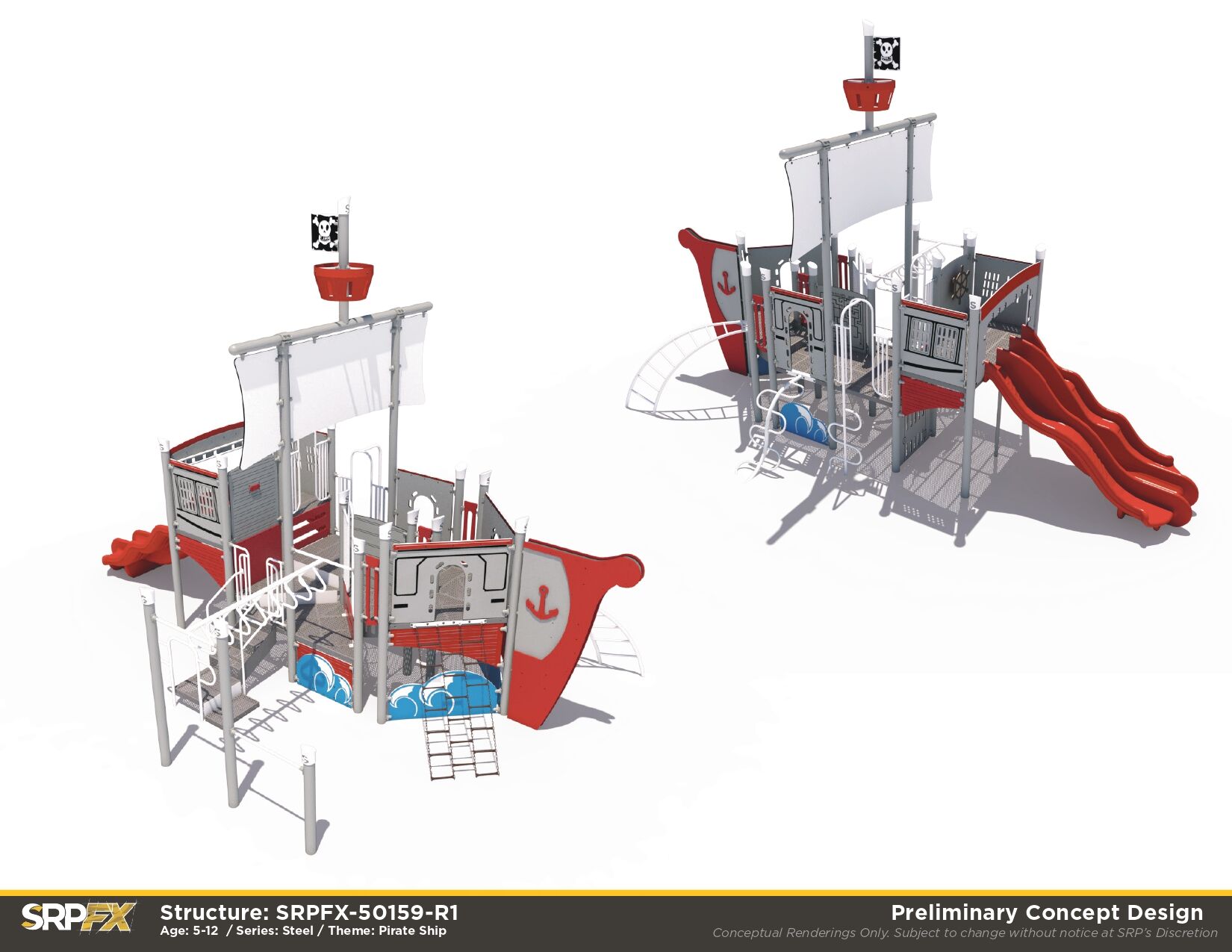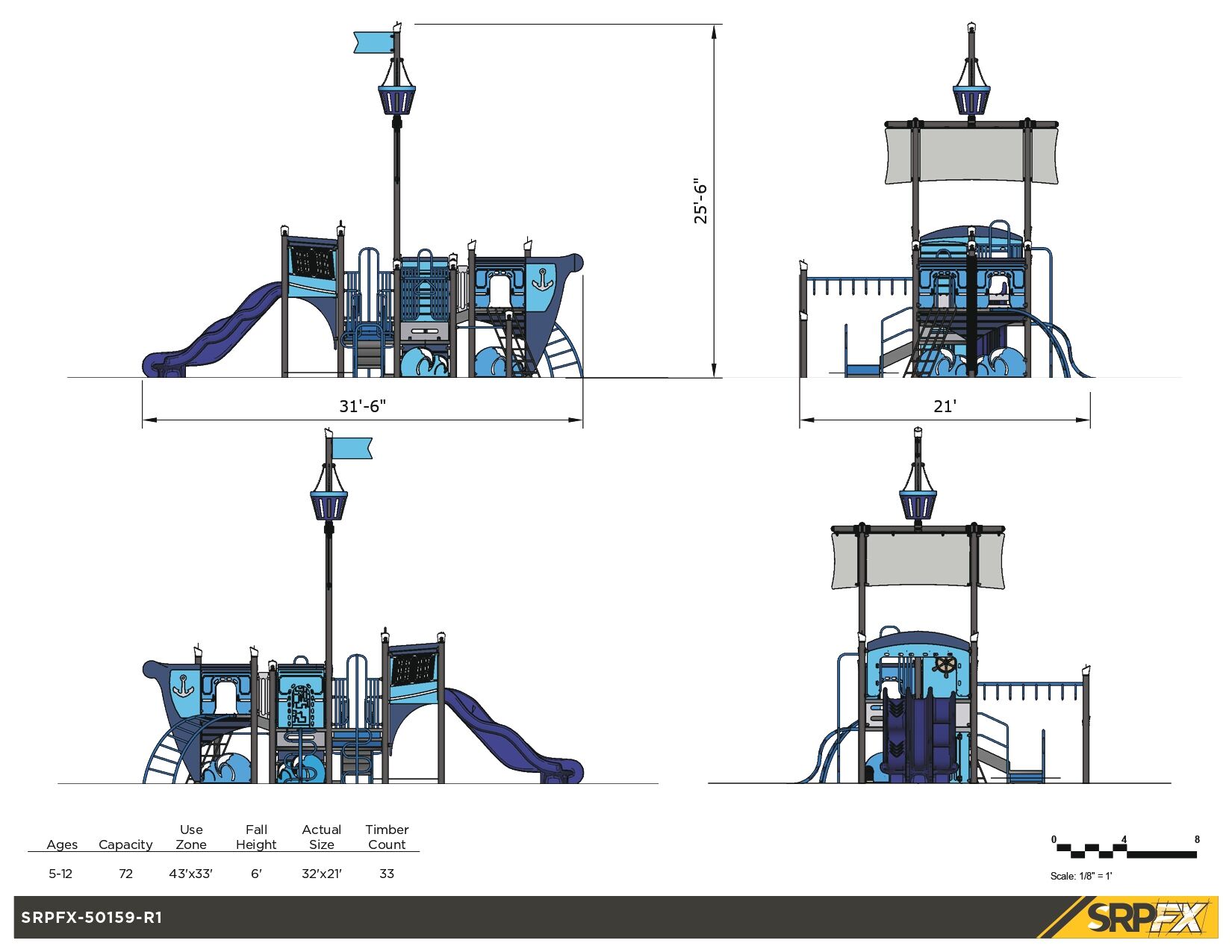 Argh! This themed playground, complete with a treasure maze, will surely bring out the pirate in your child! Great for a neighborhood park or near the ocean, this playground features tons of climbing elements, like our Cargo Net Climber, and our popular Alpine Thunder Slide.