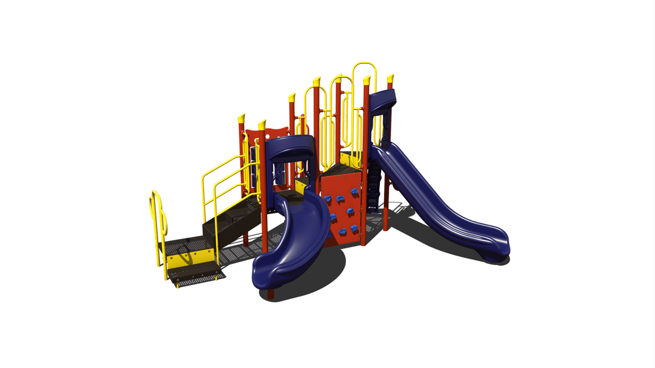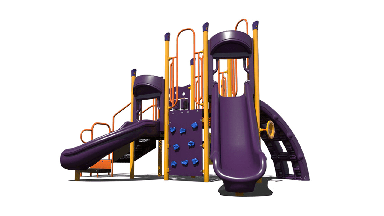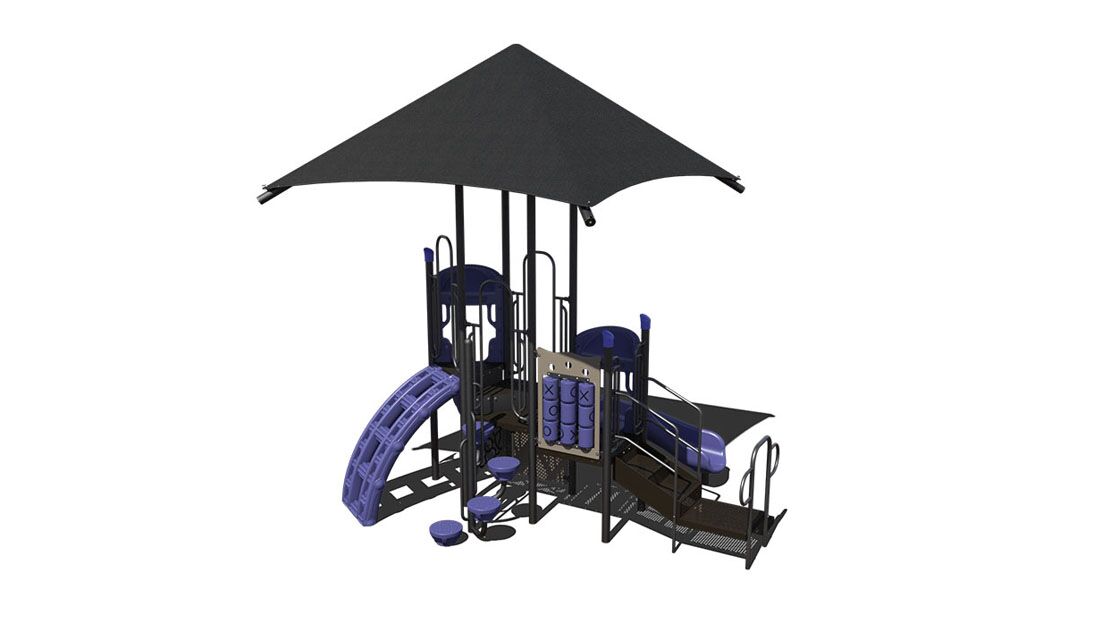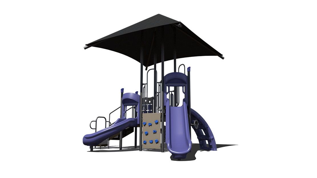 This play unit provides a shaded cover that allows children to participate in active play while being protection from harmful UV rays. This play unit is best for children ages 2-12 and offers activities for children in every stage of development. The chain link climber, lily pad spiral climber and rock wall climbers allows children of all ages develop climbing skills including climbing development for younger children. In addition, this unit has a tic- tac-toe panel and a post mount steering wheel, allowing children to take part in interactive games along and imaginary play. This structure includes a right turn single bedway slide and a single bedway straight slide. This unit is ideal for childcare and church play.