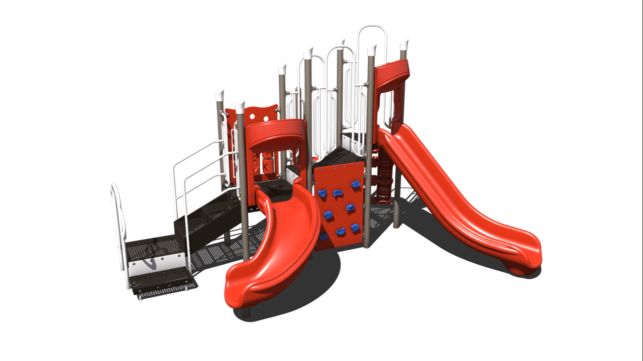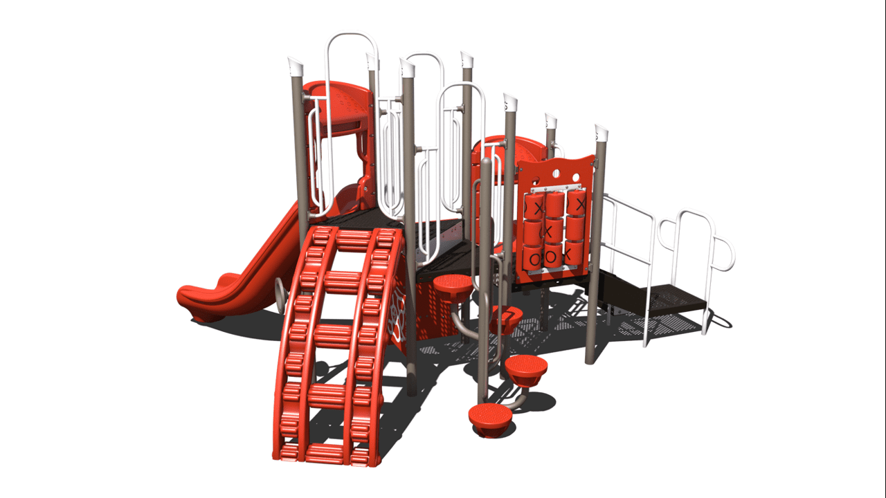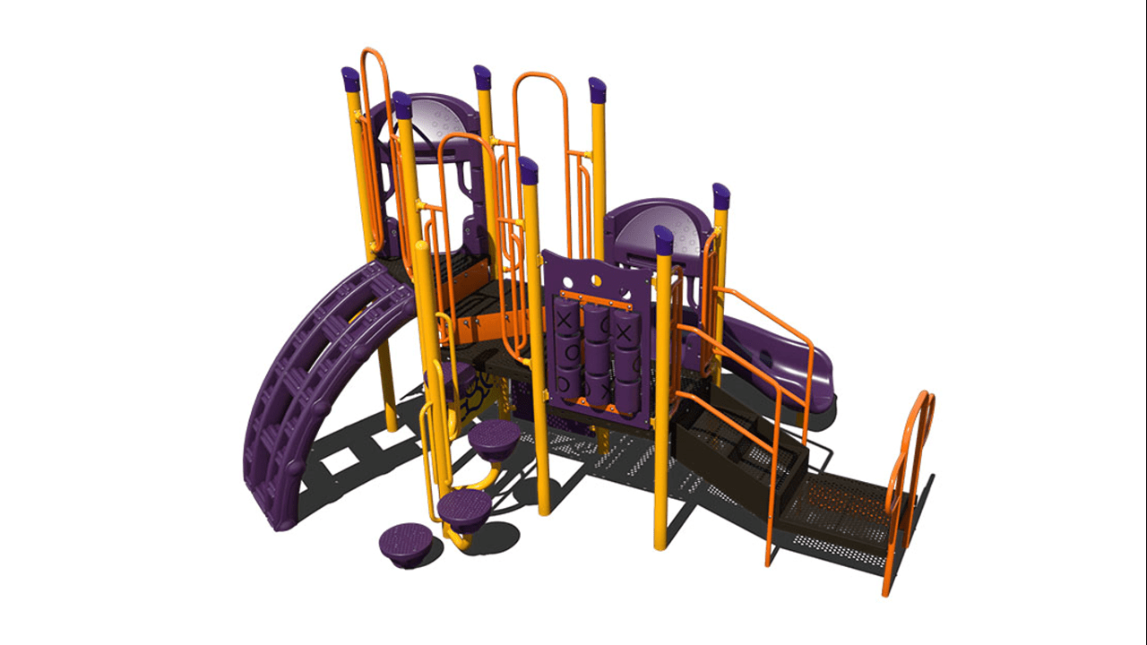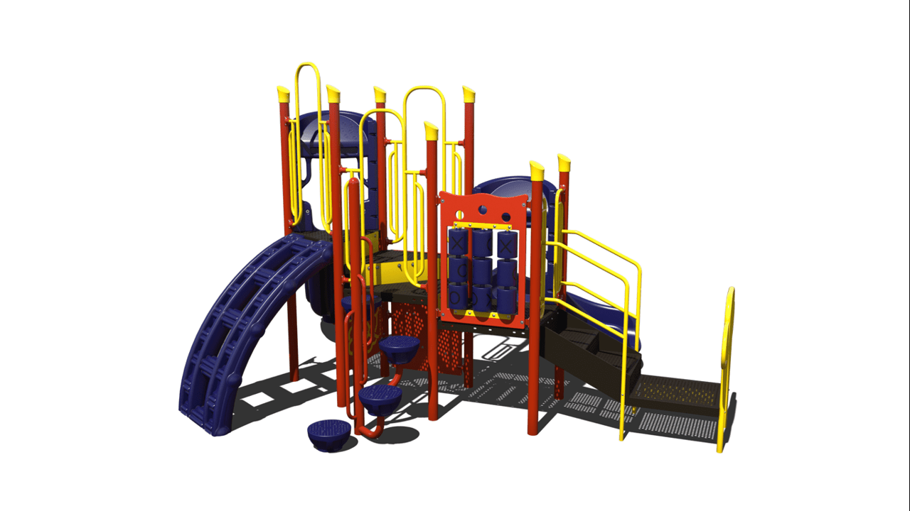 This play unit provides a shaded cover that allows children to participate in active play while being protection from harmful UV rays. This play unit is best for children ages 2-12 and offers activities for children in every stage of development. The chain link climber, lily pad spiral climber and rock wall climbers allows children of all ages develop climbing skills including climbing development for younger children. In addition, this unit has a tic- tac-toe panel and a post mount steering wheel, allowing children to take part in interactive games along and imaginary play. This structure includes a right turn single bedway slide and a single bedway straight slide. This unit is ideal for childcare and church play.