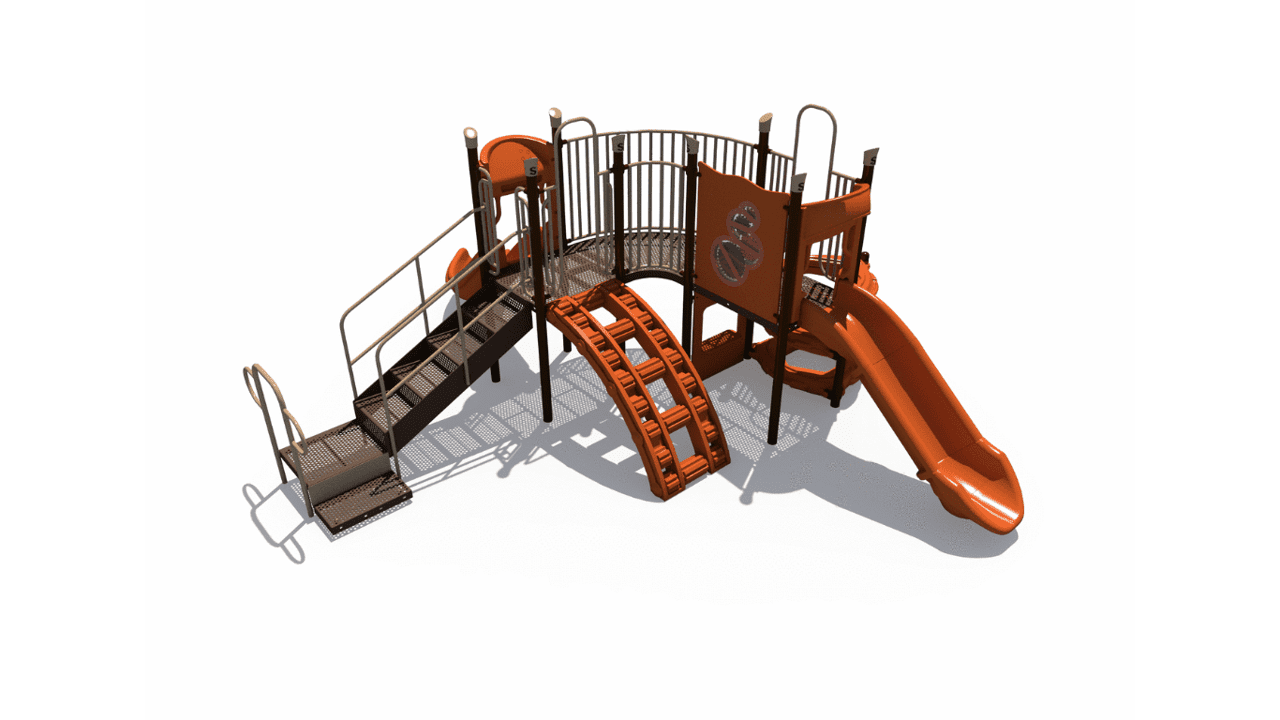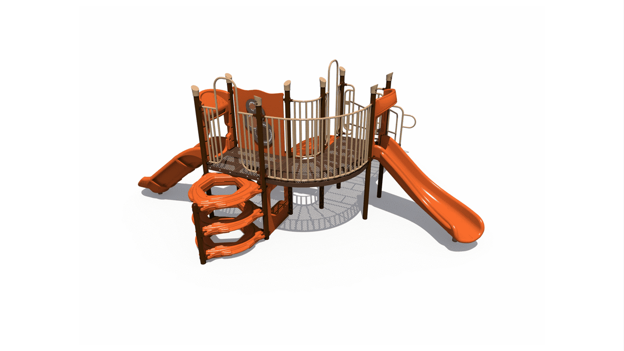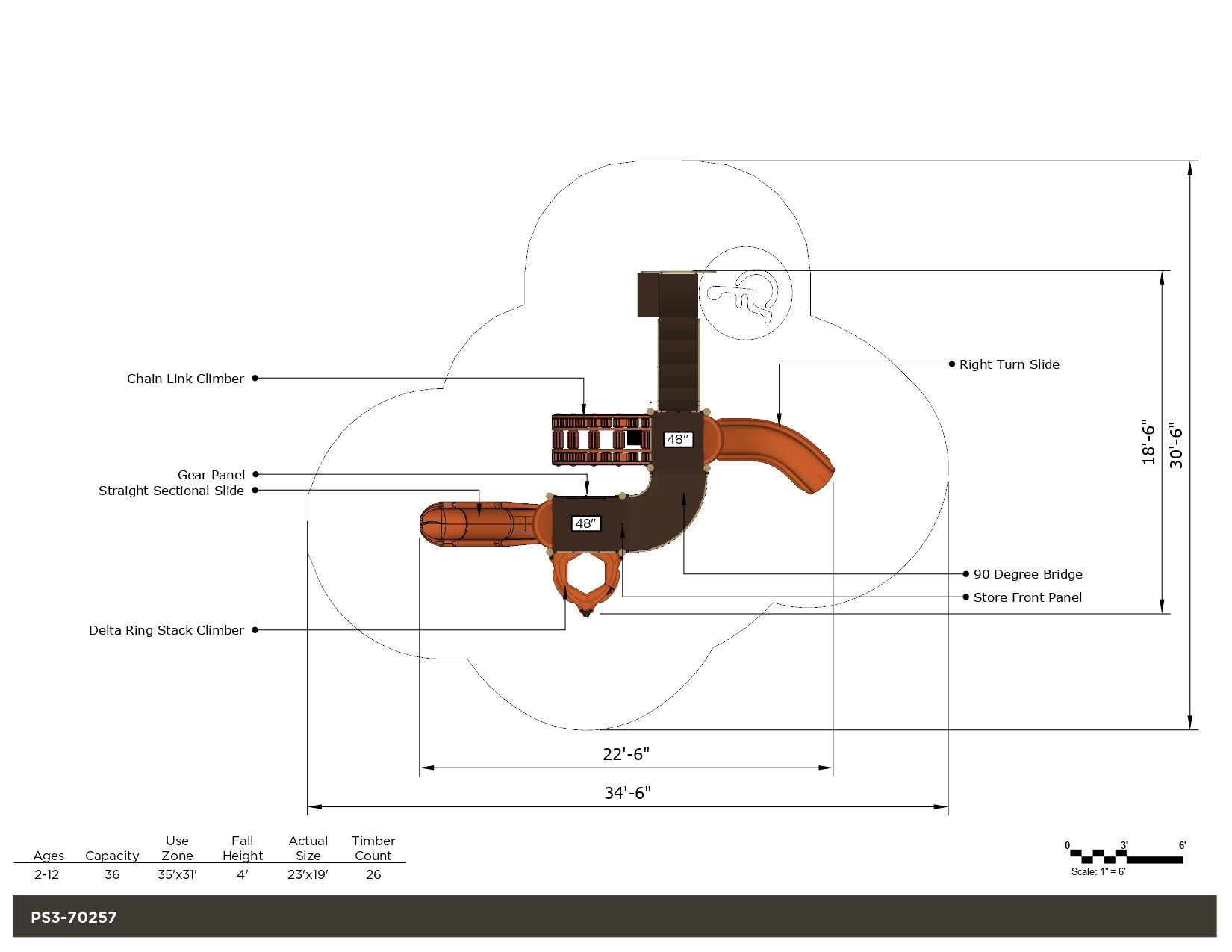 Loaded with plenty of activities such as multiple slides, our Delta Climber, and deck- and ground-level activities, there is something for everyone on the PS3-70257 steel playground structure. Customize your playground with our many color choices for the posts, decks, slides, climbers, and activity panels. What’s more, this playground for children ages 2-12 years of age only needs 35ft. x 31ft. of space for children to play!
