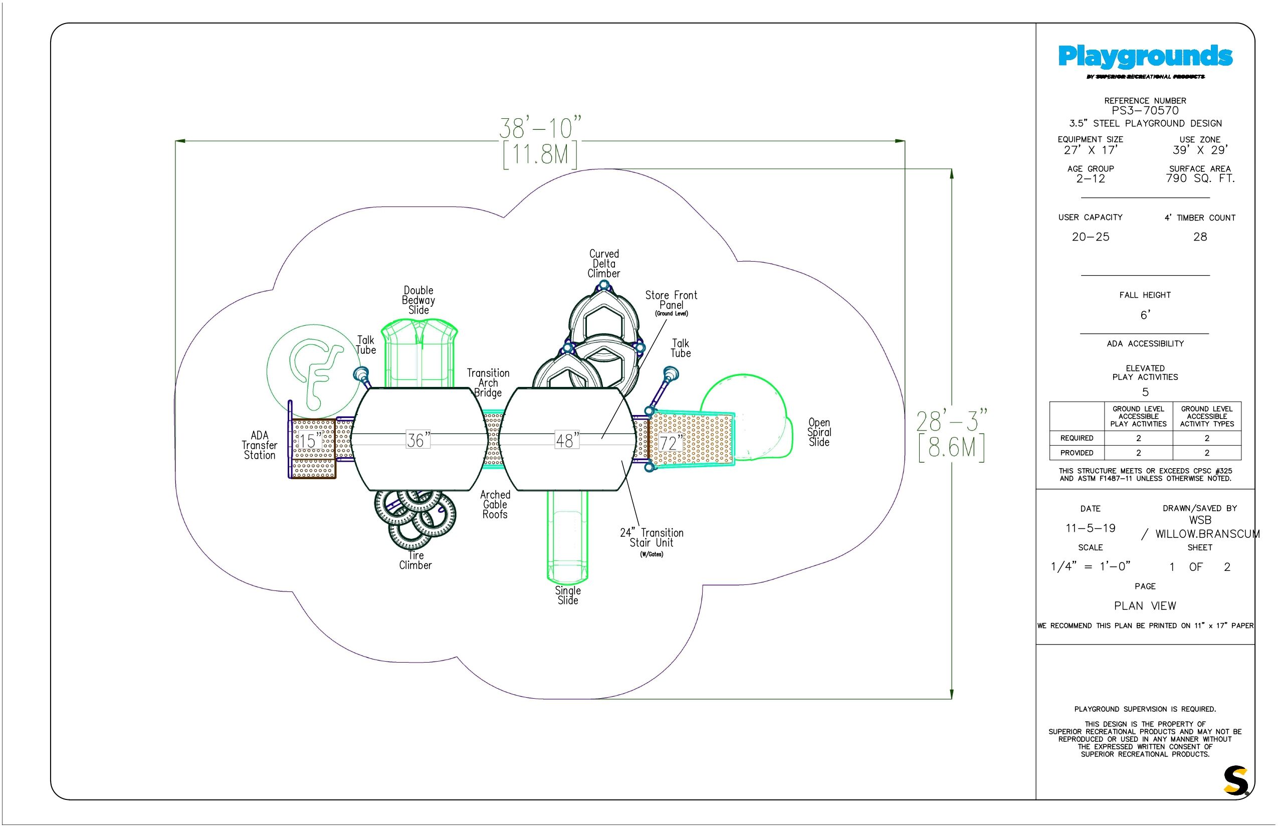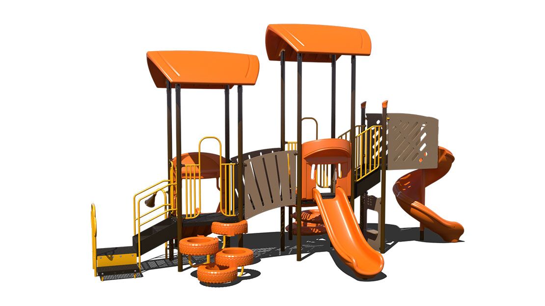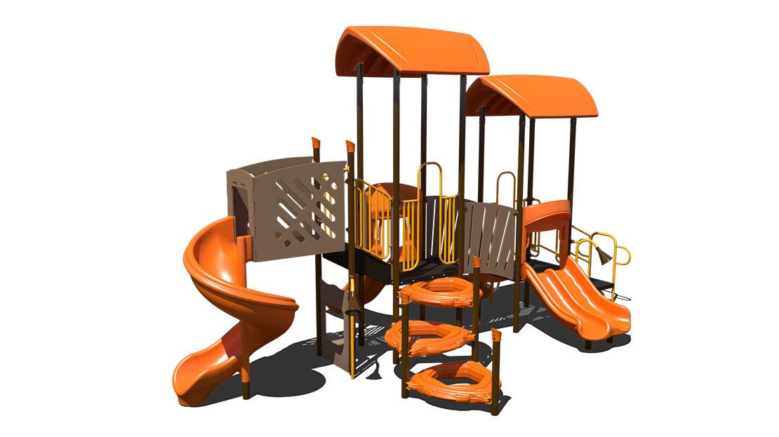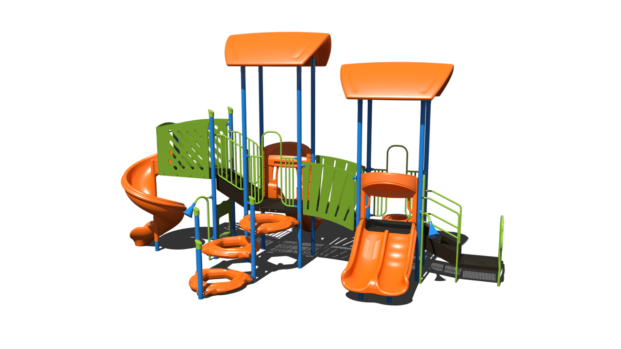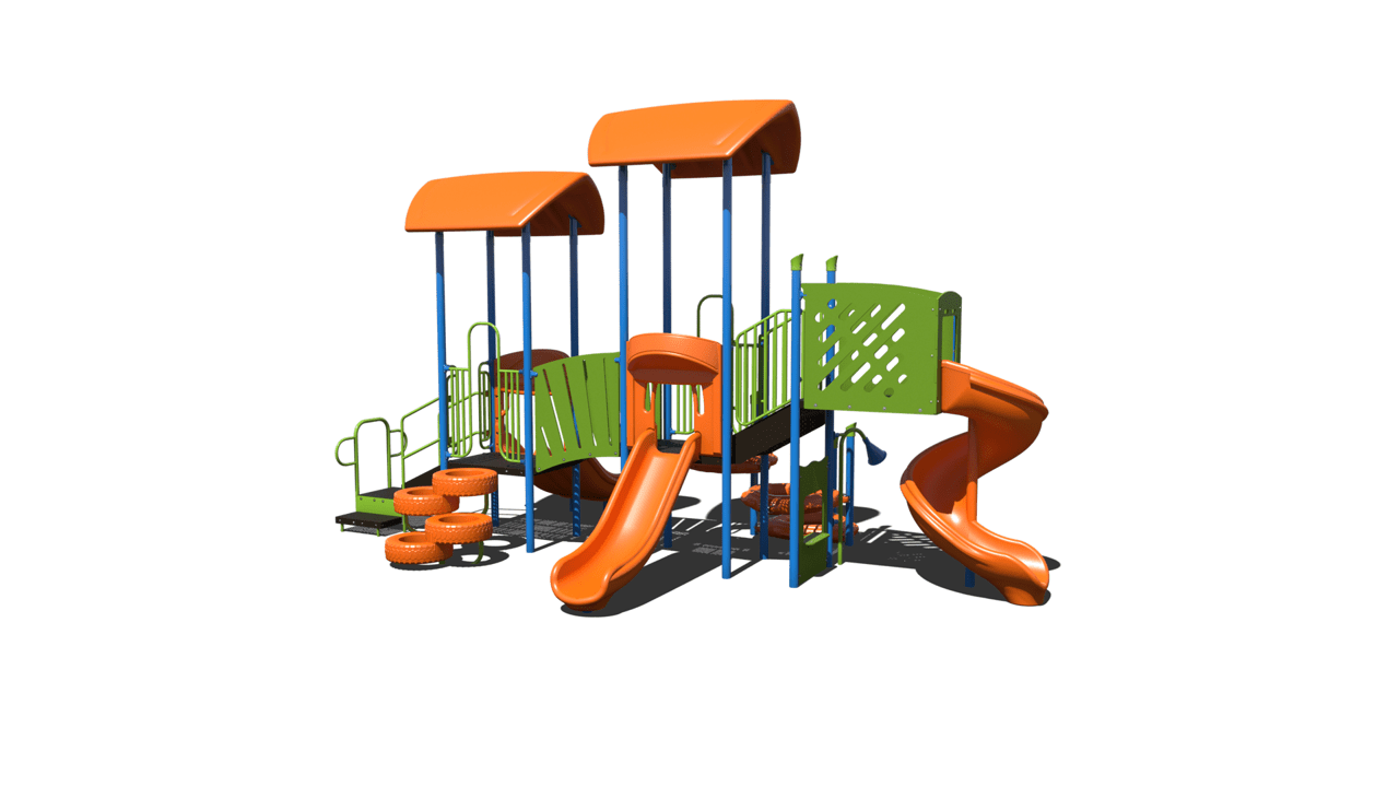 The PS3-70570 is the perfect balance between active play and imaginative play. This playground is equip with three slides allowing a capacity of 20-25 children. The climbing features include a curved delta climber and a tire climber. This playground will ensure fun, active play for children ages 2-12 years. This 27’ x 17’ structure is the perfect addition to local recreational parks and elementary schools.