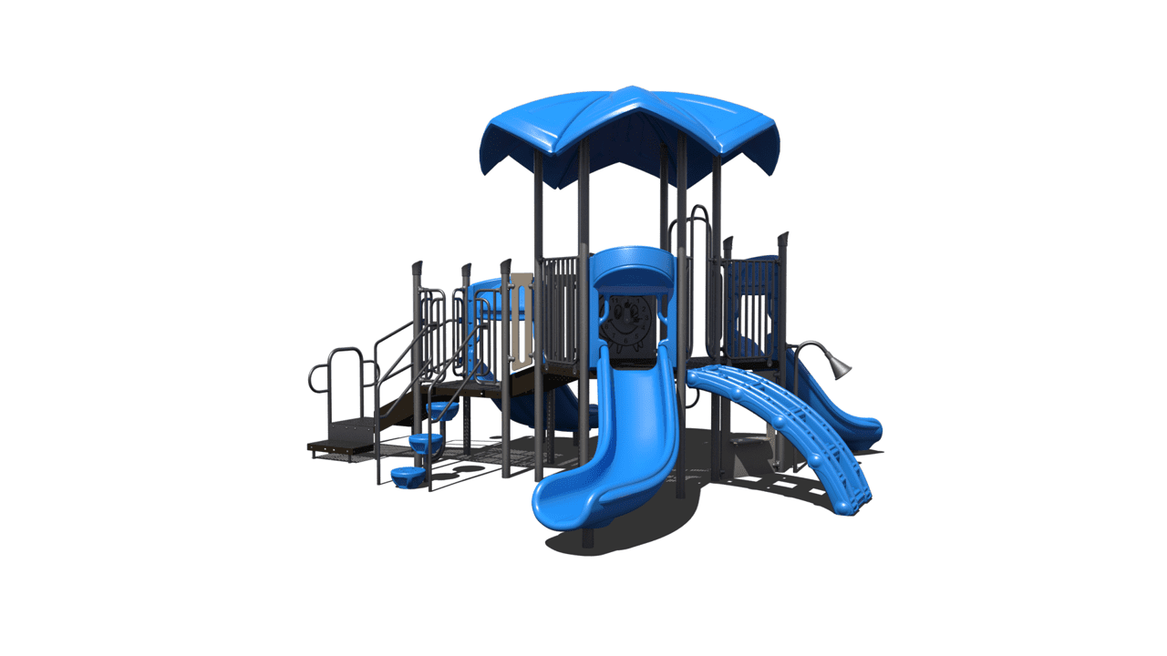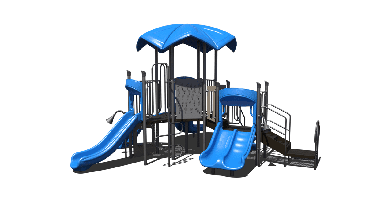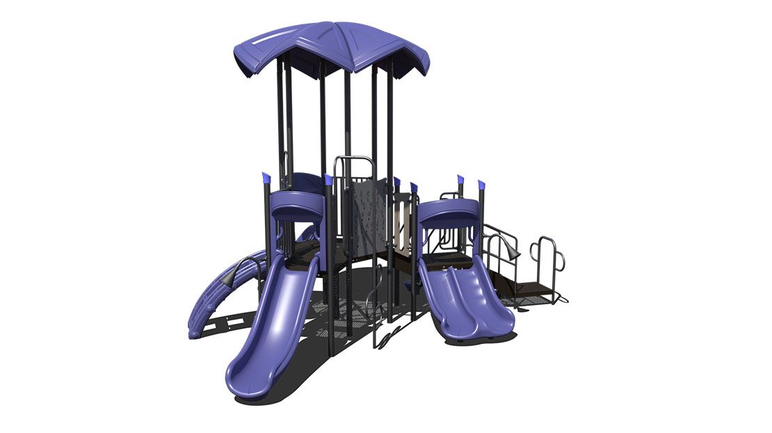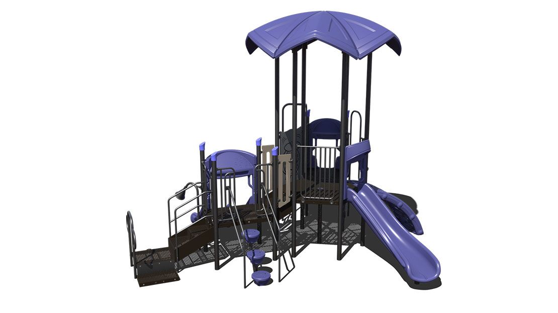 The PS3-70573 is early childhood focused around ages 2-5 years. The structure has a chain link climber and a lily pad climber to promote active play. The playground has a right turn slide, straight single slide and a straight double slide as a reward to climbing and maneuvering throughout the course. Other attributes include a talk tube for imaginative play.