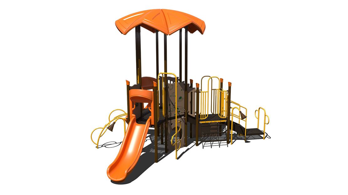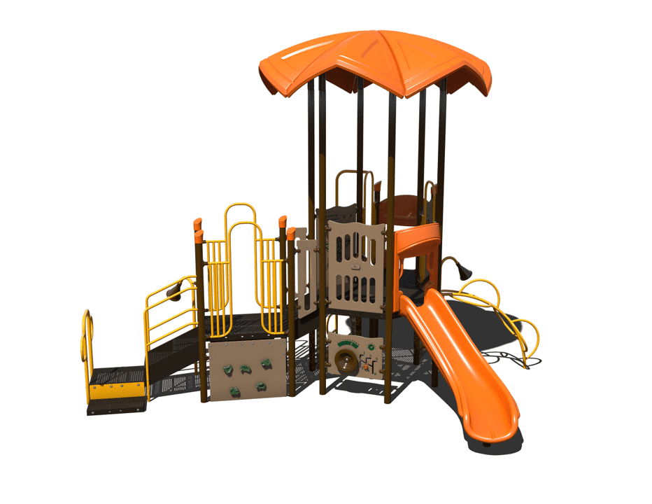 The PS3-70574 play structure is ideal for imaginative and physical play for younger children. This structure helps develop children’s imaginative and hands on problem solving skills with the addition of the alien maze panel. Play skills can also be developed with the use of the rock climbing wall, cargo climber, half-moon climber and the tree climber. The structure is equip with two awarding slides. This structure is perfect for early childhood development.
