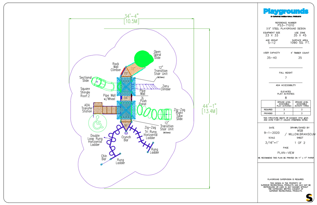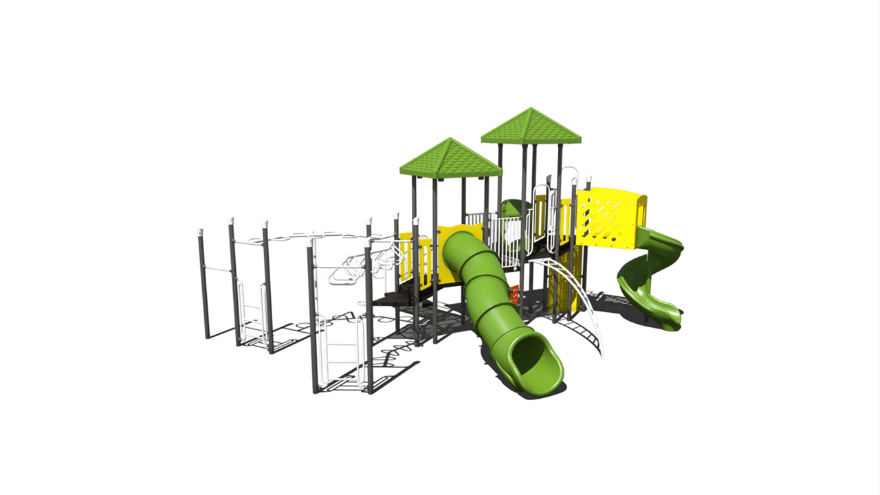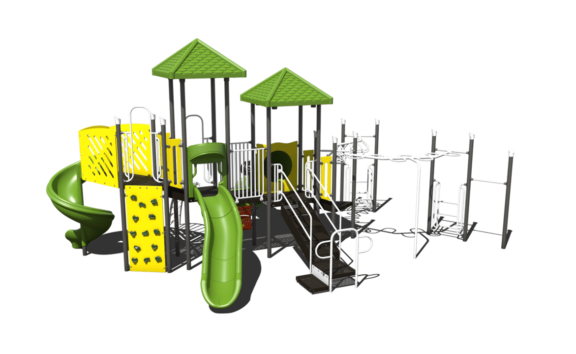 Playground PS3-71010 is designed for the adventurer. A spiral slide and tube slide exit from tall decks. There are also a variety of climbers and ground level play. ADA accessible and you can choose your own custom colors!