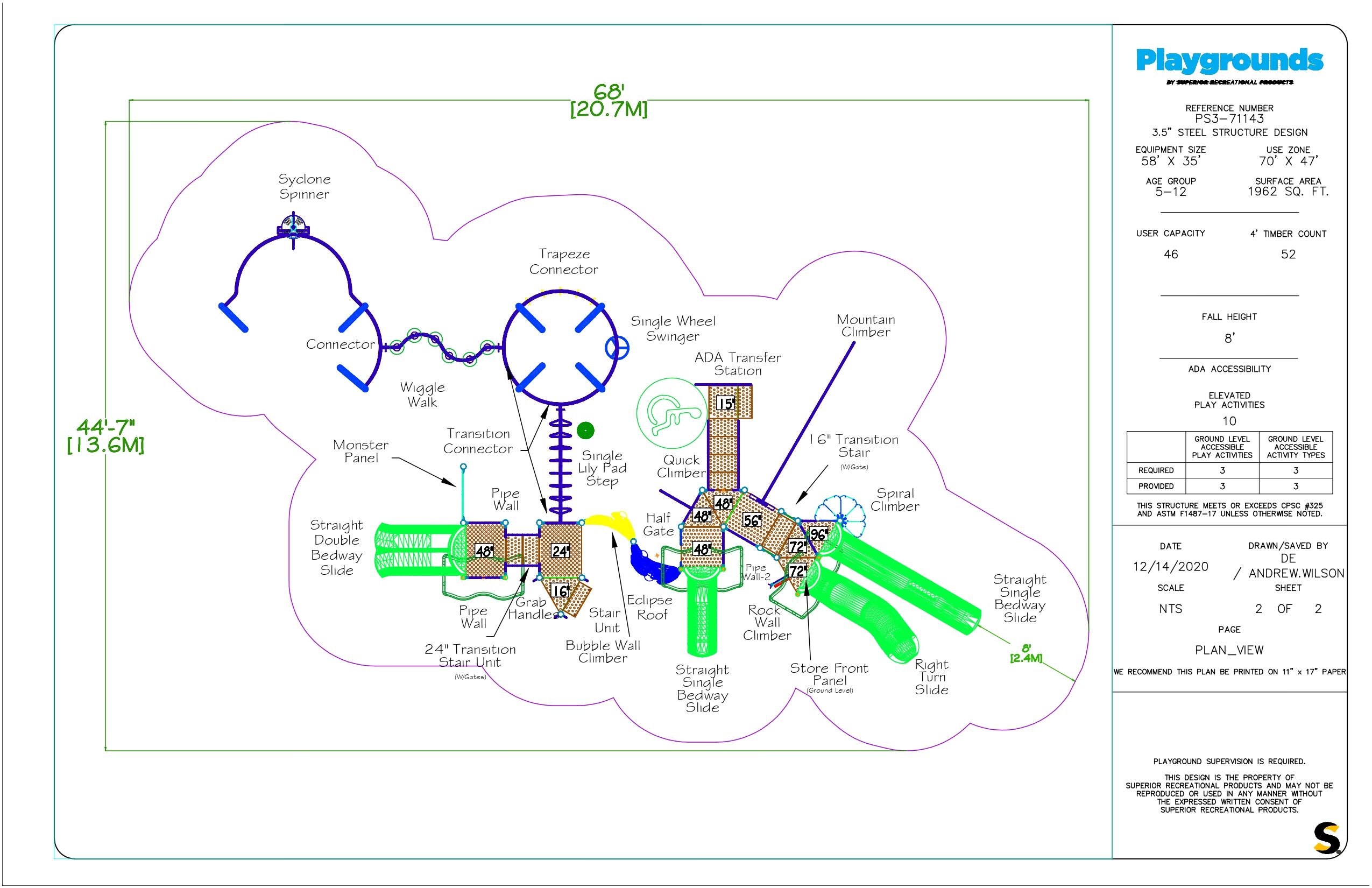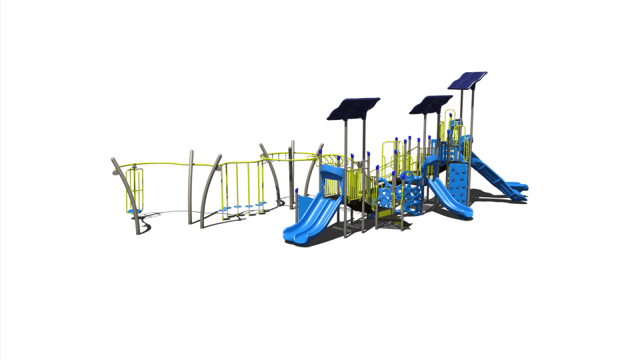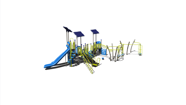 This 2-for-1 playground features elements of a traditional playground and a challenge course. Half of the playground features items that count encourage racing like our Wiggle Walk, trapeze rings, and an overhead ladder. These obstacle course-like elements connect to a deck that features our Bubble Wall Climber. The other half of the playground includes slides, activity panels, and even more climbers. This large playground would make a great addition to elementary school playgrounds or park playgrounds.