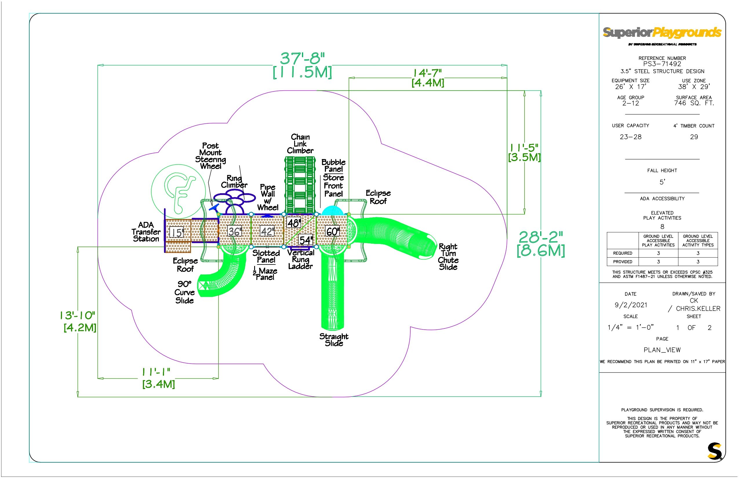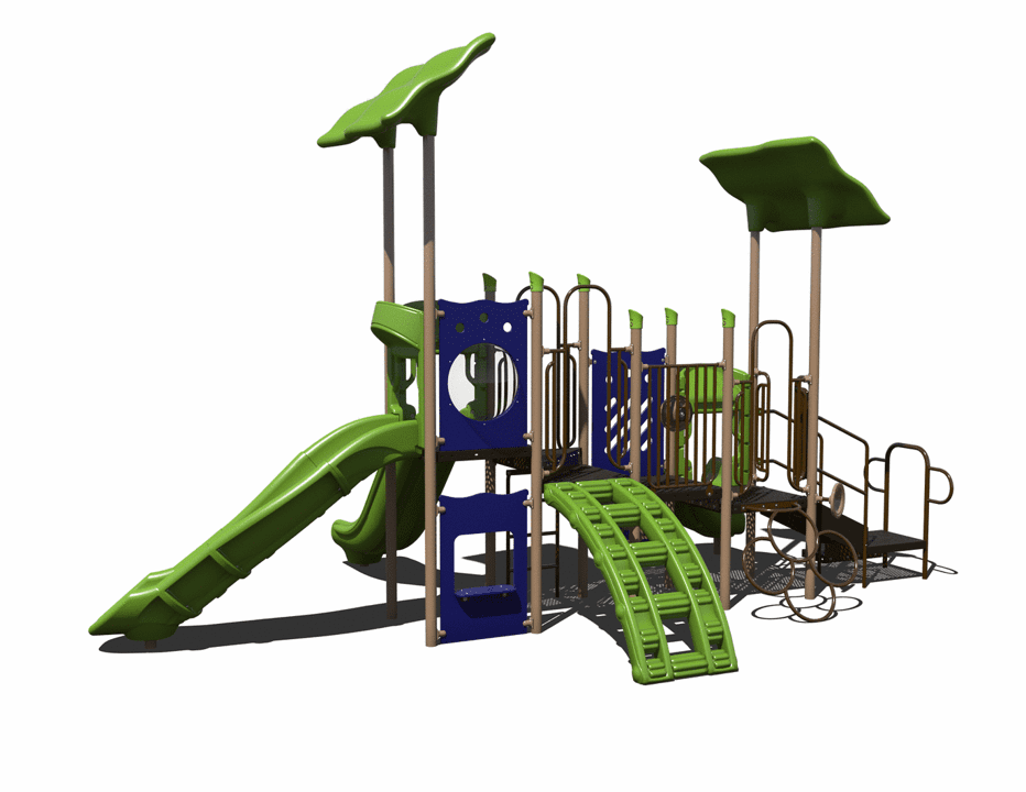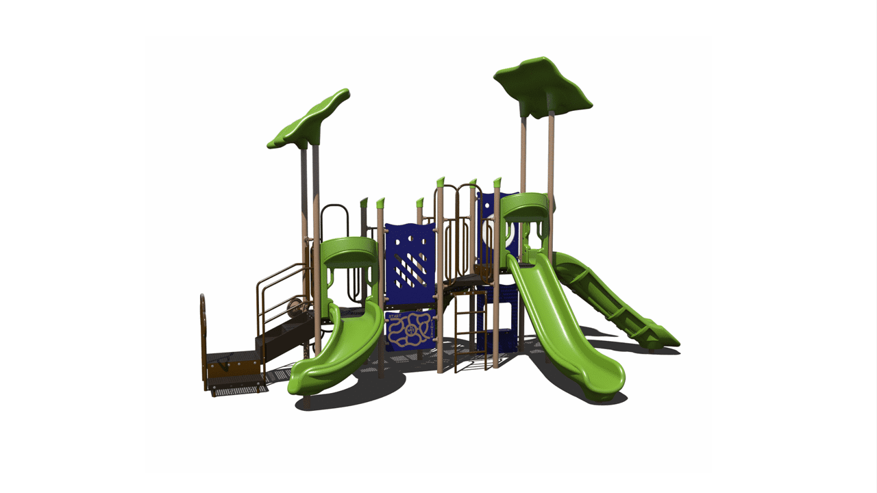Featuring three slides, our PS3-71492 is sure to get children ages 2-12 excited. With a low deck height (3′) for smaller children and a higher deck height (5′) for older children, this playground is perfect for customers looking to cater to a wide age range like subdivisions, parks, and churches. Children will challenge themselves to one of three playground climbers (or just take the stairs!) to climb to the top of this playground so they can slide down the various slides. Additionally, children can play with the deck-level or ground-level activity panels.