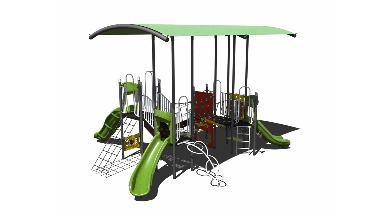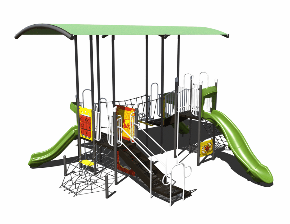 Our PS3-71613 is a mid-size playground designed for children ages 5-12. With its modern design, this commercial playground is suitable for elementary schools, parks, community centers, and more! There are three slides, four climbers, one bridge, and plenty of interactive play panels to keep children busy. What’s more, this playground includes three net activities, which is one of the most popular playground components. Also on this playground is our Barrel Dome playground shade, providing shade for almost the whole playground.