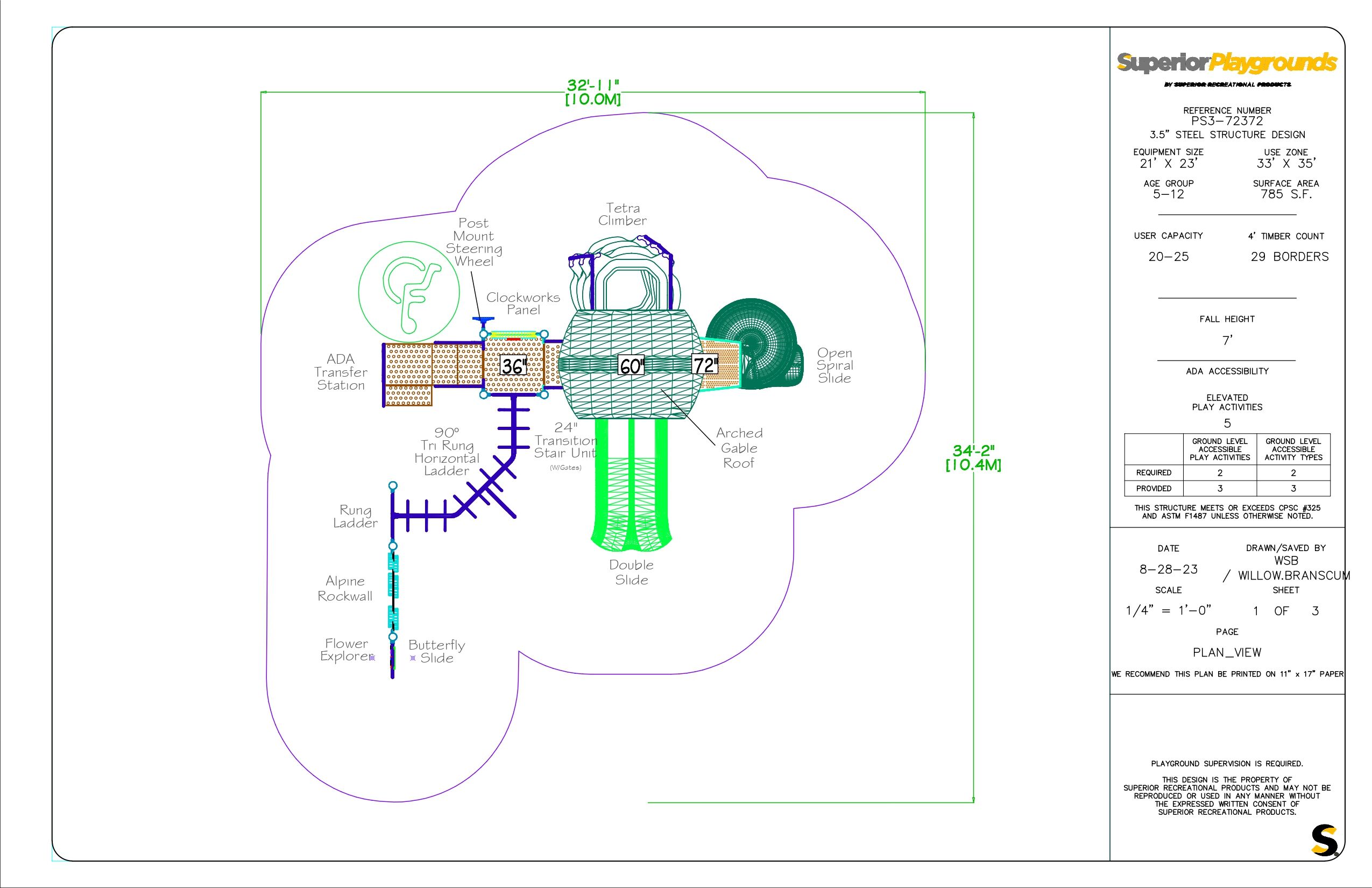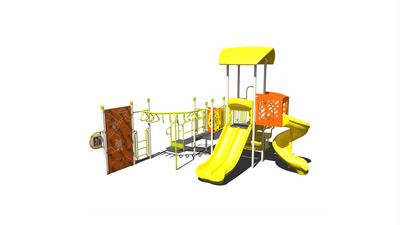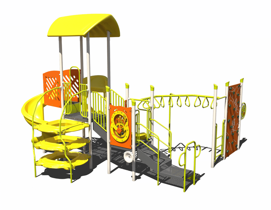 The PS3-72372 is an outdoor steel playground designed for children ages 5-12. It’s designed with integrated shade and numerous slides, climbers, and play panels that add great play value to schools or parks.