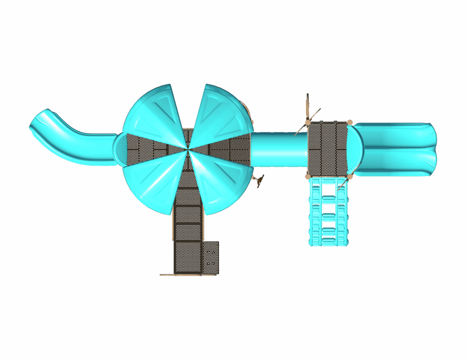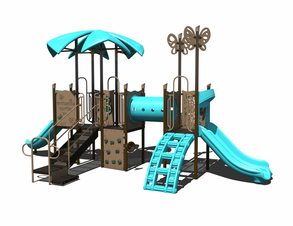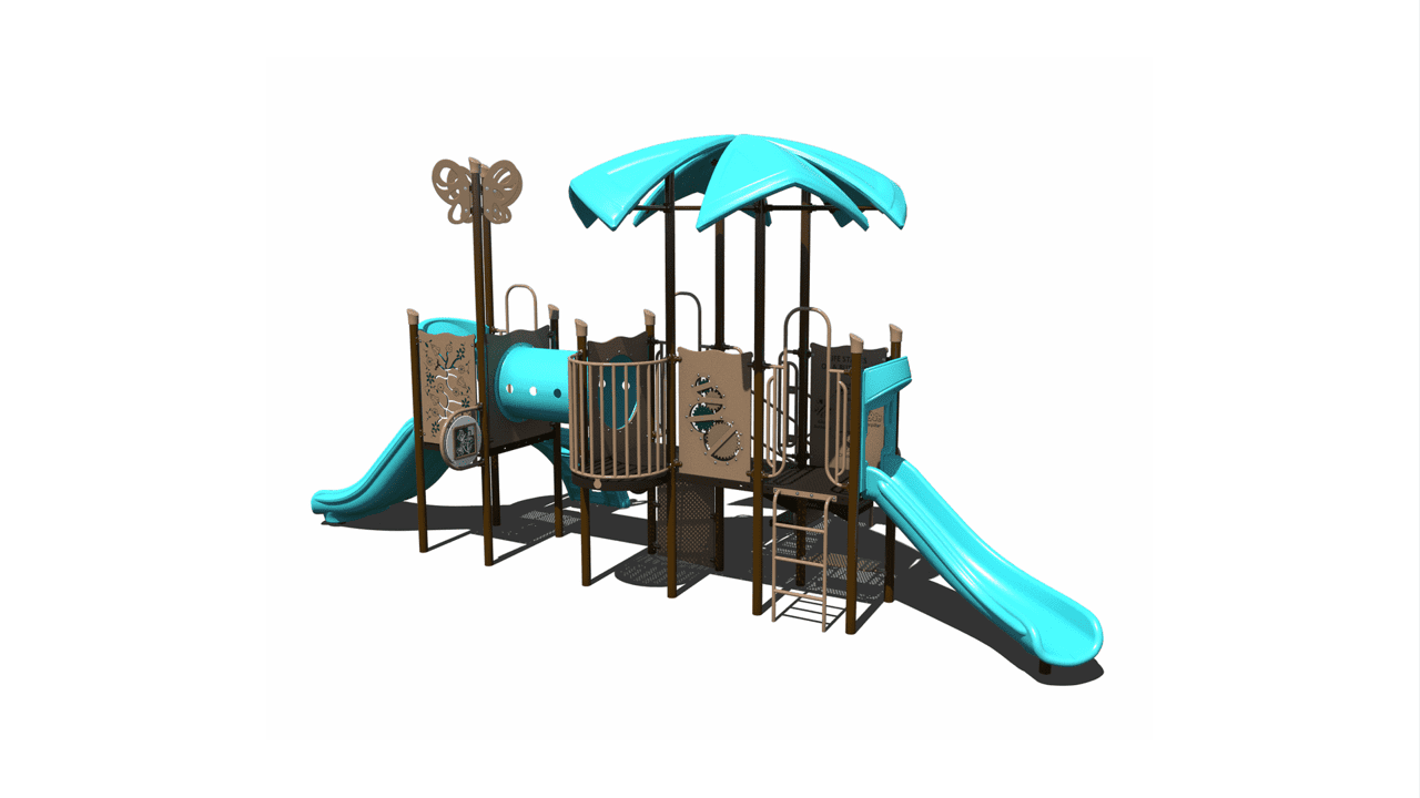 The PS3-72374 is a commercial-grade steel playground designed for children ages 2-12. It is equipped with an integrated shade, slides, climbers, and play panels that add great play value to schools or parks.