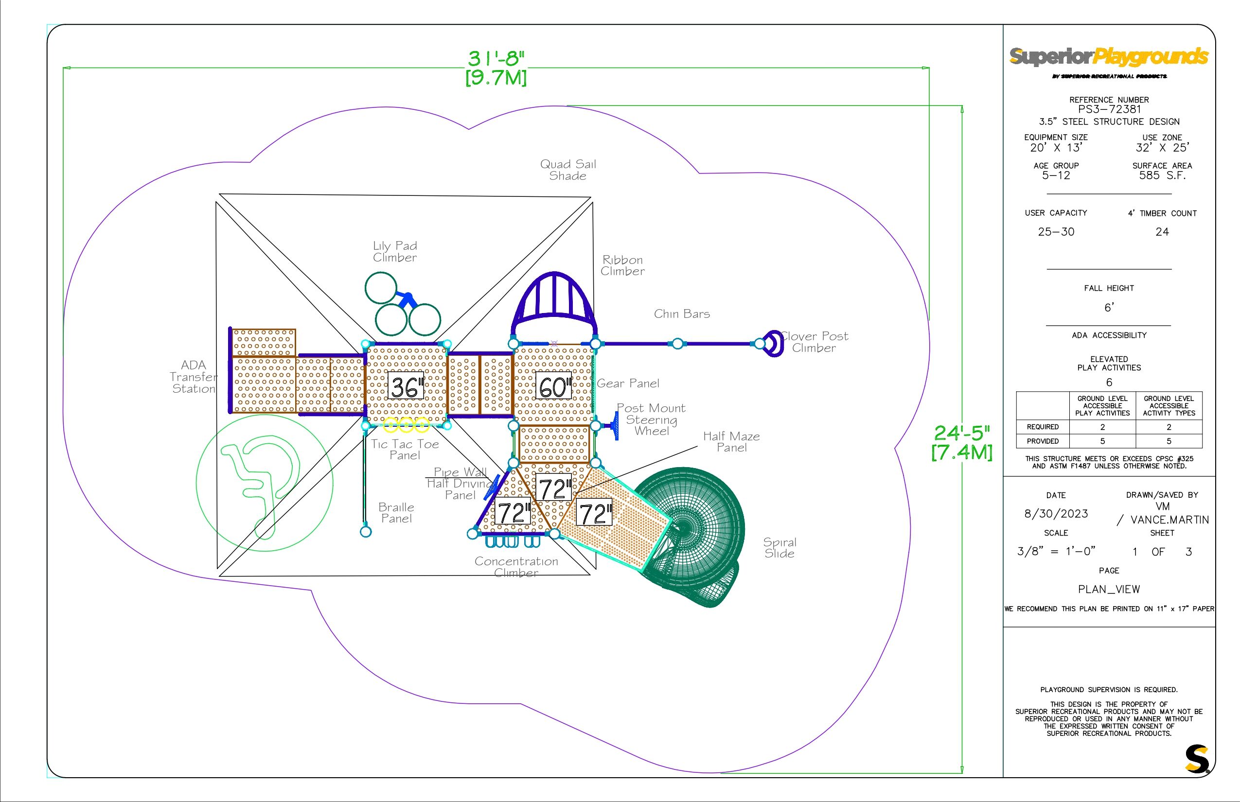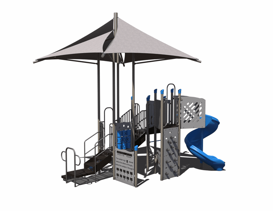 The PS3-723811 is an outdoor play structure designed for commercial use. This durable playground is designed for children ages 5-12. It features a spiral slide, modular shade, and several climbers!
