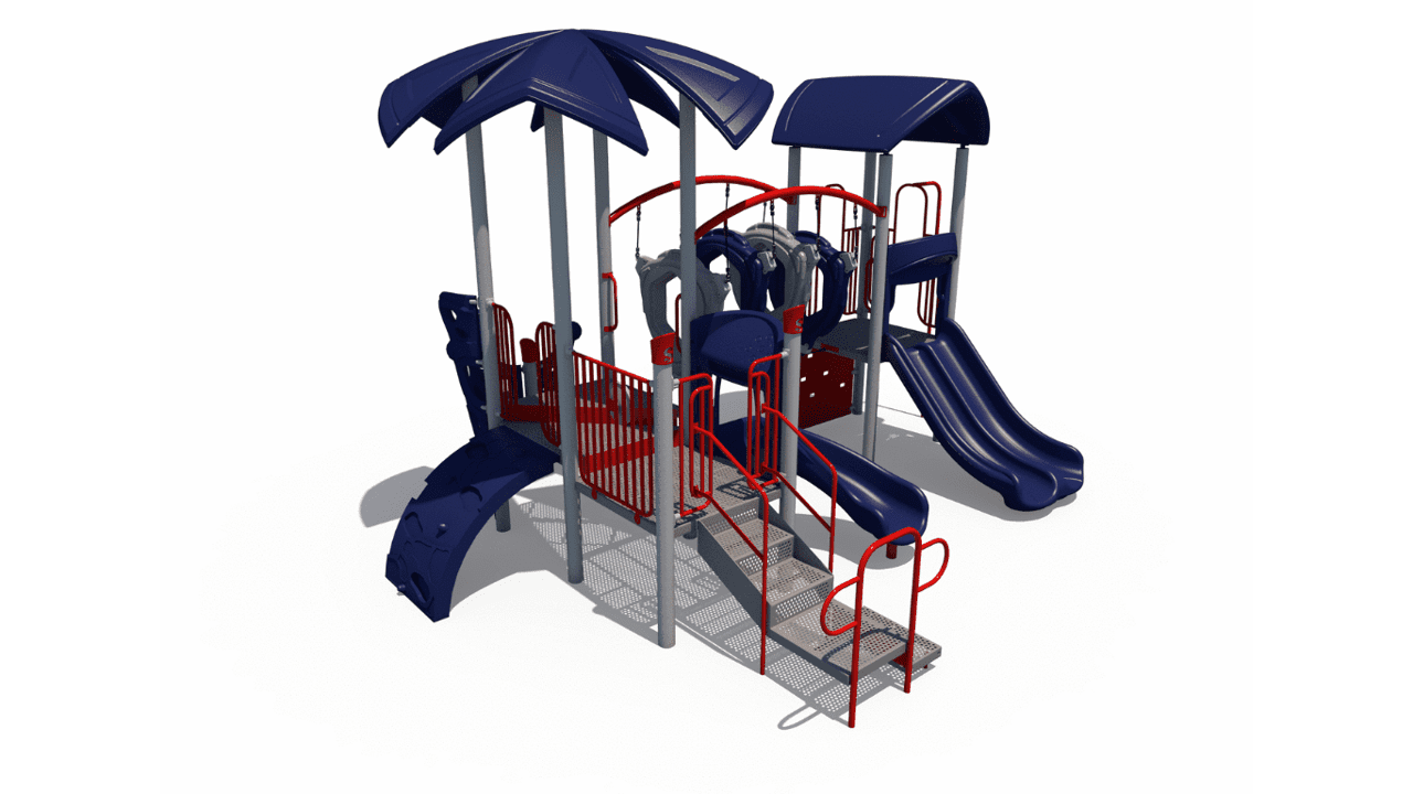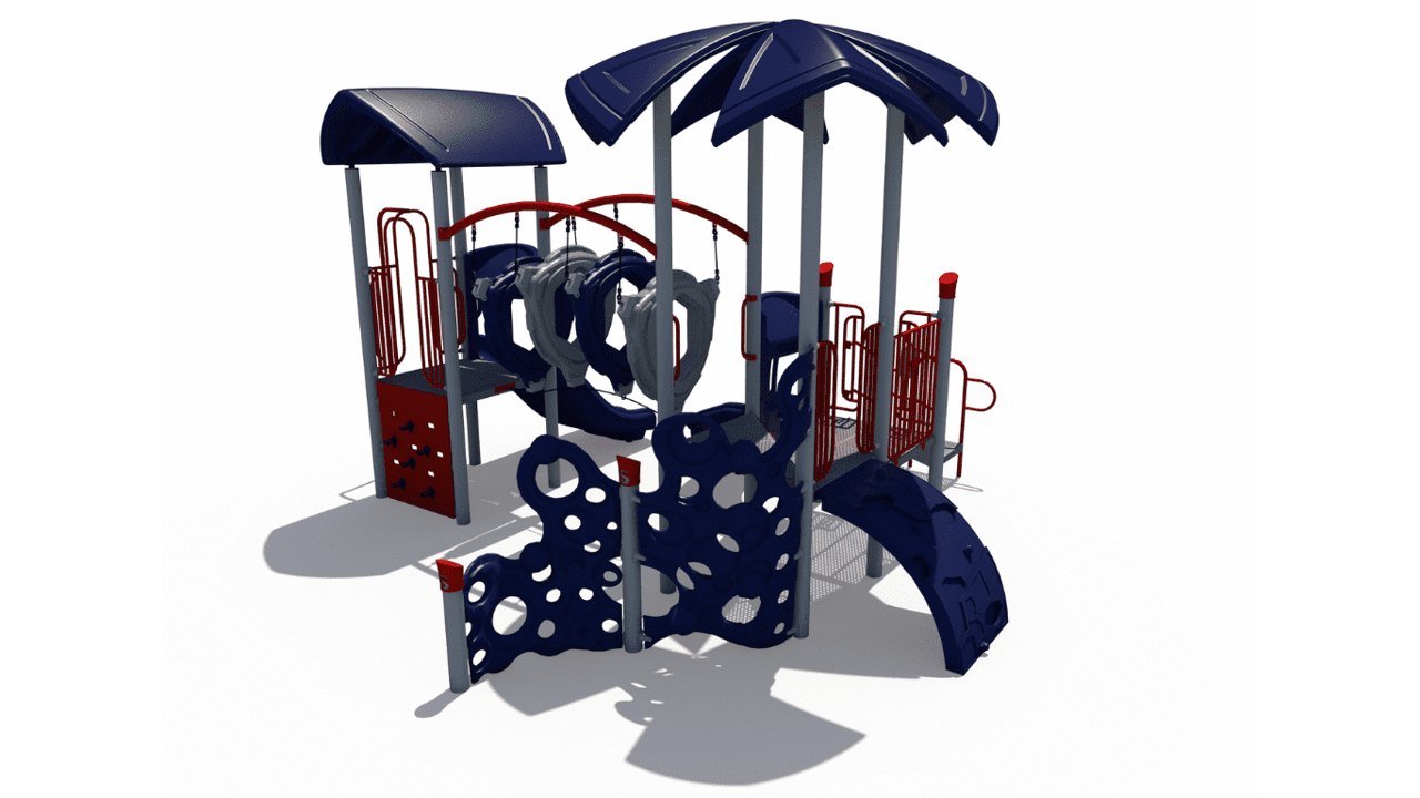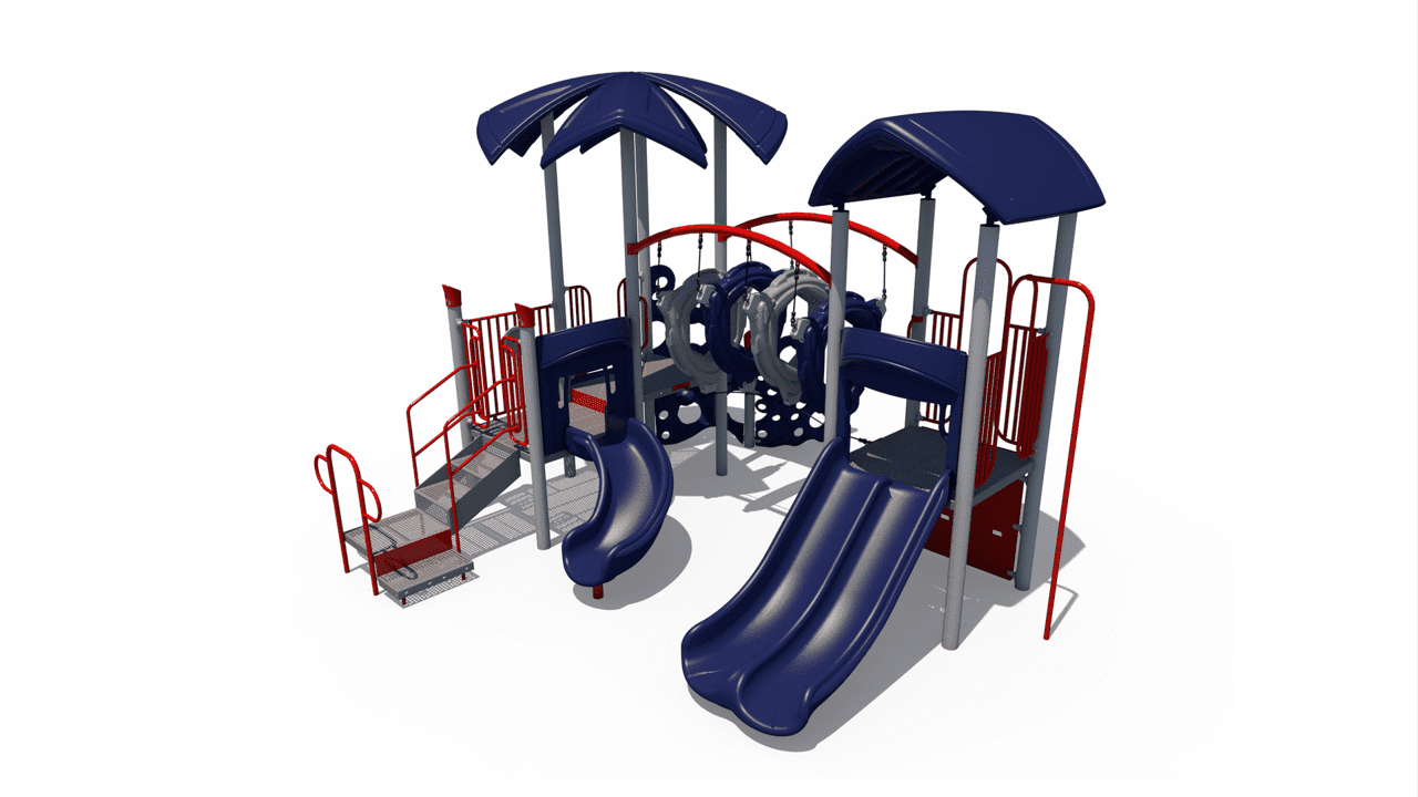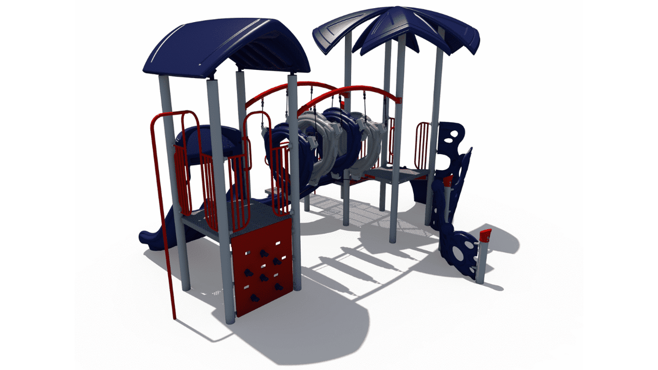 Upholding a sleek and modern look, this commercial playground structure will have children using every muscle in their body. As an alternative to basic playground steps, the delta arch bridge provides children a unique climbing challenge and invites children to work together in order to navigate their way through this structure. The double chute slide and the 90-degree curve slide will surely put a smile on a child’s face! Additionally, this structure comes with a sliding pole for them to move, in a unique and fun way, from the decking back down to the ground. The 22 feet by 20 feet structure has a required use zone of 34 feet by 32 feet and has a capacity to fit 38 children between the ages of 5 and 12.